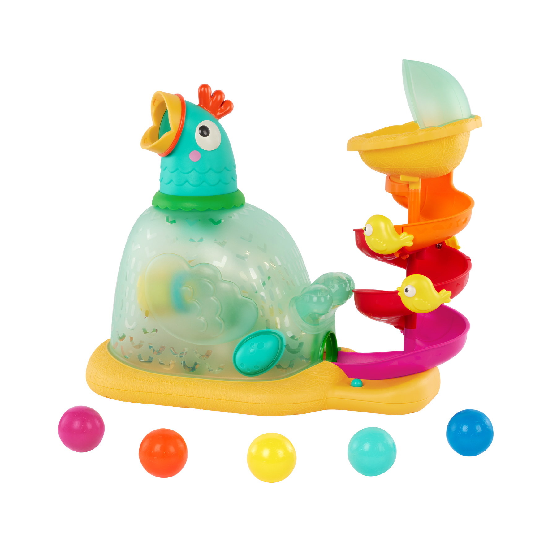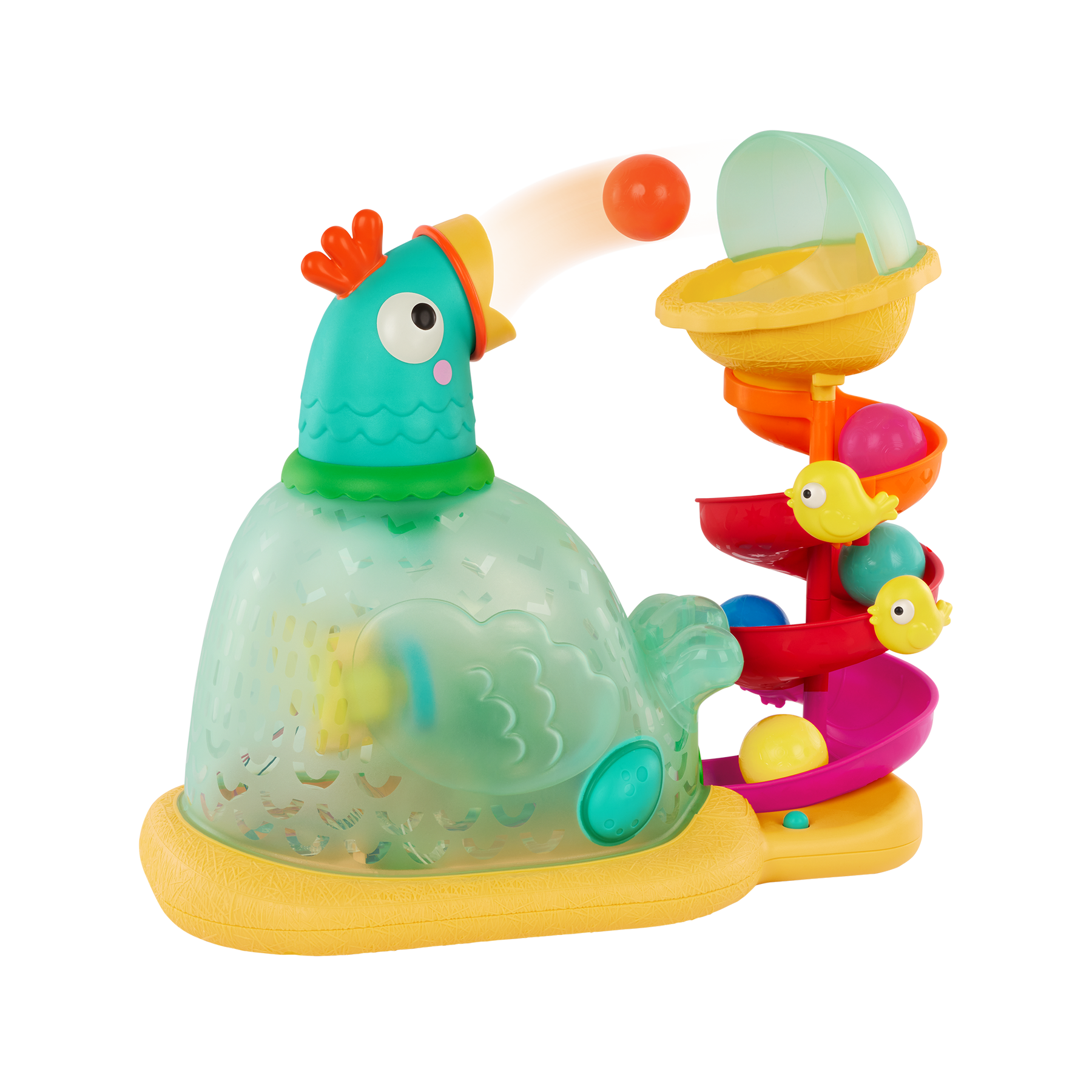 This ball popper toy adds egg-citement to playtime with its fun design, colorful lights, silly sounds, and ball popping action. All little ones need to do is press the egg button to activate the toy, then drop a ball into the spiral. Watch the ball roll down the slide, then pop out the chicken’s mouth! Kids can also turn the chicken’s head so the balls pop around the room. Can you find them all once they’ve scattered? Let’s get active! Have fun with 5 brightly-colored balls, 3 barnyard tunes, and a light show – all featured in this one-of-a-kind kids’ toy. Batteries included! The Pop-A-Doodle-Do inspires active play, develops motor skills, and introduces kids to the concept of cause-and-effect.
