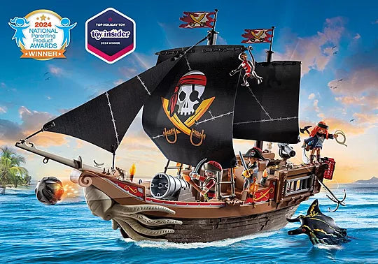 Embark on thrilling sea adventures with the PLAYMOBIL Large Pirate Ship! This floating playset is equipped with swivelling cannons, a functional anchor cannon, and a pirate crew ready for action. Battle sea monsters and enemy pirates as you navigate the open waters. With plenty of space for figures and movable sails, this PLAYMOBIL pirate ship is perfect for kids aged 4 and up who love imaginative play and exciting pirate tales.
