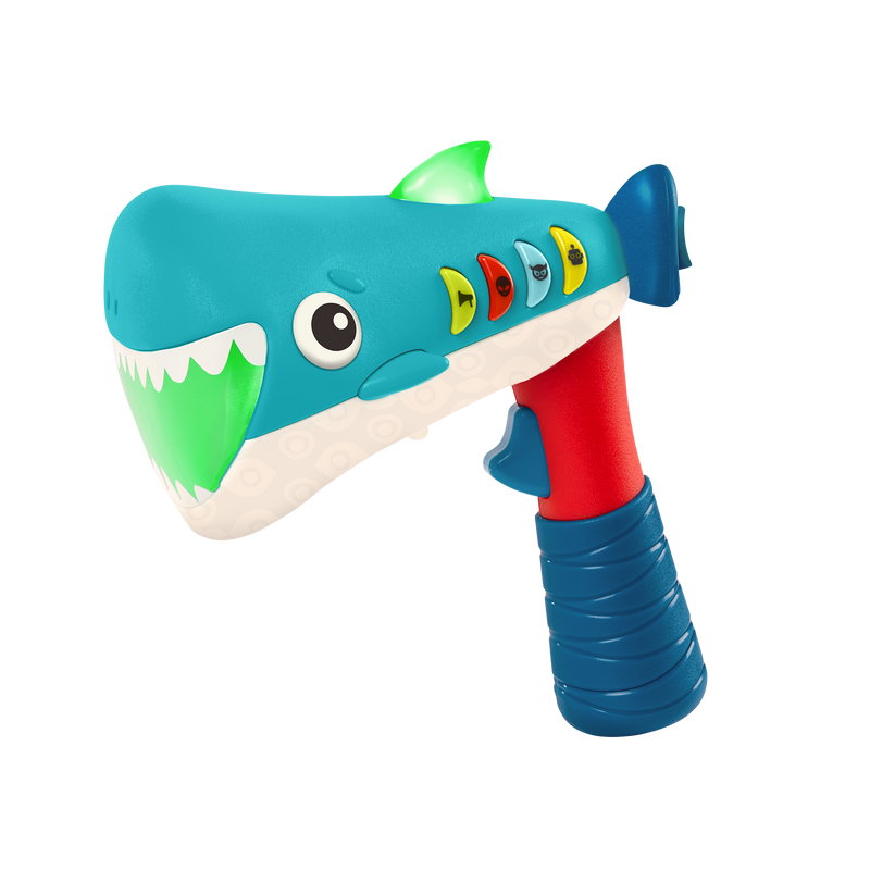 Turn up the fun and get whacky with the Silly Speaker from B. toys! This handheld voice changer toy packs a lot into a small package. Kids can transform their voice into a Robot, Monster, or Alien with the click of button—or get a lil' loud with the Megaphone setting! But that's not all. Click the Monster, Alien, and Robot buttons again to change the pitch for a total 7 exciting voice-changing combinations! Once kids pick their character they hold down the trigger and speak into the megaphone, and playtime gets a silly boost. This voice-changing megaphone is great for pretend play, puppet theaters, screen-free car rides, or just being silly! Did we mention it lights up? That's right, the lil' shark fin and mouth glow as kids act out their imaginary masterpieces. 3 AAA batteries are required and included. Recommended for children 5 years old and over.