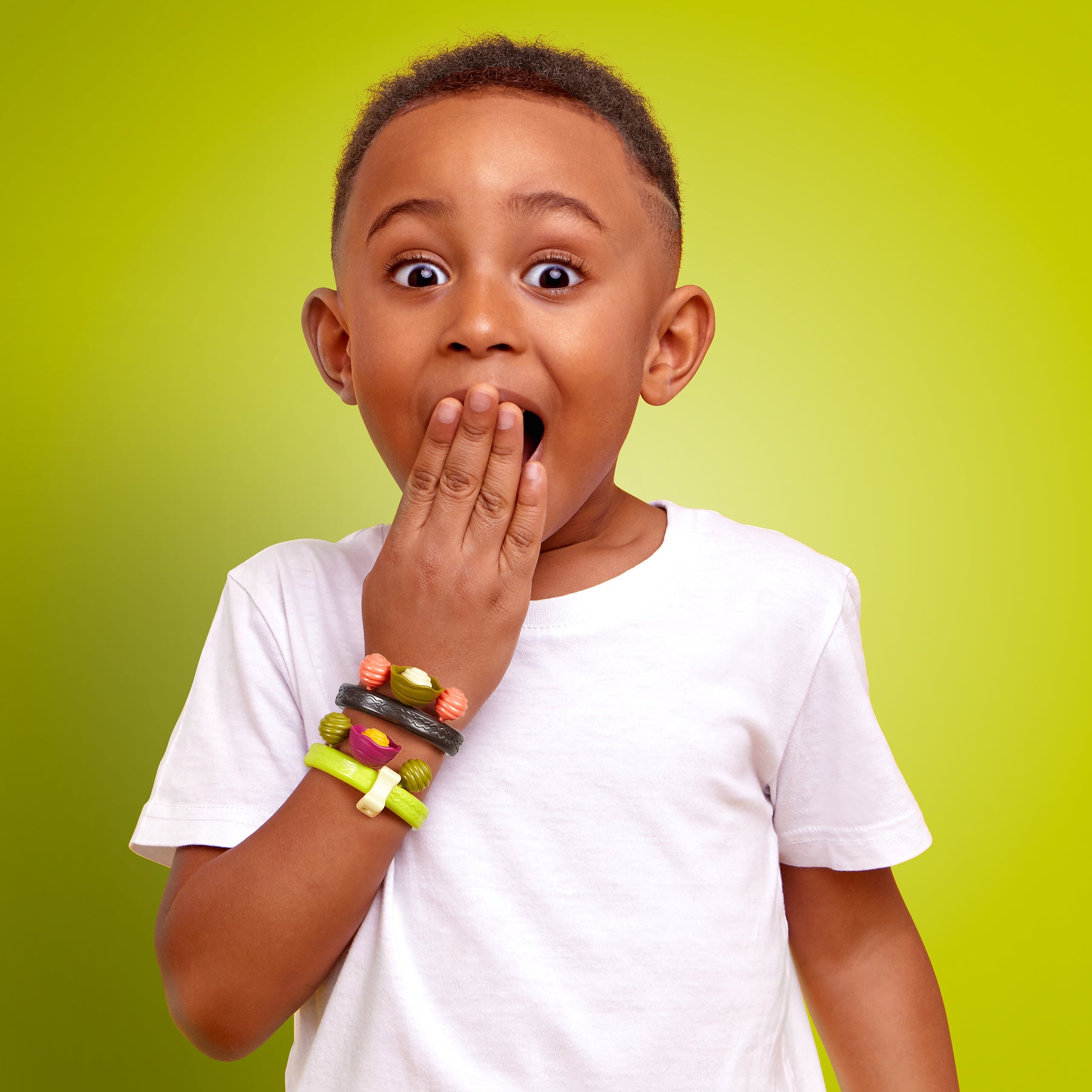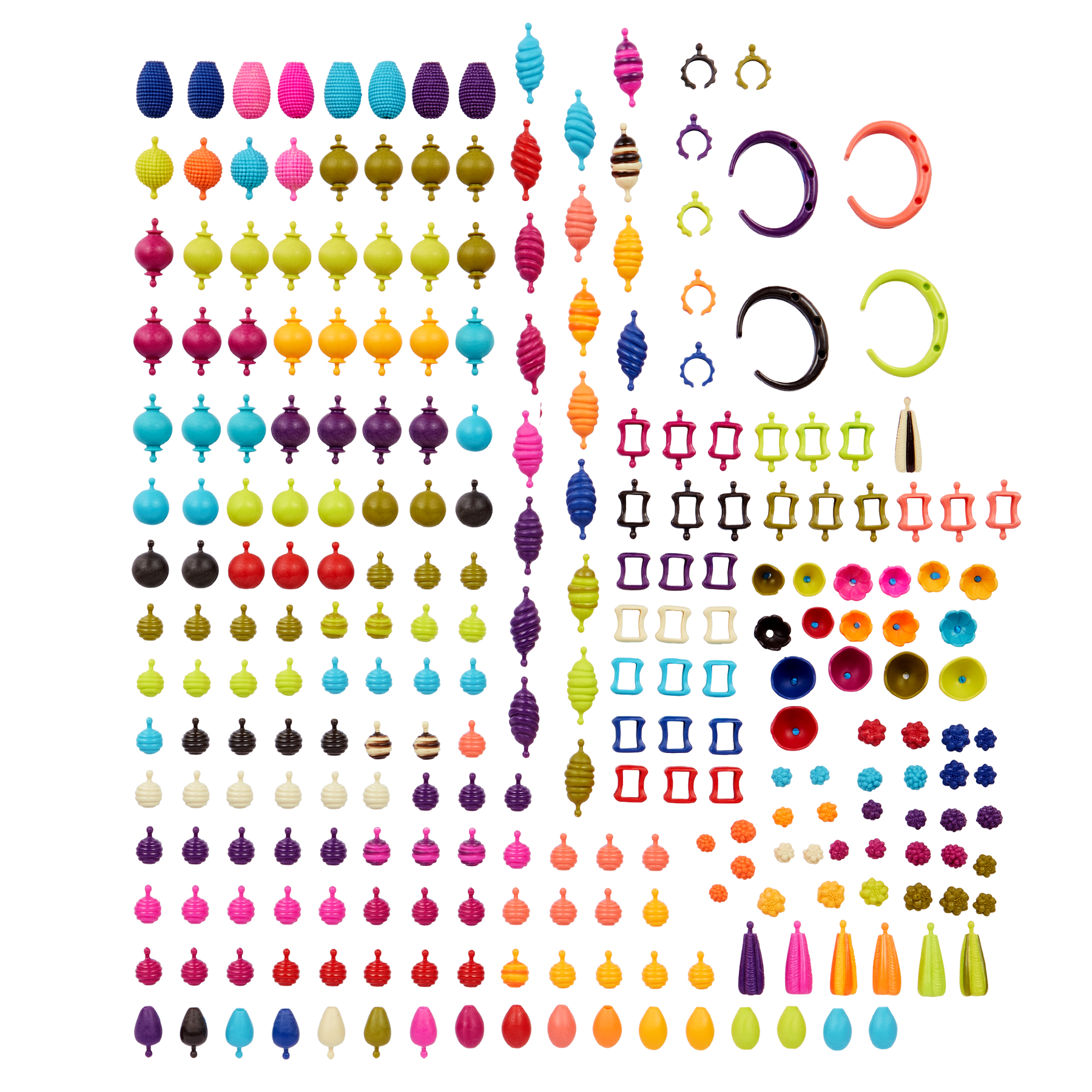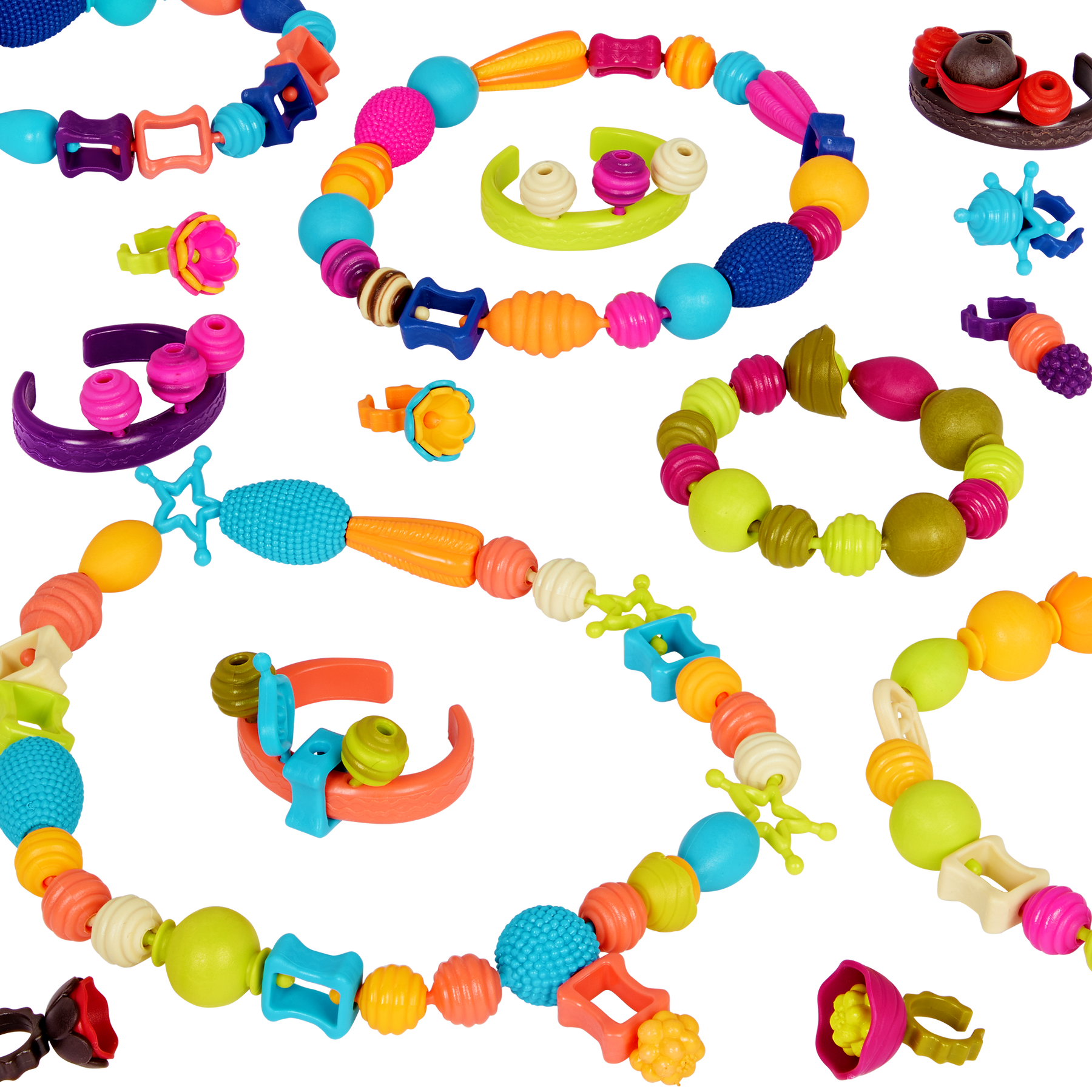 Pop! Pop! Pop! Just try and stop! The B.eauty Pops jewelry making set from B. toys comes with 275 pieces that feature a variety of colors, shapes, and textures. Mix and match to create a ton of B.eautiful necklaces, bracelets, and rings – the combinations are endless! All of the reusable beads snap together simply, quickly, and safely. Your little jewelry maker can spend hours designing unique pieces for the whole family, then pop 'em apart and start all over again. Not to mention, cleaning up and traveling is hassle-free – just store all of the beads in the handy jar and carry it with the help of the handle. And because we at B. keep the environment in mind, parents will also be happy to know that our packaging is 100% recyclable.