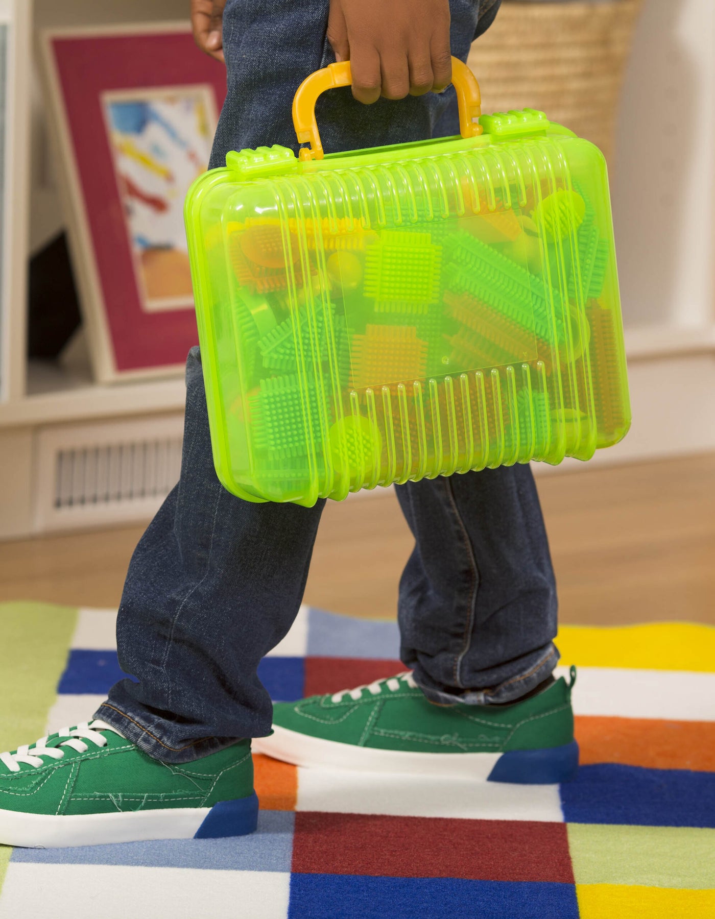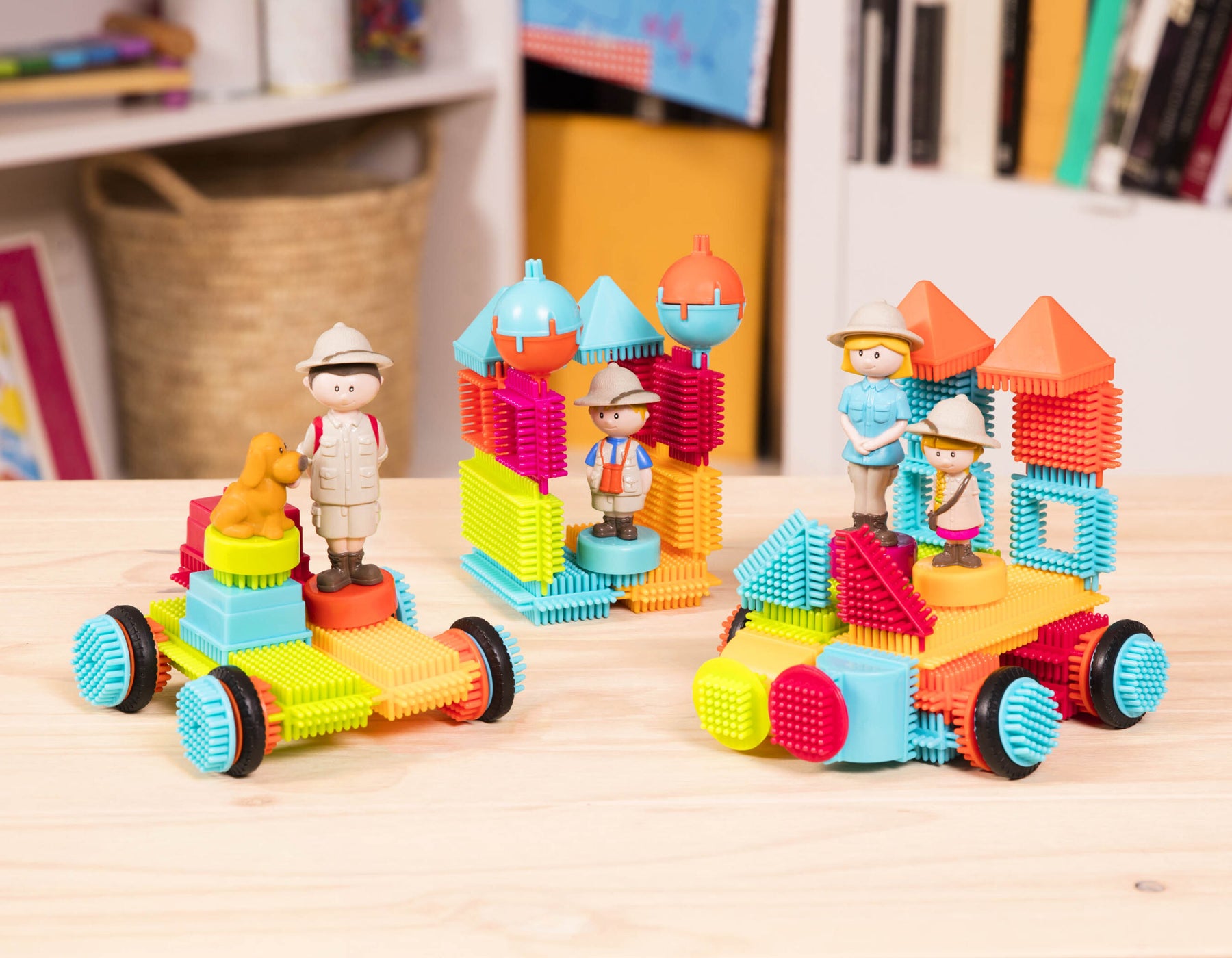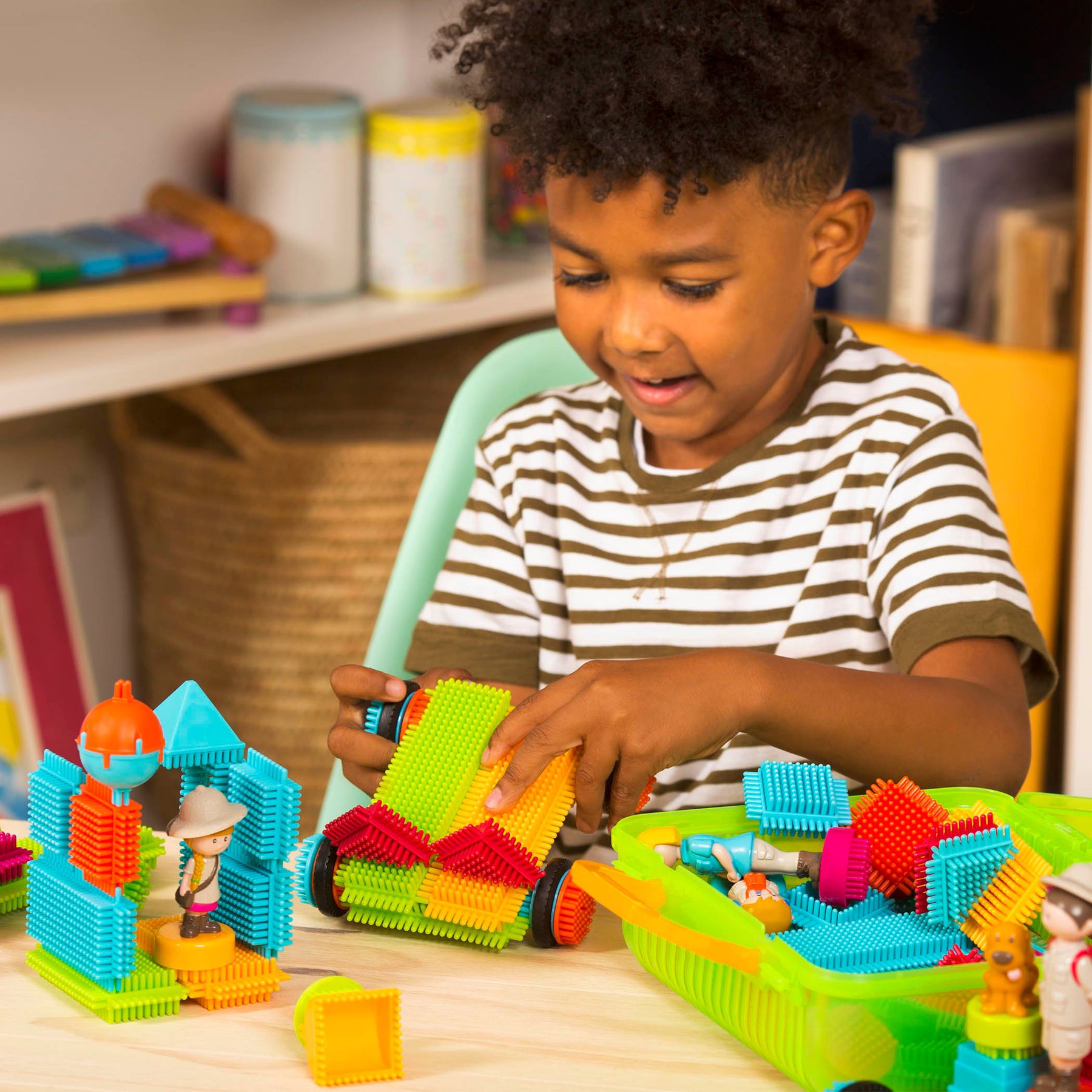 Get ready for tons of building fun with the Safari Adventure Carrying Case from Bristle Blocks! This set of Bristle Blocks comes with 85 pieces, including toy characters and a little dog. The chunky blocks are easy to grab and fit perfectly in a toddler’s hand, while the funky design inspires older kids to create their own elaborate masterpieces. Have little ones use their imaginations to build and re-build vroomin’ vehicles and creative structures. Bristle Blocks are also great tools for developing fine motor skills! When it’s time to tidy up, just put all the pieces back in the convenient case!