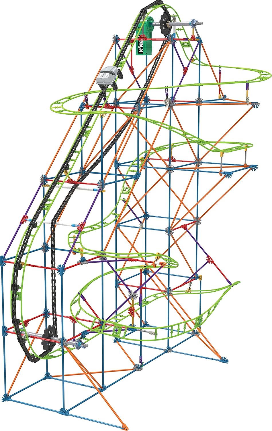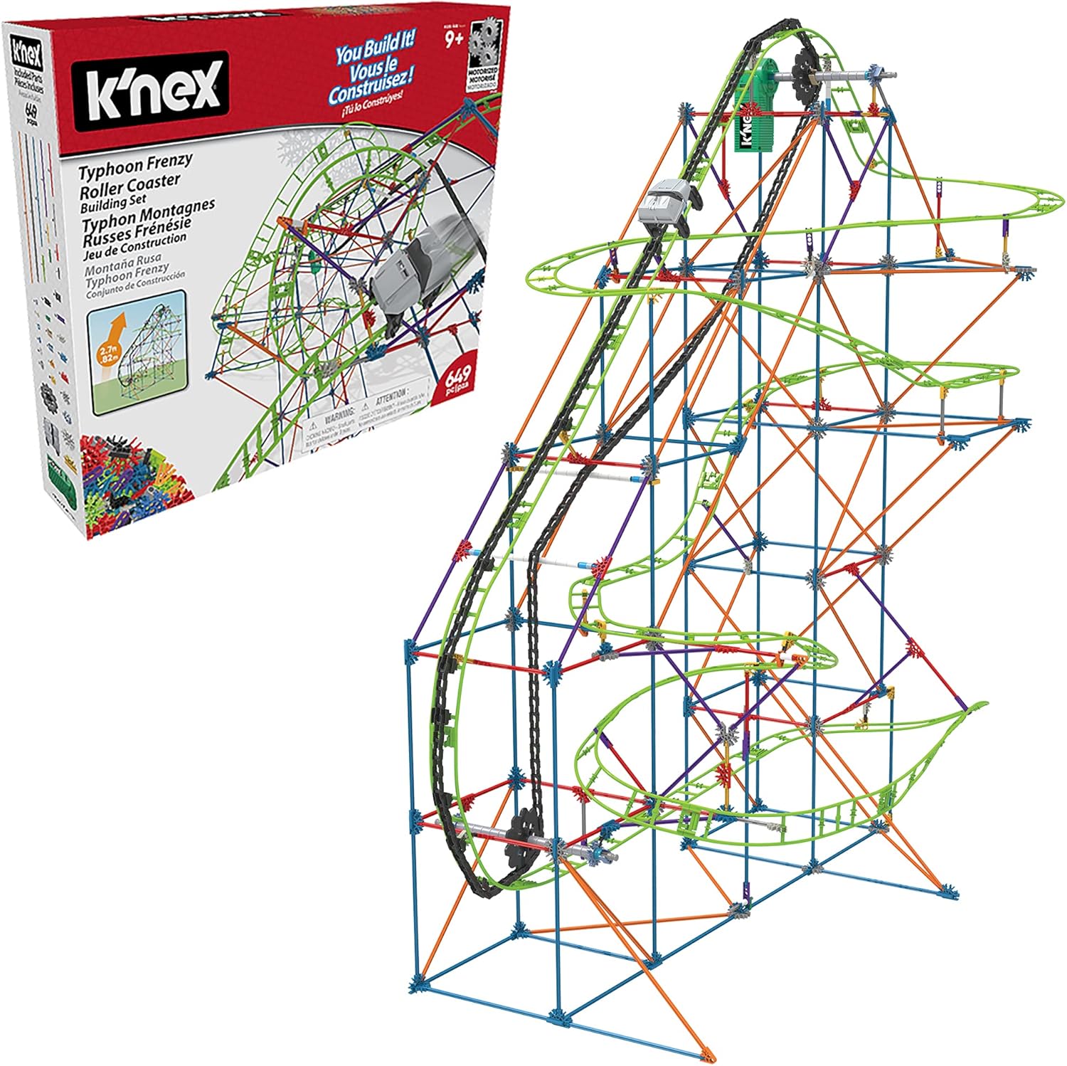 Bring a wave of fun from the ocean to your living room with the new Typhoon Frenzy Roller Coaster Building Set from K'NEX! Build with over 640 K'NEX parts & pieces like rods, connectors and track and add motorized power to send the silver coaster car twisting and turning through over 19 feet of swirling, non-stop action! Plus, download exclusive instructions to build an incredible second model, the Tsunami Surge Coaster!
