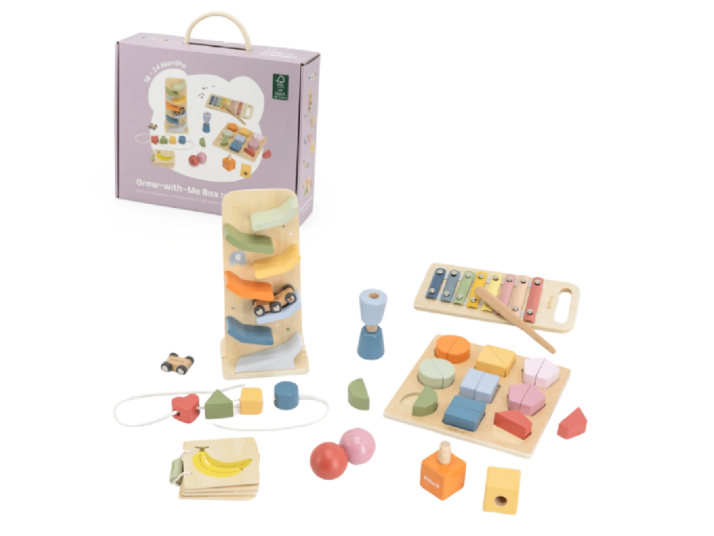 The grow with me colour crafters box offers new challenges in rhythm, finger dexterity, colour and shape sorting and cause and effect, as well as early introduction to physics.