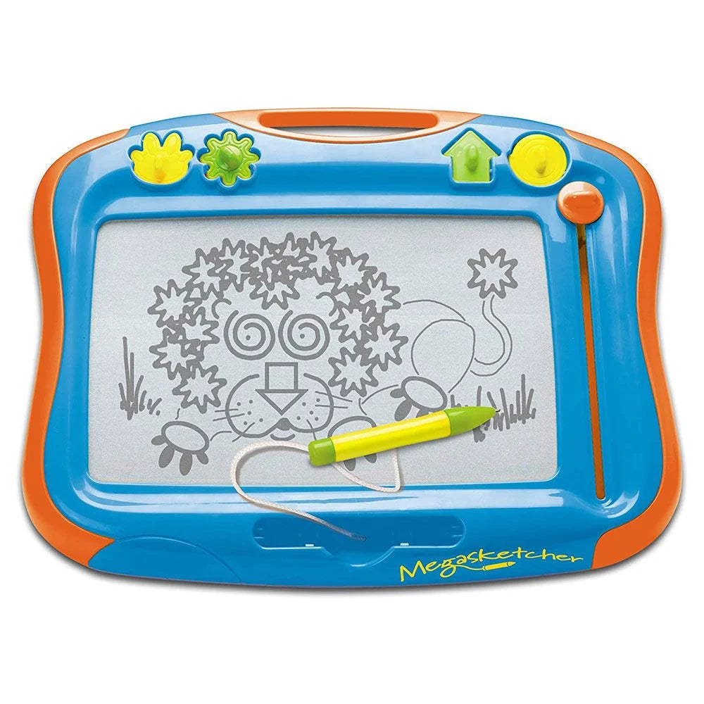 The magnetic Megasketcher drawing board has a unique special screen that allows budding artists to draw clear, crisp pictures. The pictures magically disappear with one sweep of the eraser ready to start again. There is a pen to draws with and four shape stampers are also included