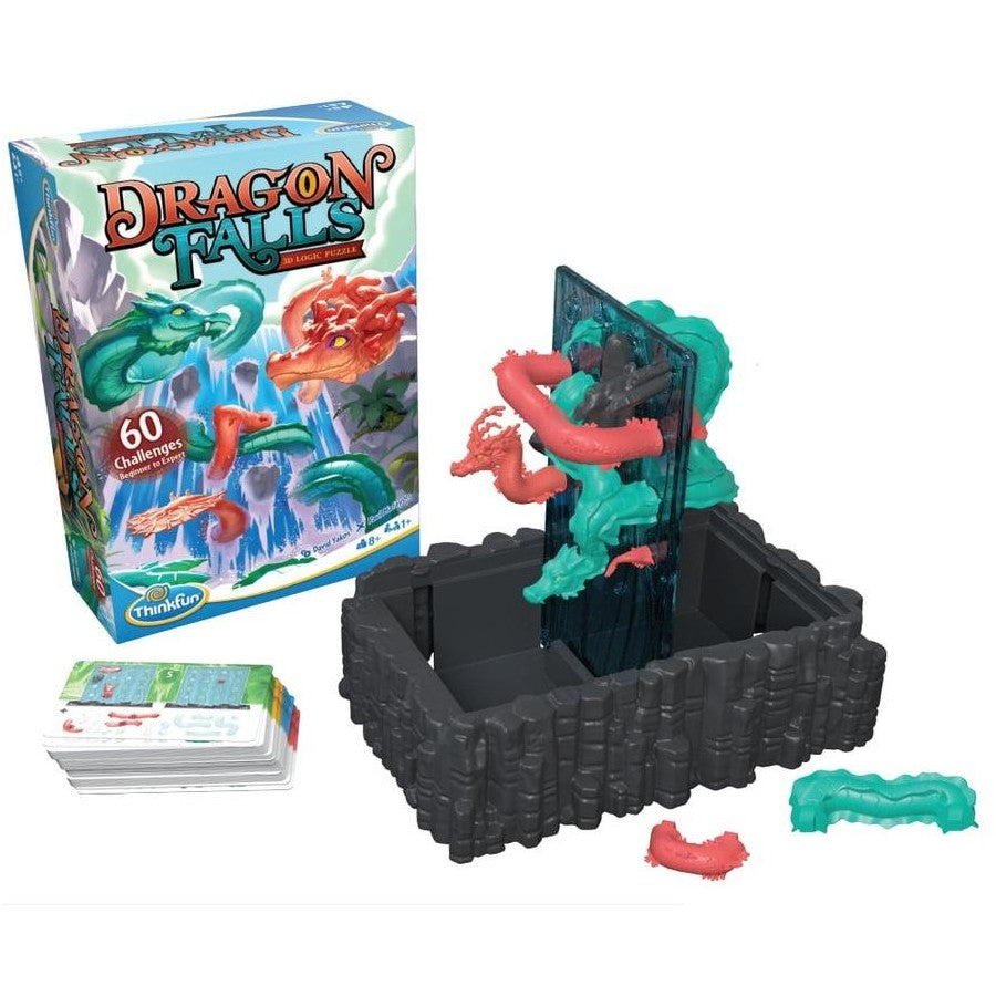 Water Dragons are legendary sea serpents known to soar together back-and-forth through powerful, crashing waterfalls. In Water Dragons, players bring this mythical scene to life! Start by choosing 1 of the 60 beginner-to-expert level Challenge Cards and place Dragon Segments and Blockers on the vertical, double-sided Game Grid as shown. Your goal is to place the remaining Dragon Segments to complete the bodies for both the sleek Teal Dragon and the rugged Coral Dragon. Their serpentine bodies will intertwine through the waterfall and around the jutting rocks in clever ways, putting your spatial reasoning skills to a legendary test!