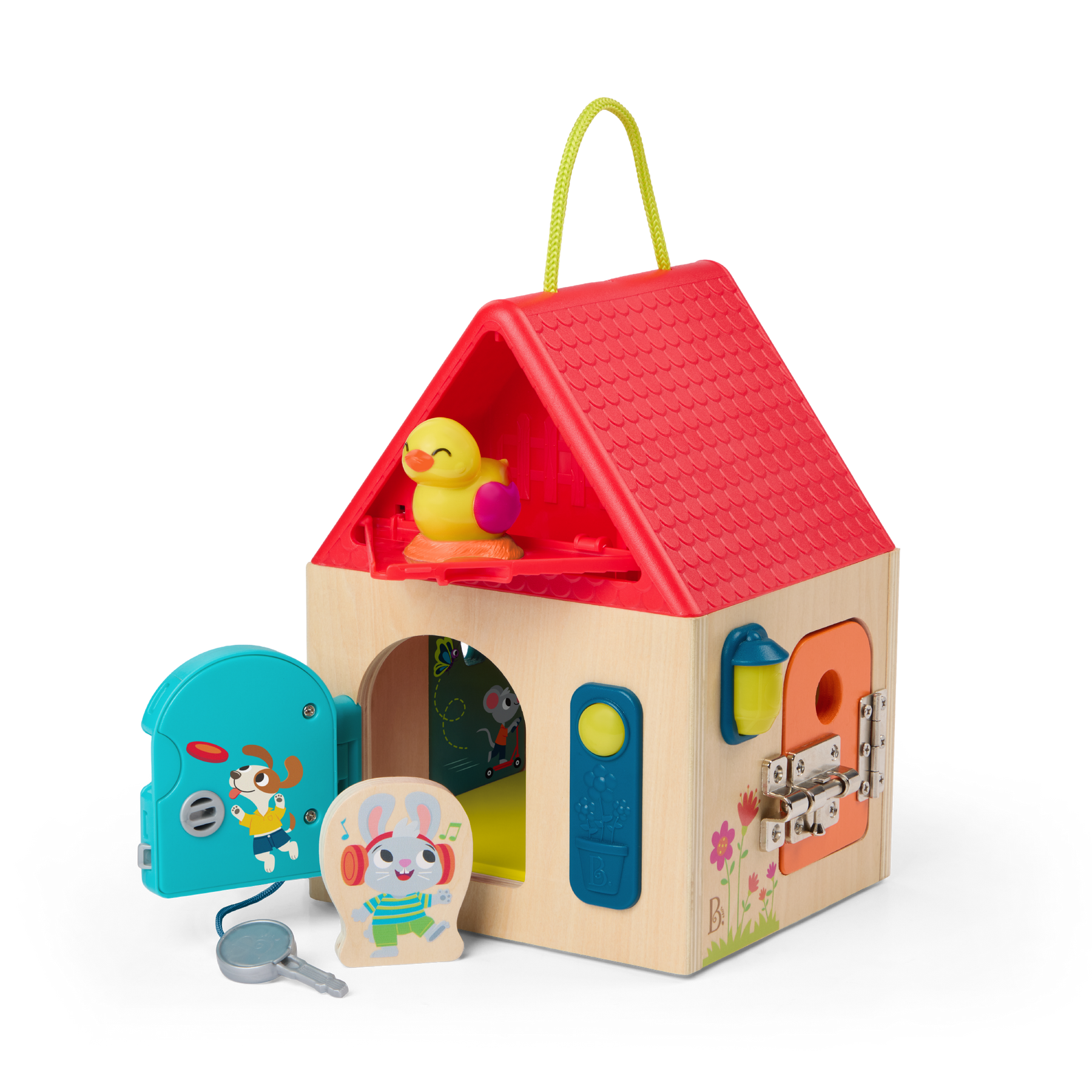 Discover more behind every door with the Unlock & Learn Box from B. toys! This sturdy wooden lock box toy is also a friendly neighborhood house with lots of nooks and crannies to explore. Start with the two hardware latches, one bar and one chain, and peek inside the house to meet a friendly bunny. Don't forget to ring the bell! Kids can also turn on the porch light before moving on. Ok, ok, now it's time for the keys. Unlock the doors with the two keys and turn 'em to get inside – kids will discover a rotating weather carousel on the garage and a fun illustration inside the door! Next up is the windows. Pop 'em open to find a lil' cuckoo bird and other surprises! This dexterity lock box is great for improving kids' problem-solving skills and improving fine motor function. Batteries (2xAAA) are required and included.
