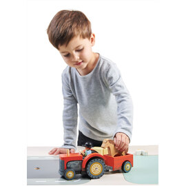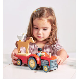 A bright and playful farmyard tractor with a removable trailer. Also features a driver, two hay bales, a horse and a goose. Made from wood and painted in bright red with illustrated details.