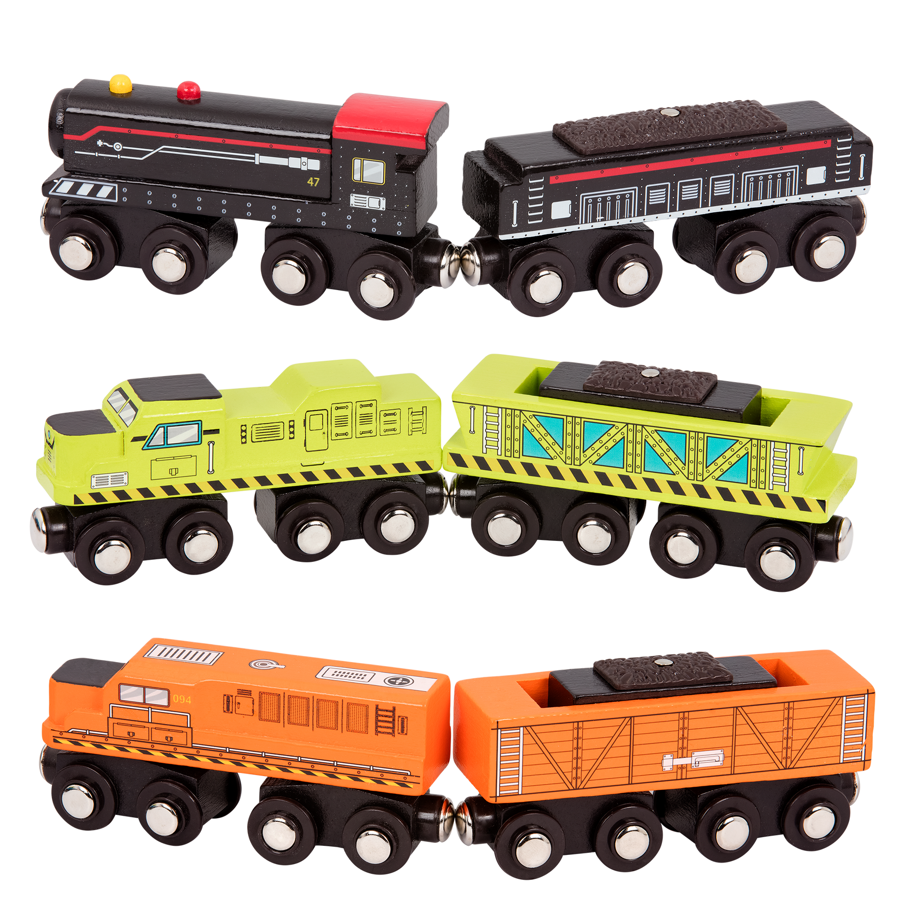 These wooden trains are delivering a ton of fun, right to your playroom. Full steam ahead! Detailed and durable, these classic wooden trains will never go out of style. The 3 locomotives and 3 freight cars connect by magnet – as your kiddo matches them up they’ll be developing their fine motor skills and hand-eye coordination! They can even link them all together to create one super long train to pull around the living room. These timeless toys are great for sparking imaginative pretend play – what will your little one deliver on these toy freight trains? Maybe they’ll carry building materials to make-believe construction sites, or fresh fruits and vegetables to supply their imaginary grocery stores! Adventure awaits! All Battat toys meet or exceed EU, U.S. and Canadian safety standards.