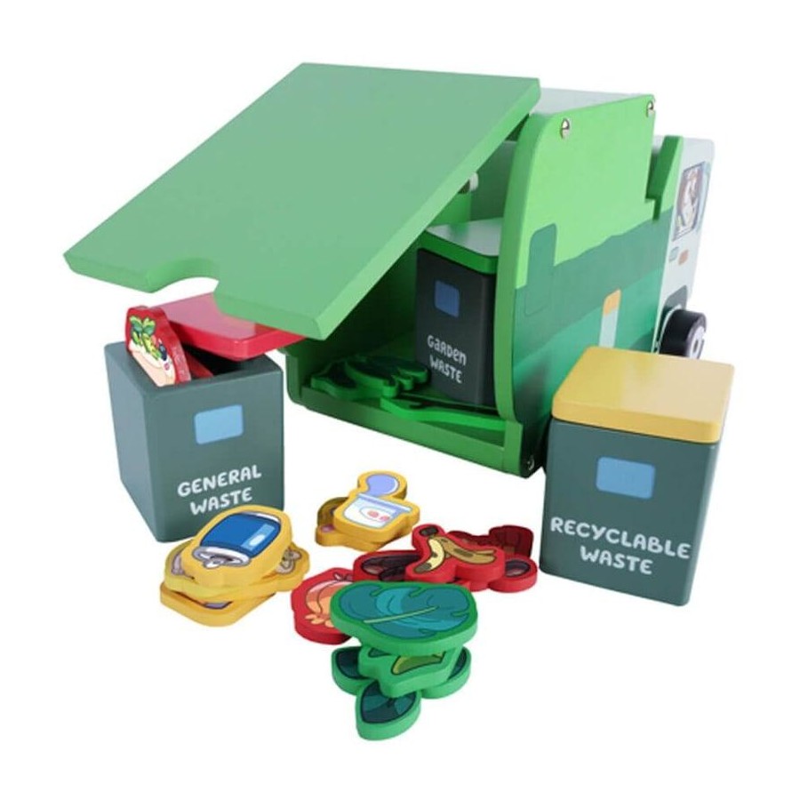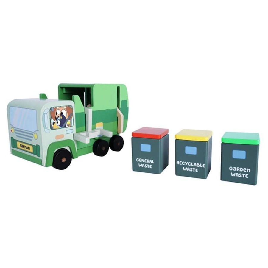 It's Bin Night for Bluey's home! Let's hit the roads with Bluey and the Bin Man to collect waste with his Wooden Garbage Truck Set. Guided by colour, organise your waste into the correct bins; drive the Garbage Truck towards to the bins then use the lifting arm on the side of the tuck to empty your bins into the back! Easy storage as everything fits inside the back of the truck.