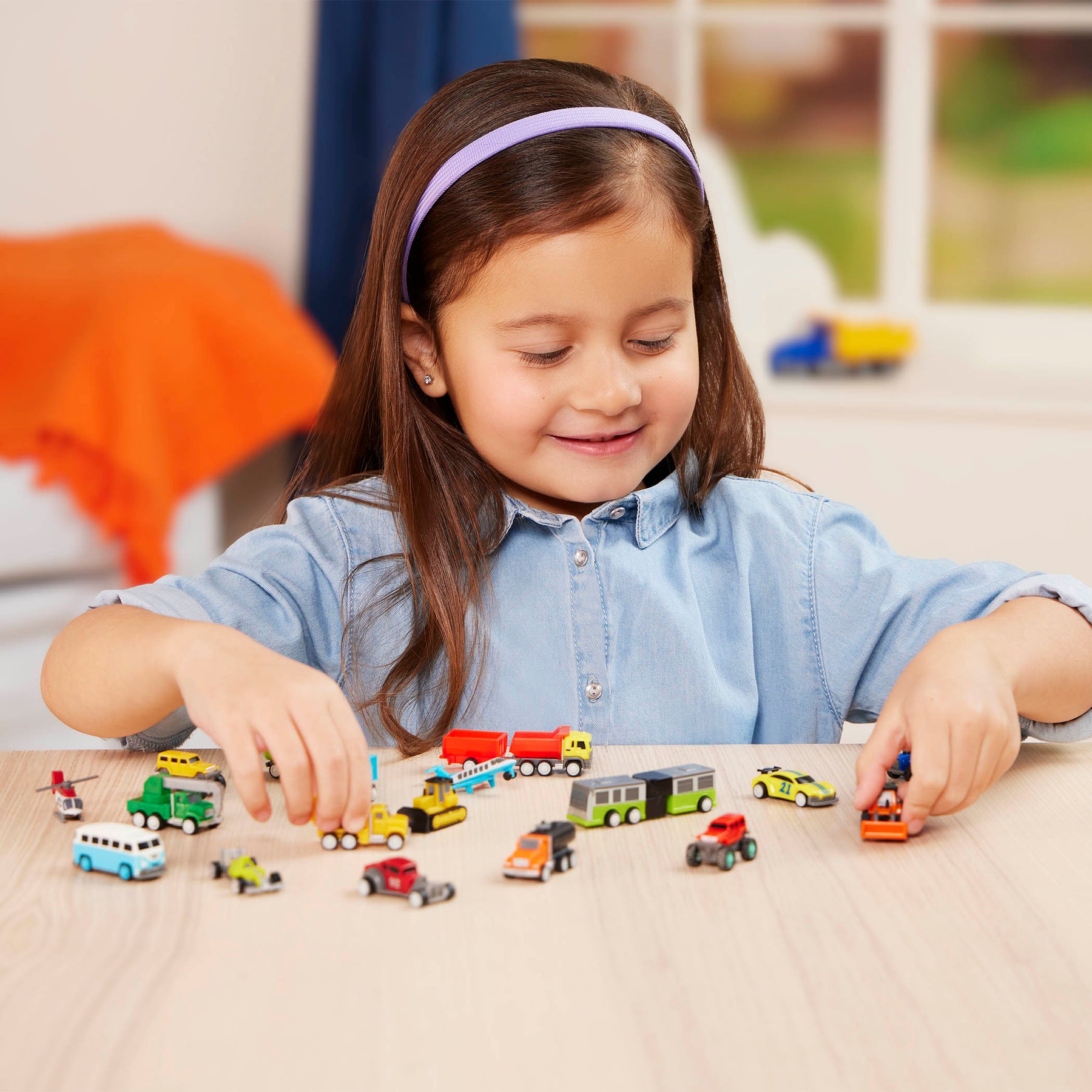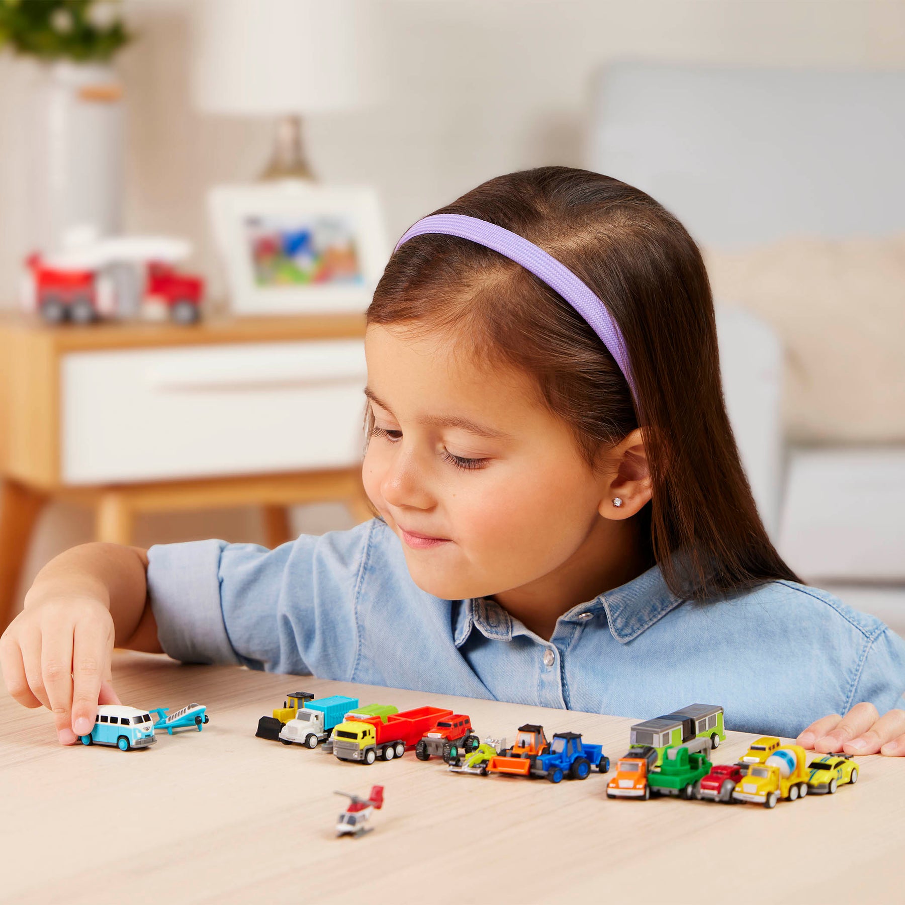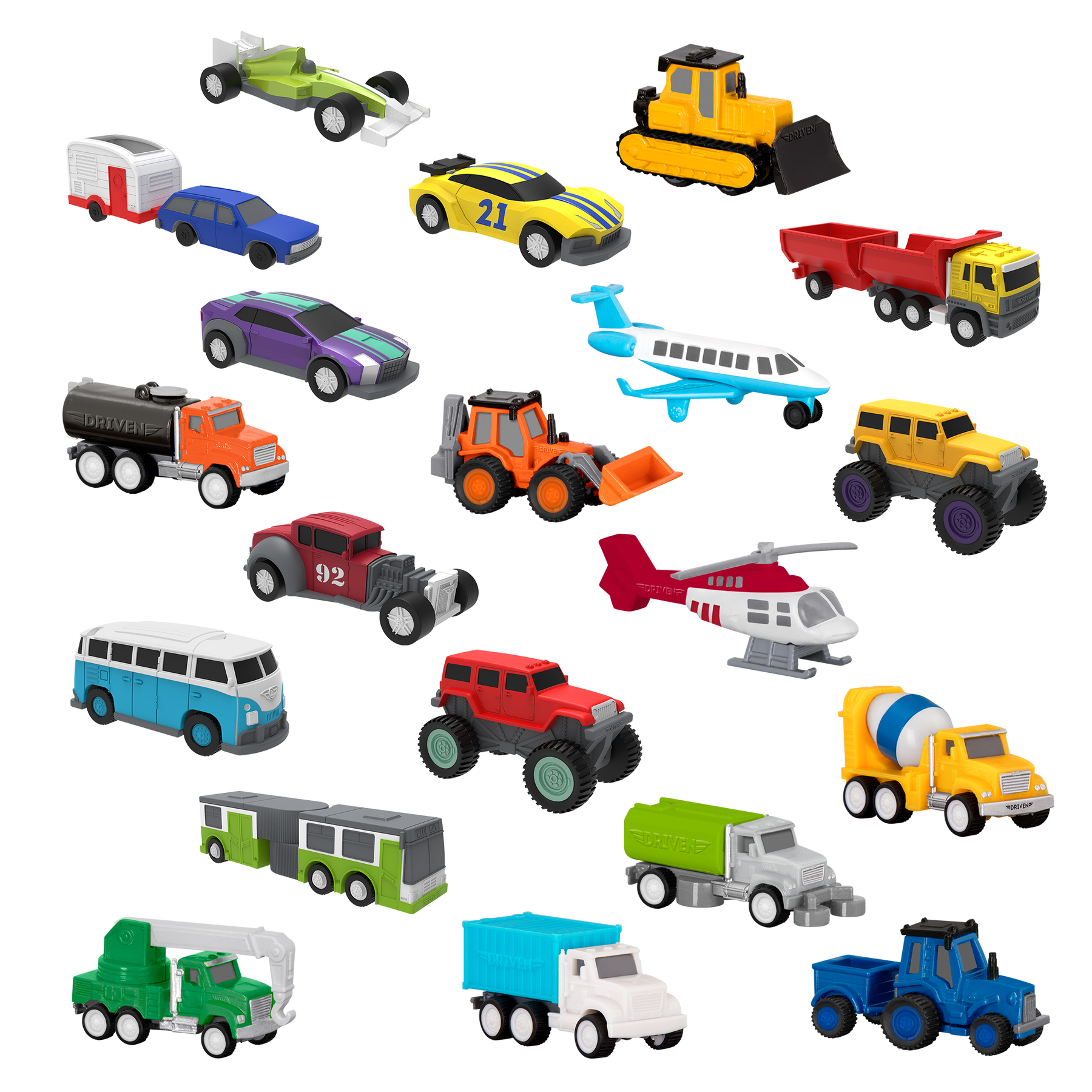 Go on an adventure with the Pocket Fleet 1 from DRIVEN by Battat! This playset comes with 20 realistic toy vehicles for an imaginative playtime. Big day at the construction site? The bulldozer, dump truck, cement mixer, and steam roller can help you get the job done right. This toy vehicle set also includes a helicopter, police SUV, school bus, container truck, ambulance, and fire truck for tons of pretend play opportunities. What are you waiting for? Let’s get to work! Stay DRIVEN, because the crew depends on you!