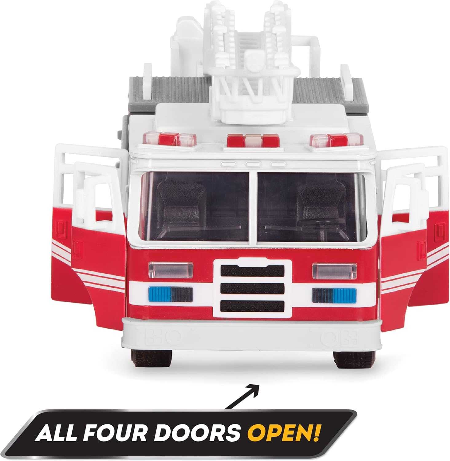 - All 4 toy fire engine doors open, detachable ladder on the side, extending support legs