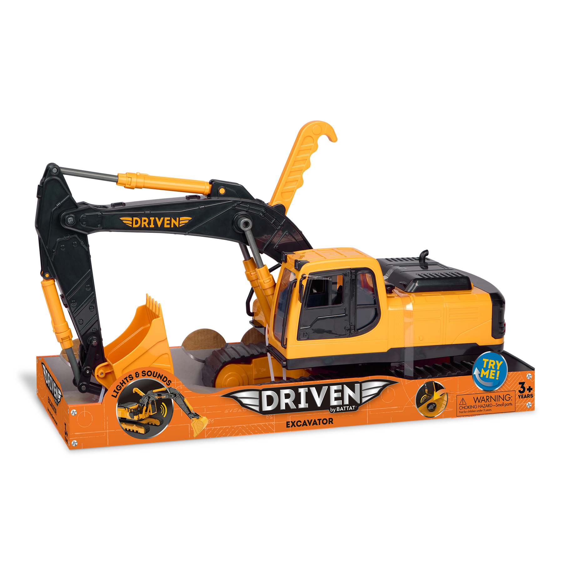 Dig deep—there’s work to do! DRIVEN’s Large Excavator is ready to rule the construction site! Use the sturdy excavator arm and bucket to scoop, lift, and haul dirt or sand like a pro. The rugged tracks roll smoothly over any terrain, and the rotating body lets little builders get the perfect angle for every scoop. Swing open the cab door to check out the operator’s seat, then fire up the realistic engine sounds for that true construction site feel. This digger toy is loaded with hard-hat-worthy details and movable parts, down to the engine-shaped battery cover. Perfect for indoor or outdoor play, the Large Excavator toy construction truck by DRIVEN by Battat is built for big-time imagination. Stay DRIVEN, because the crew depends on you!