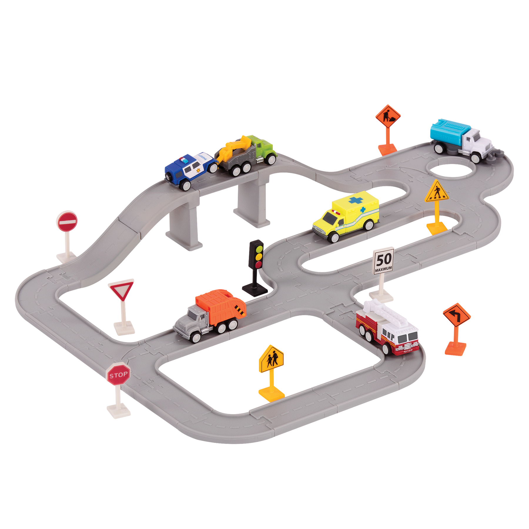 • 57-Piece Set: Comes with 42 easy-to-connect tracks, 6 vehicles, and 9 road signs.