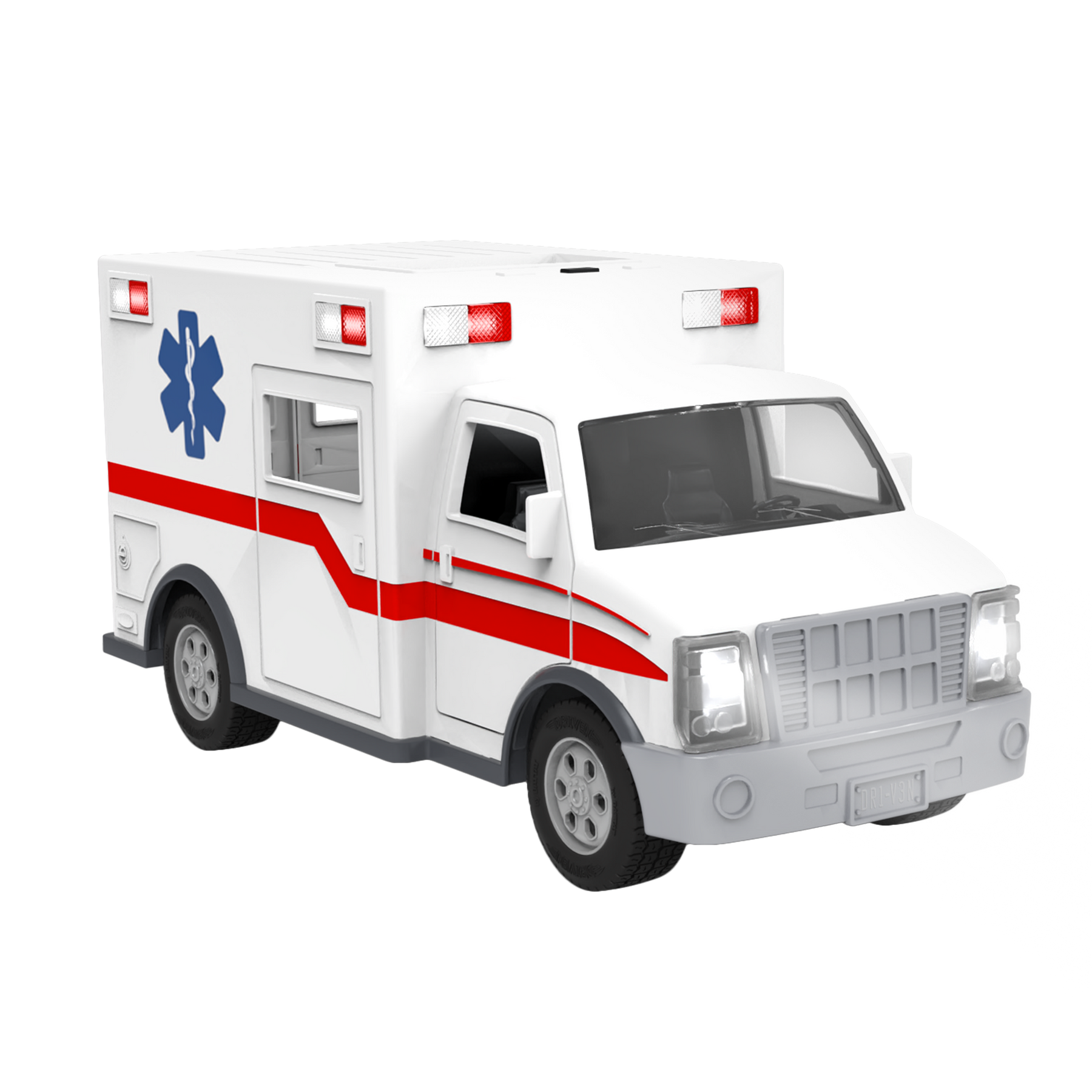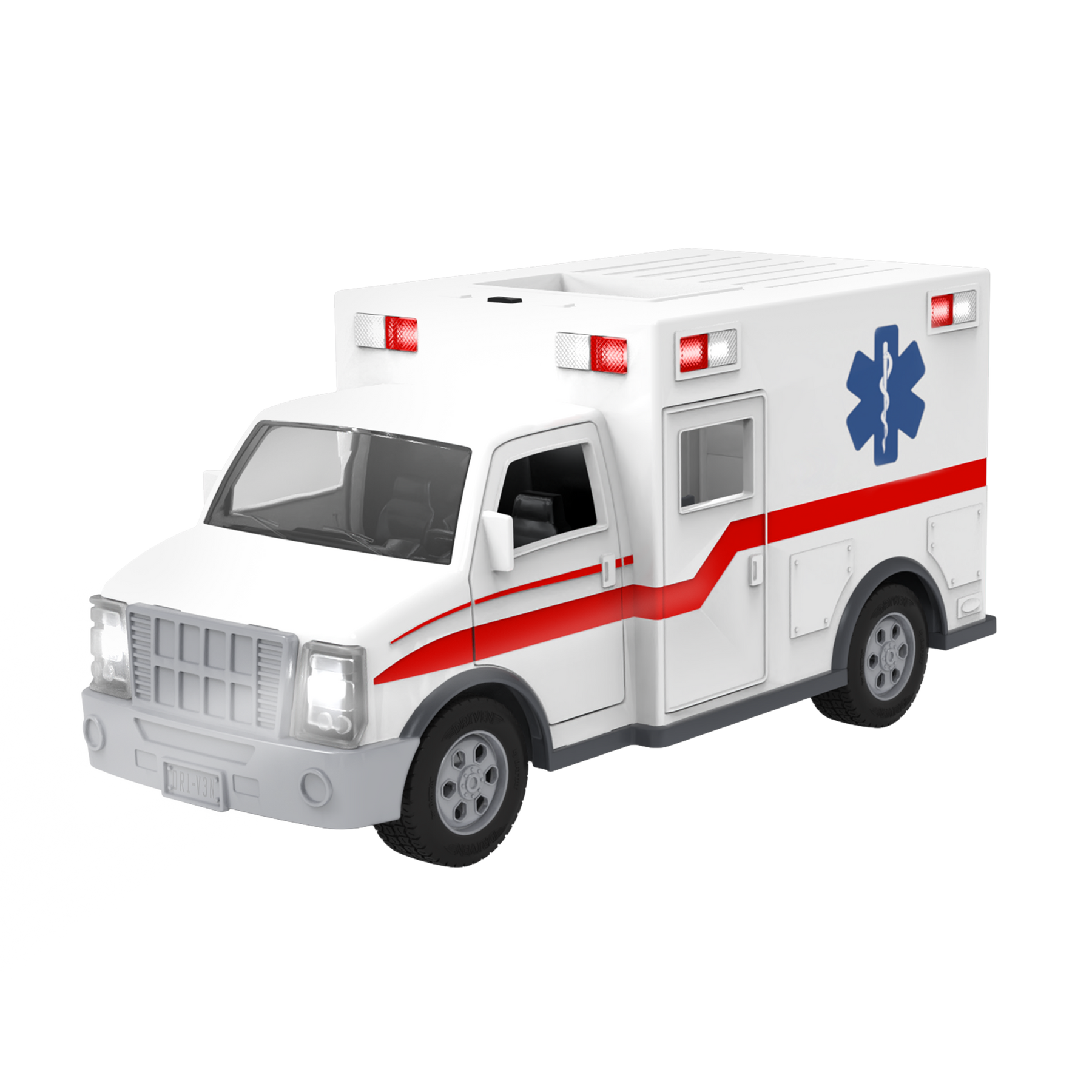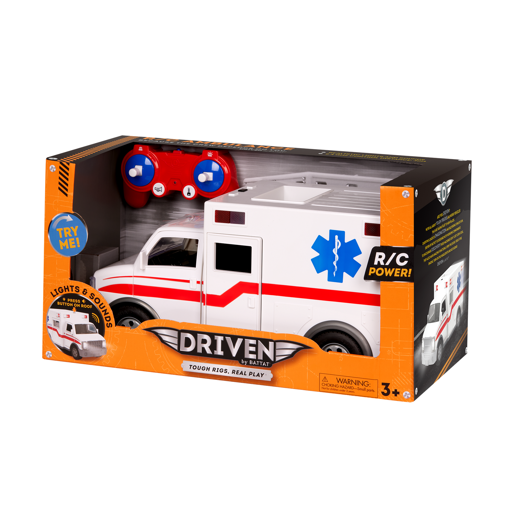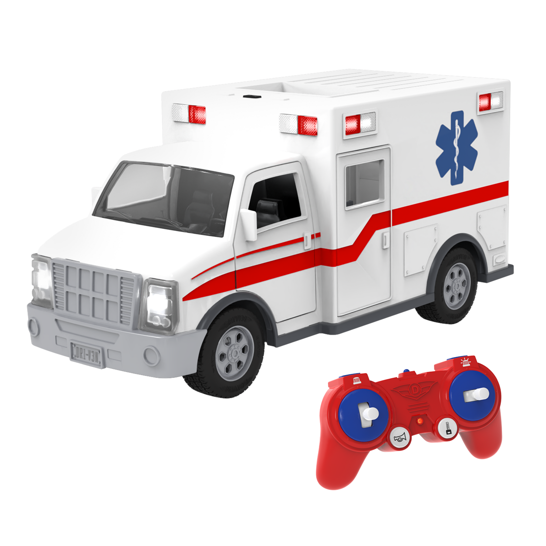 Save the day with the Midrange Ambulance from DRIVEN by Battat! This remote-controlled vehicle gets you where you need to go in a flash. Using joysticks on the remote, you can move the toy ambulance backwards, forwards, and side-to-side from up to 100 feet away! Press the buttons on the controller to rev the engine and honk the horn. When it’s time for a rescue, press on the bumpers to activate the sirens and flash the lights at the top of the truck. Wee-oo, wee-oo! Everyone out of the way – there’s an ambulance coming through! Speed past imaginary traffic and get there just in time. Up close, you’ll find all kinds of details, inside the truck and out. The front and back cabins, realistic finish, and movable parts make it look so much like the real thing! Like all other DRIVEN toys, this vehicle is also incredibly sturdy. The R/C Midrange Ambulance is suitable for energetic playtime with kids aged 3 years and up. Stay DRIVEN, because the crew depends on you!