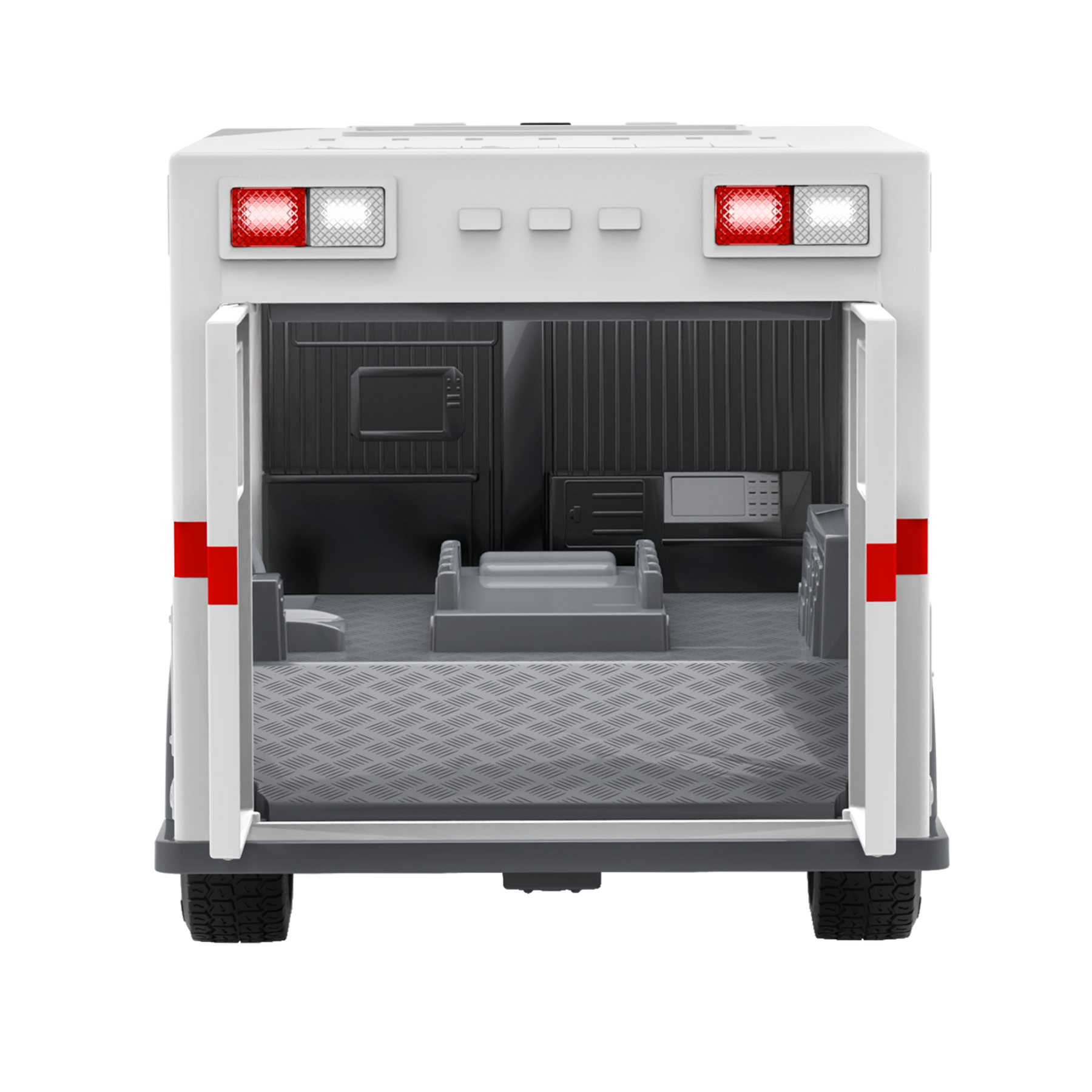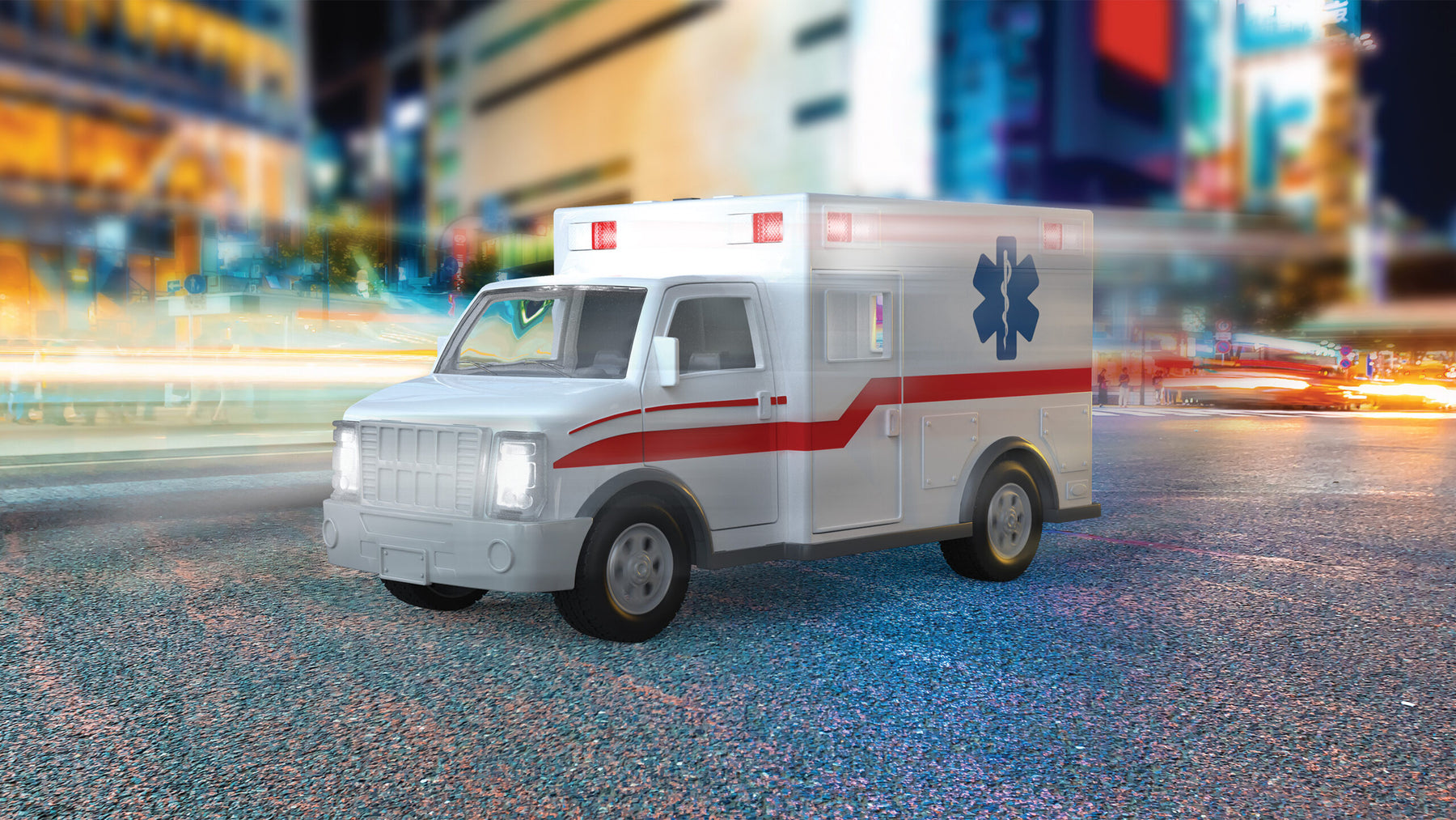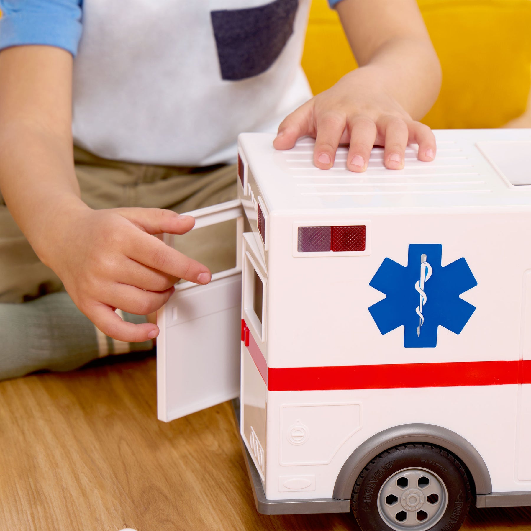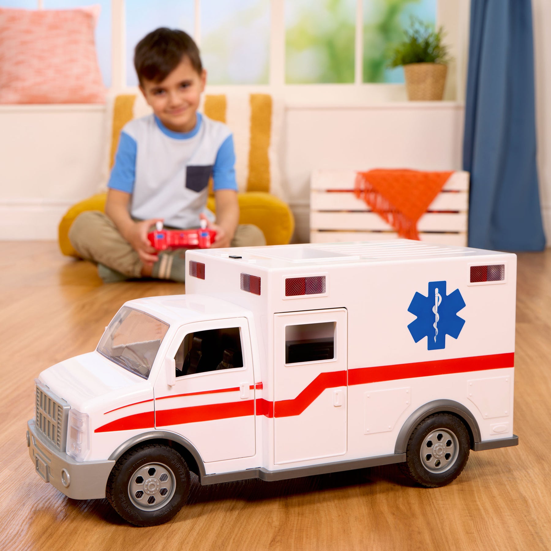 Save the day with the Midrange Ambulance from DRIVEN by Battat! This remote-controlled vehicle gets you where you need to go in a flash. Using joysticks on the remote, you can move the toy ambulance backwards, forwards, and side-to-side from up to 100 feet away! Press the buttons on the controller to rev the engine and honk the horn. When it’s time for a rescue, press on the bumpers to activate the sirens and flash the lights at the top of the truck. Wee-oo, wee-oo! Everyone out of the way – there’s an ambulance coming through! Speed past imaginary traffic and get there just in time. Up close, you’ll find all kinds of details, inside the truck and out. The front and back cabins, realistic finish, and movable parts make it look so much like the real thing! Like all other DRIVEN toys, this vehicle is also incredibly sturdy. The R/C Midrange Ambulance is suitable for energetic playtime with kids aged 3 years and up. Stay DRIVEN, because the crew depends on you!