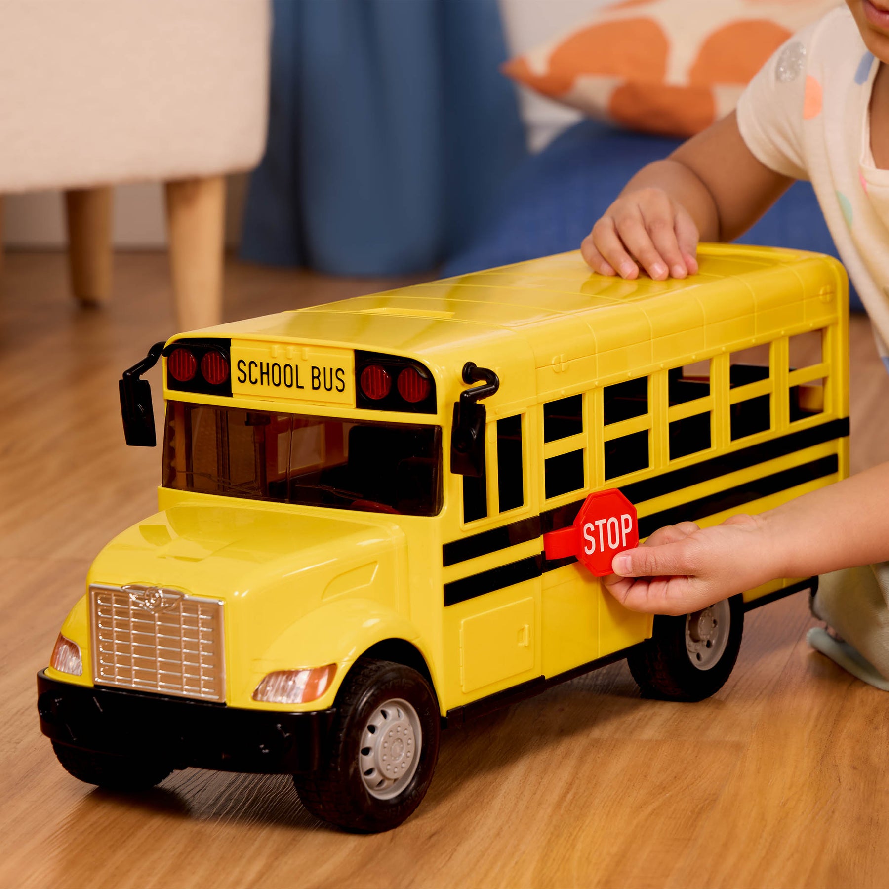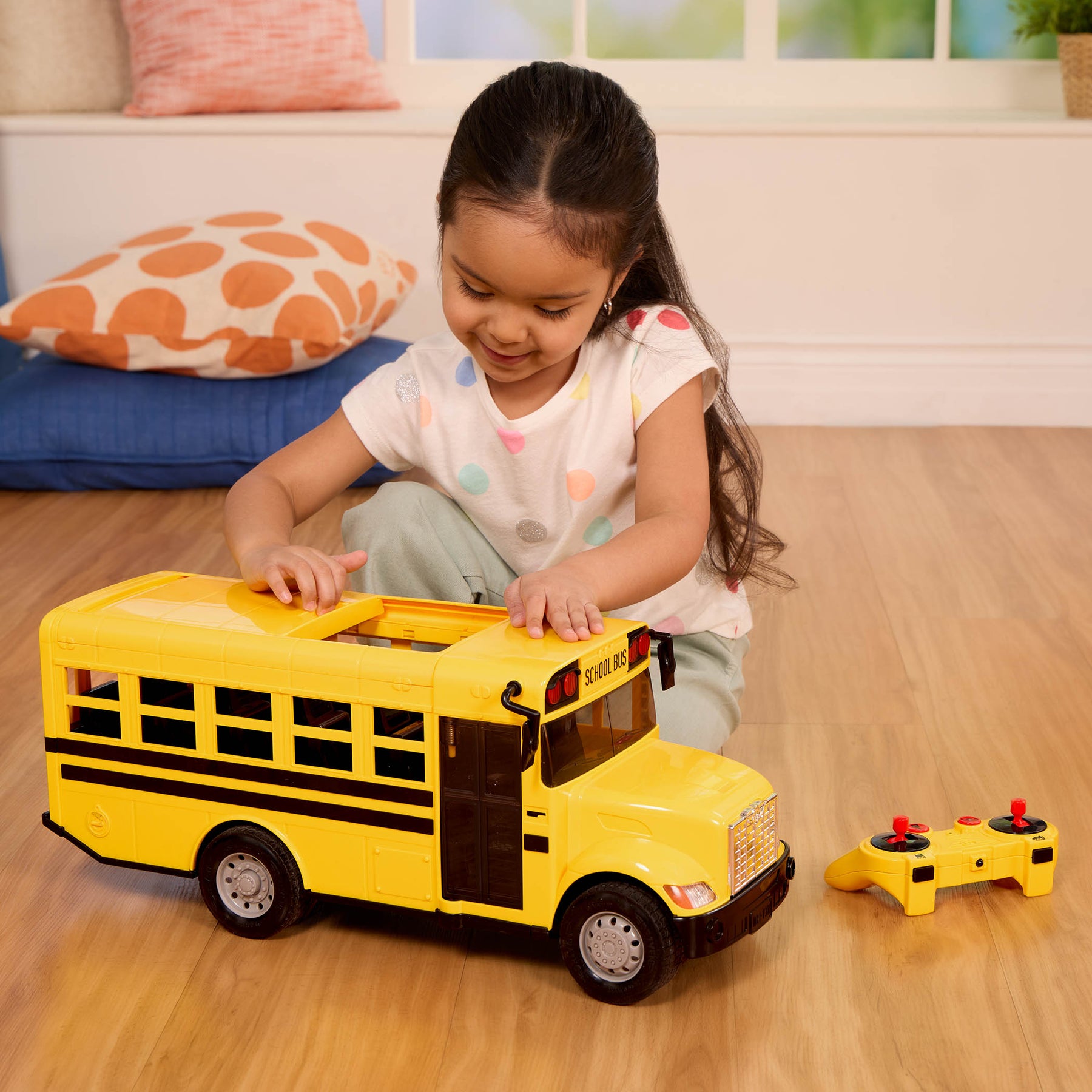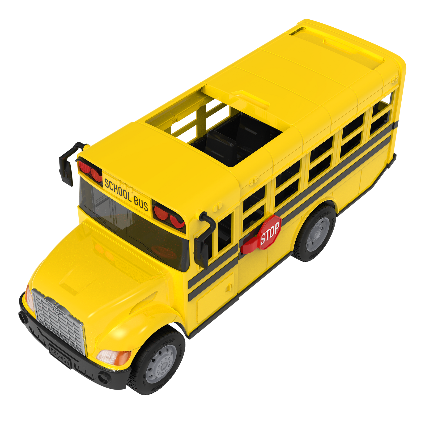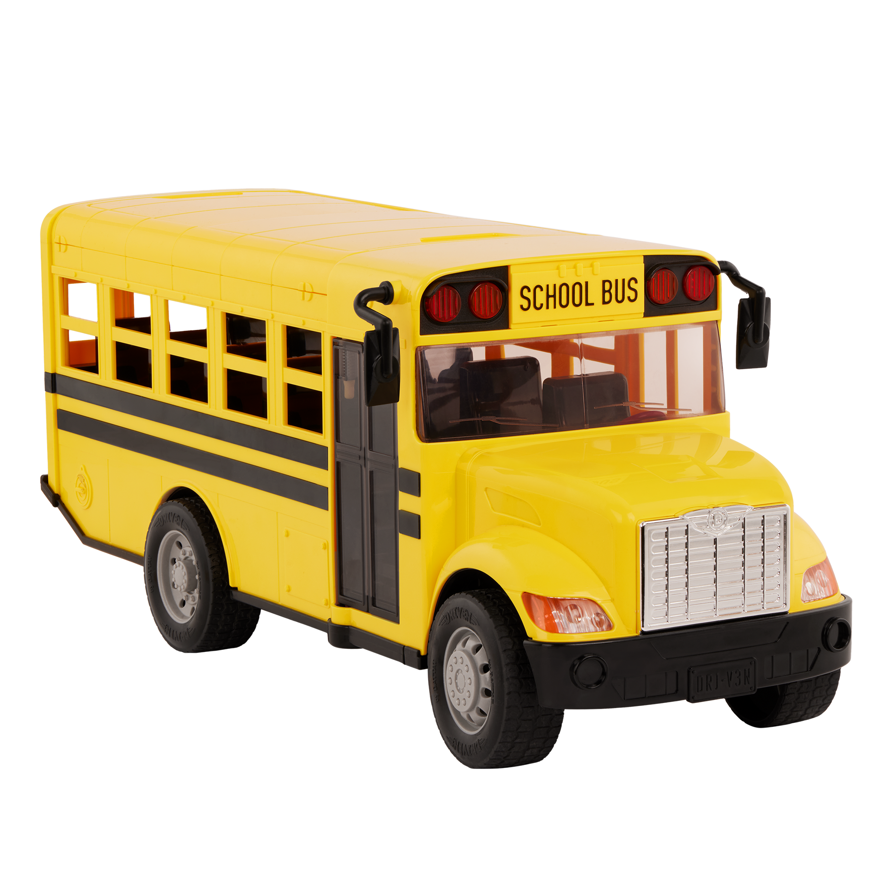 Hop aboard and pick up all your friends with the Standard Remote Control School Bus from DRIVEN by Battat! Designed with DRIVEN’s signature durability, the RC school bus features sturdy details that are made to last – from traction tires to elastic-hinged doors. As kids plan their routes, interactive features ensure they have everything they need for a fun ride. Use the long-distance remote to turn on the flickering safety lights and rev the ignition. Press the steering wheel to honk the horn, swing out the stop sign, and open the roof to get everyone on board in a fun way! Kids will develop their fine motor skills on the controls as they maneuver the bus. Little drivers can stop, go, and turn instantly! This toy bus works best on hard, smooth surfaces and is recommended for kids 3 years and up. Remember: Stay DRIVEN, because the crew depends on you!