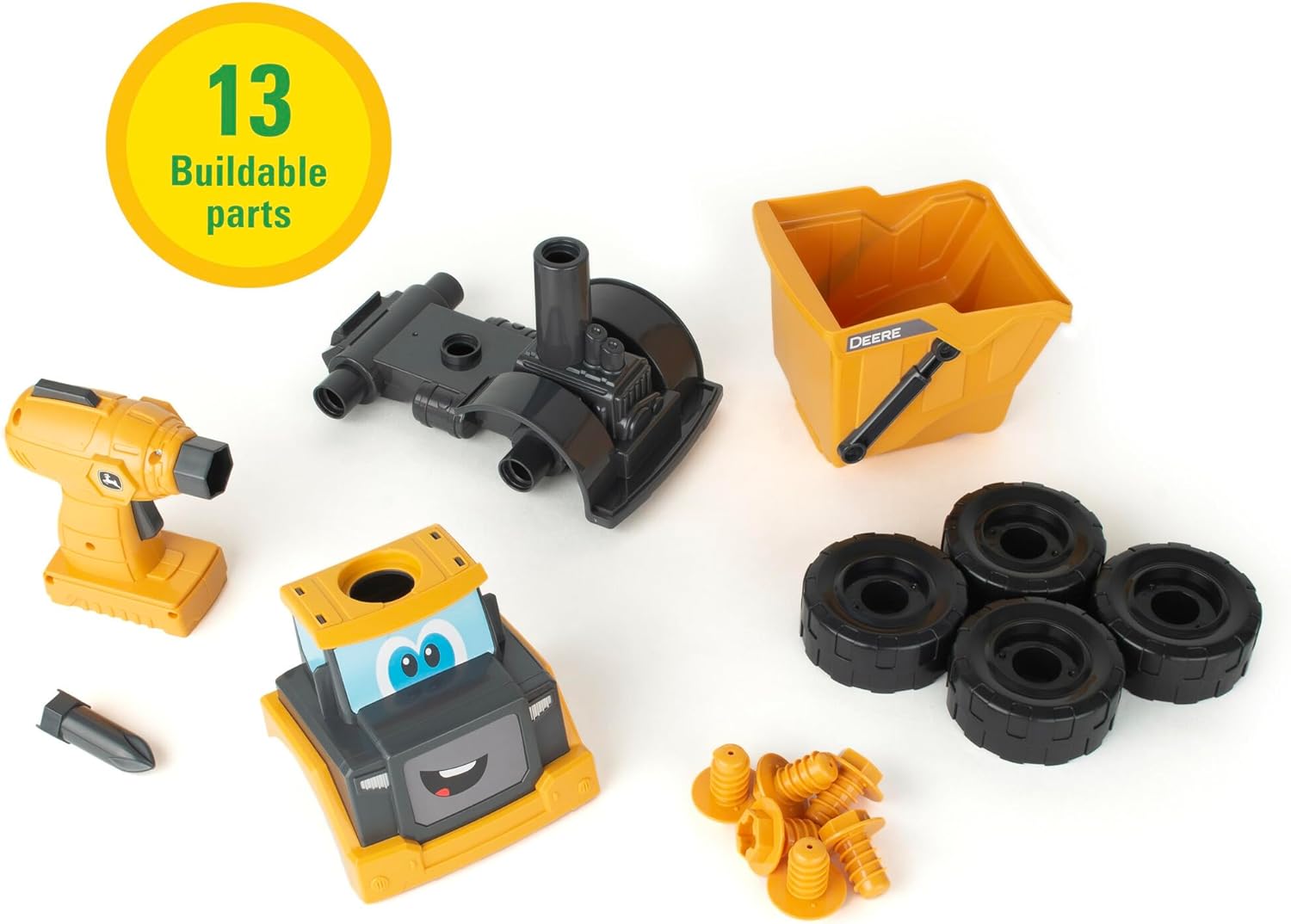 The John Deere Build-A-Buddy Yellow Dump Truck features two great ways to play! This 13 piece construction toy includes a drill and one bit that lets kids take it apart and put it back together again which is great for encouraging problem solving skills. Made of chunky parts, it's easy for little hands to assemble and maneuver into place. But the fun doesn't stop there! Put together, this dump truck is a great push-along toy for lots of on-the-floor fun. It also features a working dump bed that lets kids haul around all of their favorite treasures. This dump truck toy comes complete with 2 AA batteries pre-installed so that the fun can start right away! Ages 18 Months +