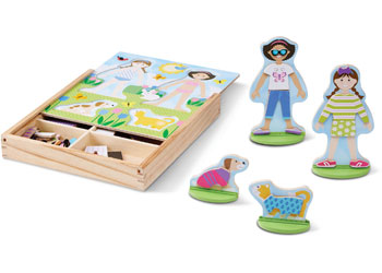 Mix, match, and create endless friendship stories with the Melissa & Doug Best Friends Magnetic Dress-Up Set! Featuring two best friends and their adorable pets—a puppy and a kitten—this charming wooden magnetic set lets kids explore creativity through imaginative play. With dozens of colourful magnetic clothing pieces and accessories, children can dress up the friends in coordinating outfits for every adventure. Everything stores neatly in a sturdy wooden tray with a slide-in lid and carry handle, making it perfect for on-the-go fun!