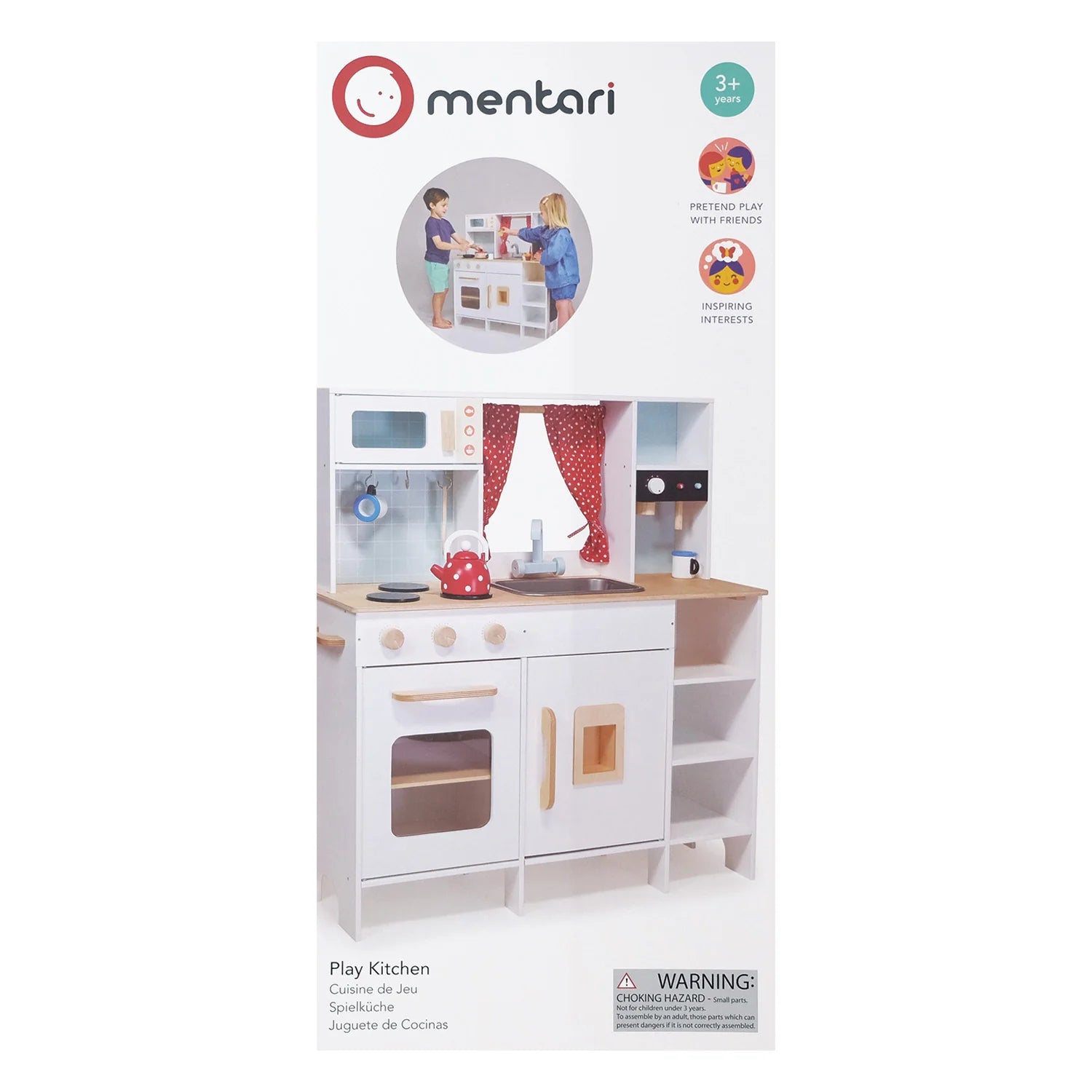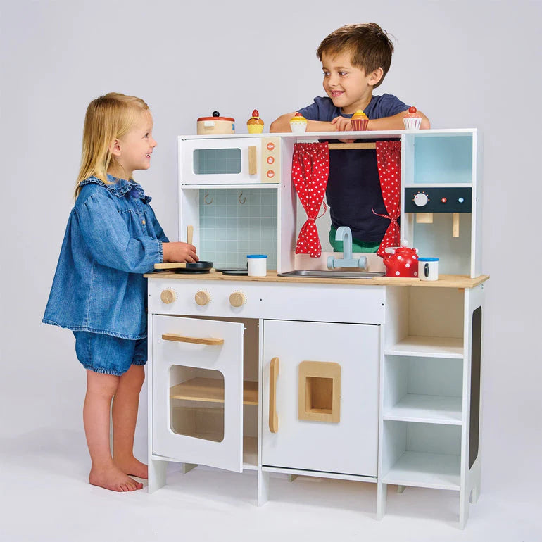 Children can use their imaginations through role play at their very own pretty kitchen station with window and curtains by cooking dinner for their friends, boiling the kettle, making a cup of coffee, washing up in the sink, using the microwave to heat up food, baking a cake in the oven and putting their play food away in the fridge. Check out the ice dispenser in the front door of the fridge. Set includes 2 cups, a wooden spoon and a dotty kettle.