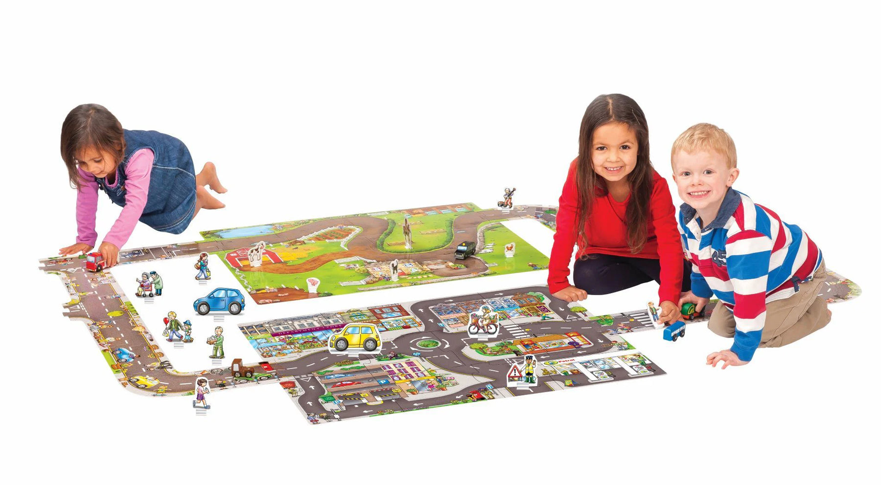 A fun town themed jigsaw playmat with car and character pieces.