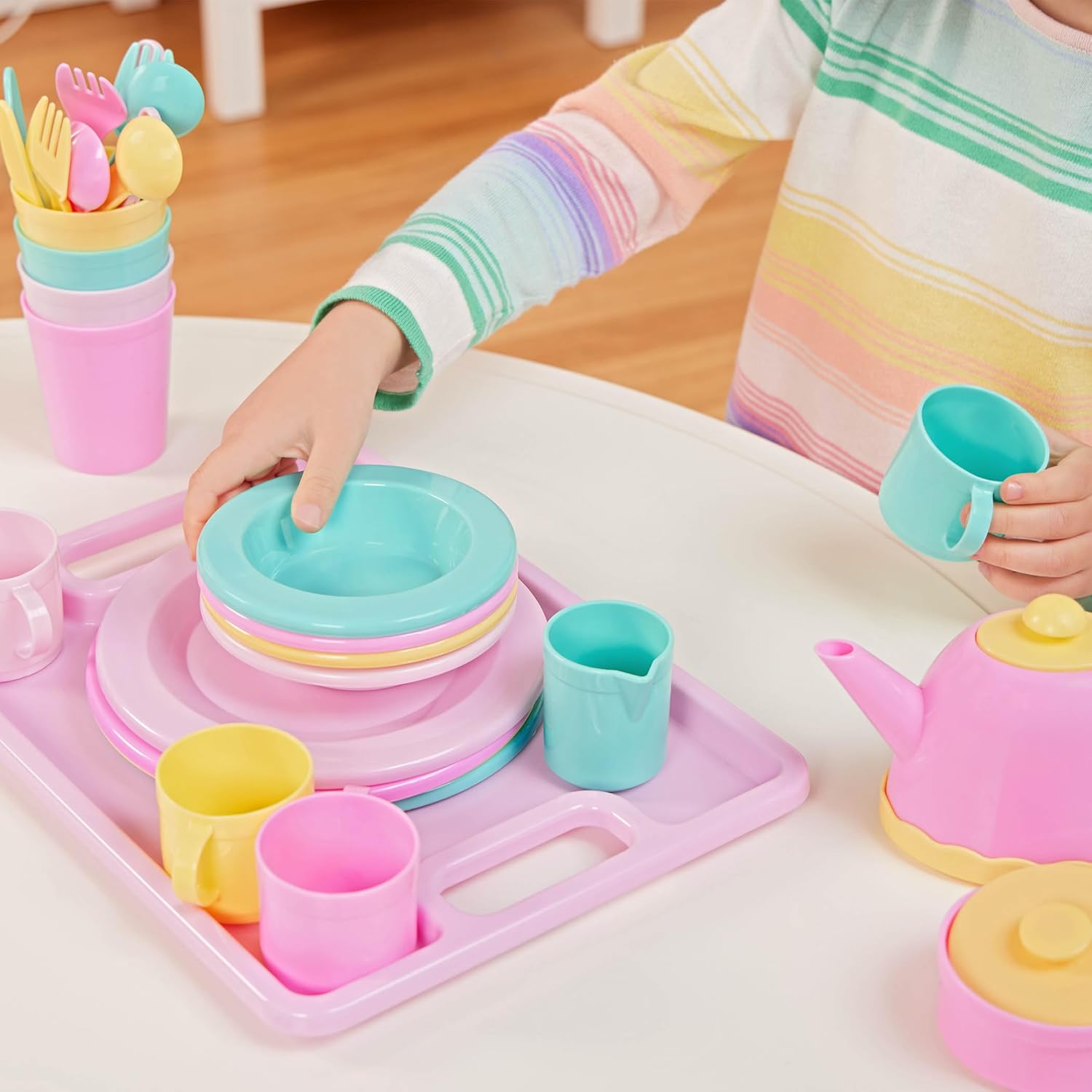 Who's at the door? It's our party of four! This 34-piece toy dishes set is perfect for the host-in-training. Serve up hours of fun with a full place setting for four and invite your favorite dolls, friends, and teddy bears for a pretend meal. Use the handy serving tray to deliver “hot tea” (or other delicious potions you put in the teapot)!
