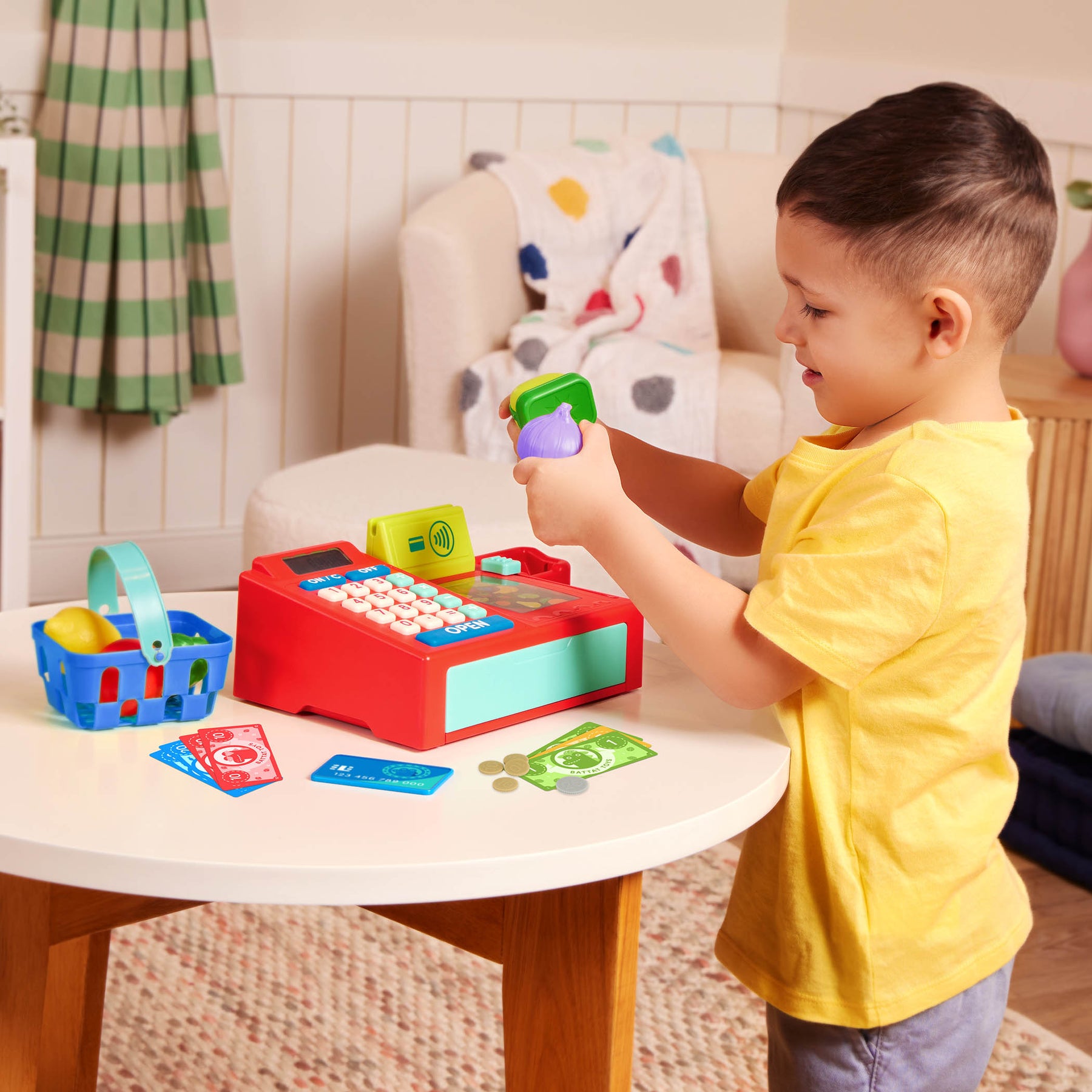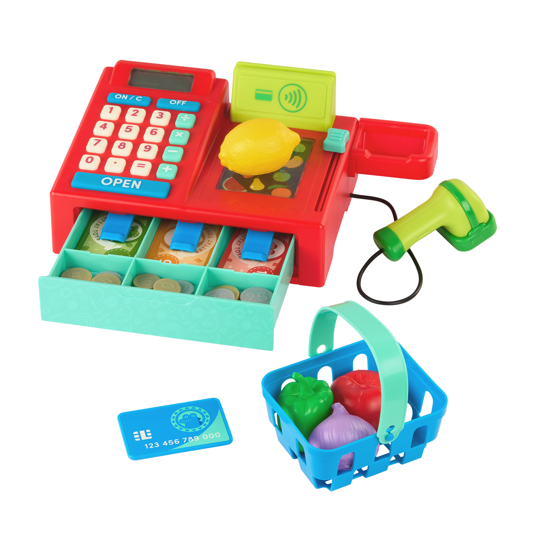 Packed with modern features, this kids’ toy hauls a cart-load of playful opportunities. The cash register features a working calculator and a scanner that beeps with the click of a button, so kids can ring up their pretend purchases – just like the real deal! They can also slide the conveyor belt back and forth to see more colorful produce. Time to pay? Use the card reader or handle the 28 pieces of play money. Then, when it’s time for more shopping, walk down the make-believe aisles with the colorful play food and the mini basket. This toy cash register helps improve early math skills through pretend play. Beep, swipe, tap, and slide into grocery fun with the Ring It Up Cash Register!