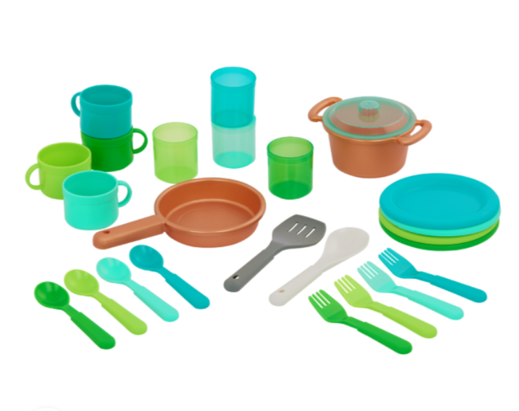 Cook up big kitchen fun with the littlest chefs! Two n’ One Cookin’ Fun is a play kitchen and market designed to introduce toddlers to realistic pretend play. Cook, serve, and wash up from any side for maximum fun and lots of learning opportunities. Start by scribbling today’s menu on the chalkboard, then get out the pots and pans and get creative! Next, serve up make-believe creations to happy customers – don’t forget to wash up and clean the dishes afterwards!