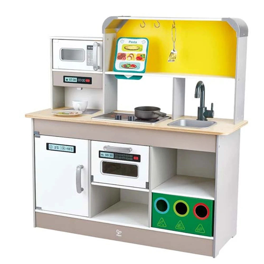 Give your guests a wonderful meal with this great kitchen playset! The kitchen features a spacious play top with an electric stove. The red stove top will light up and make bubbling sounds while the other fryer top will light up blue using the fun fan technology to make the food levitate, turn and shake in your pan! Includes a recycle bin and other accessories, pre-cut food and a recipe book with six dishes to try.