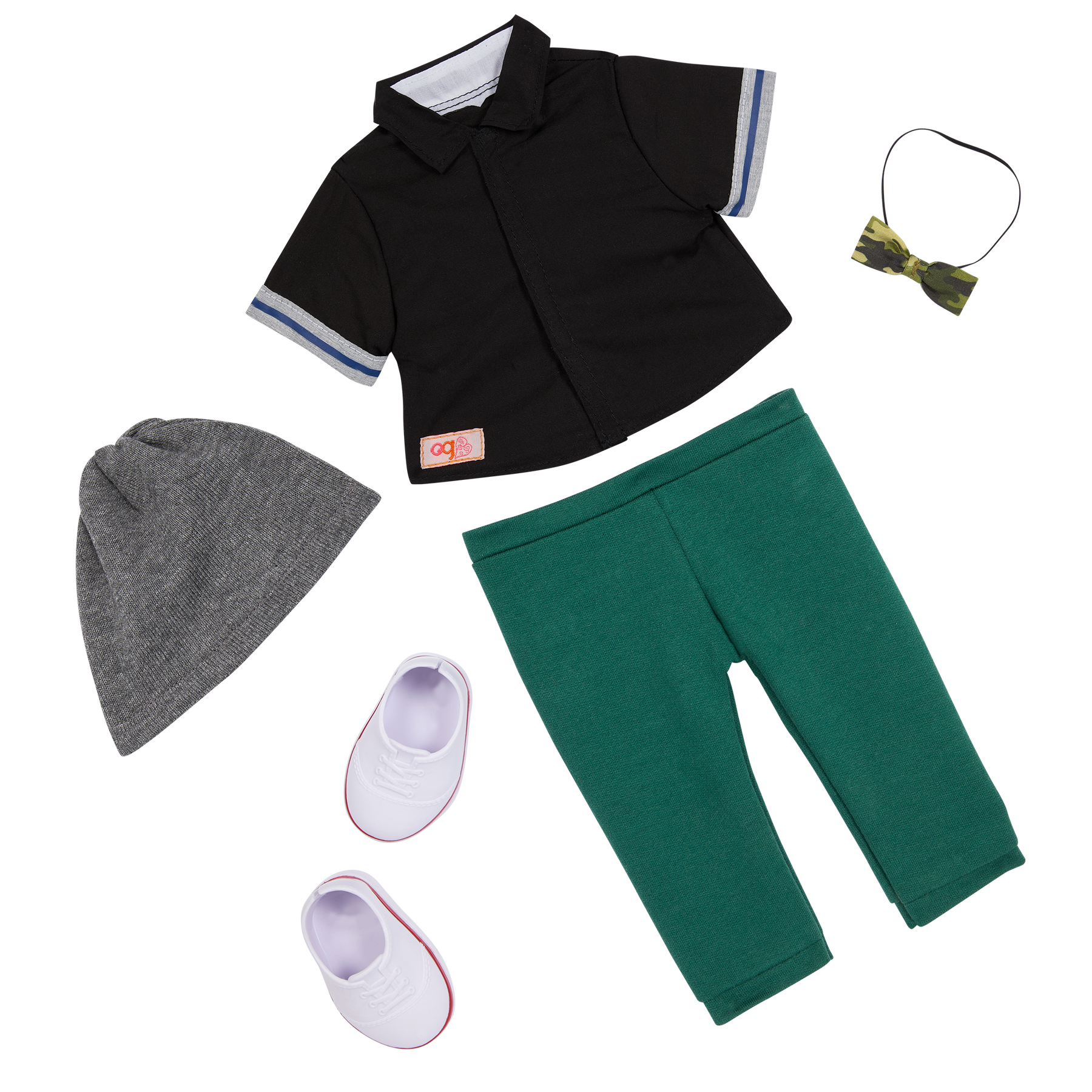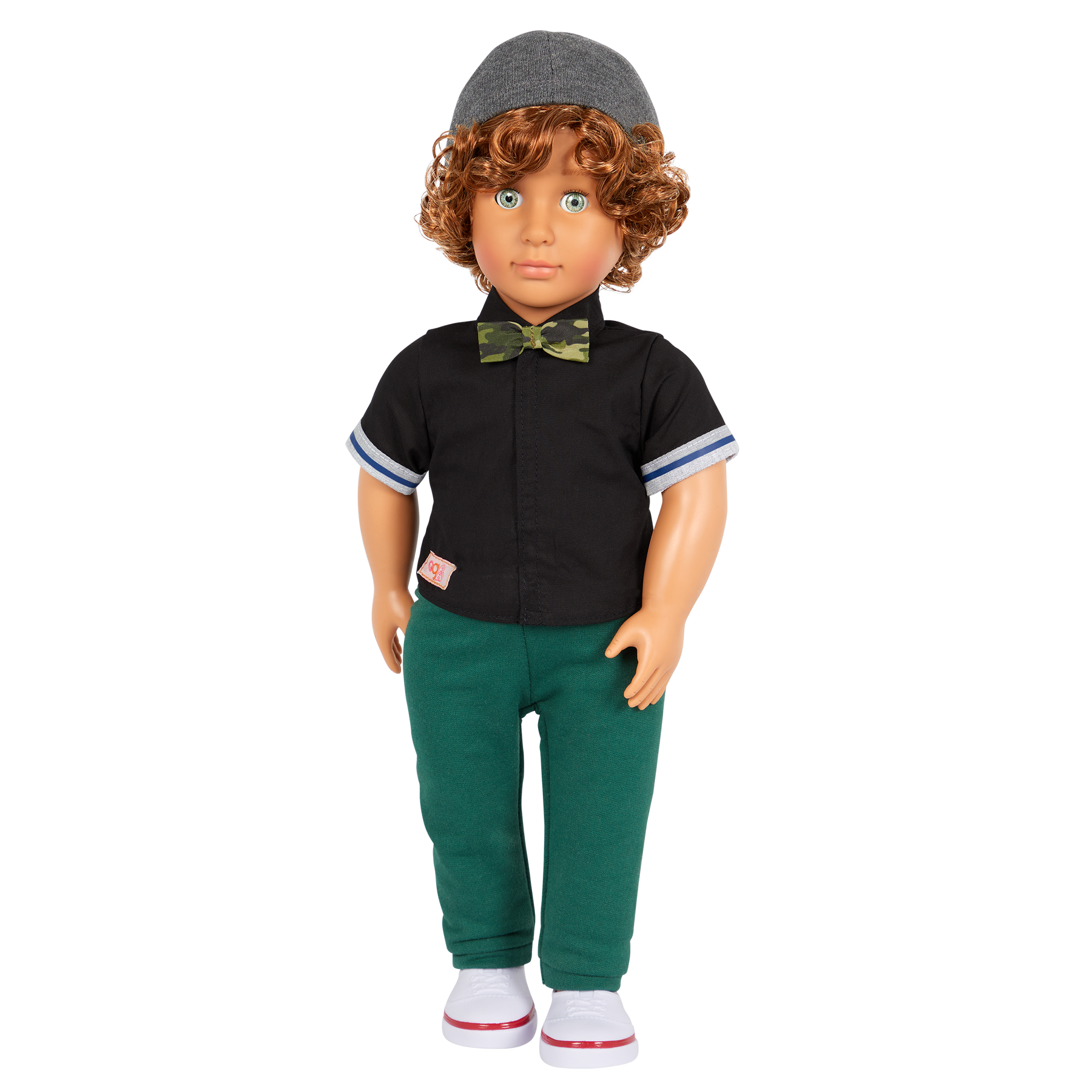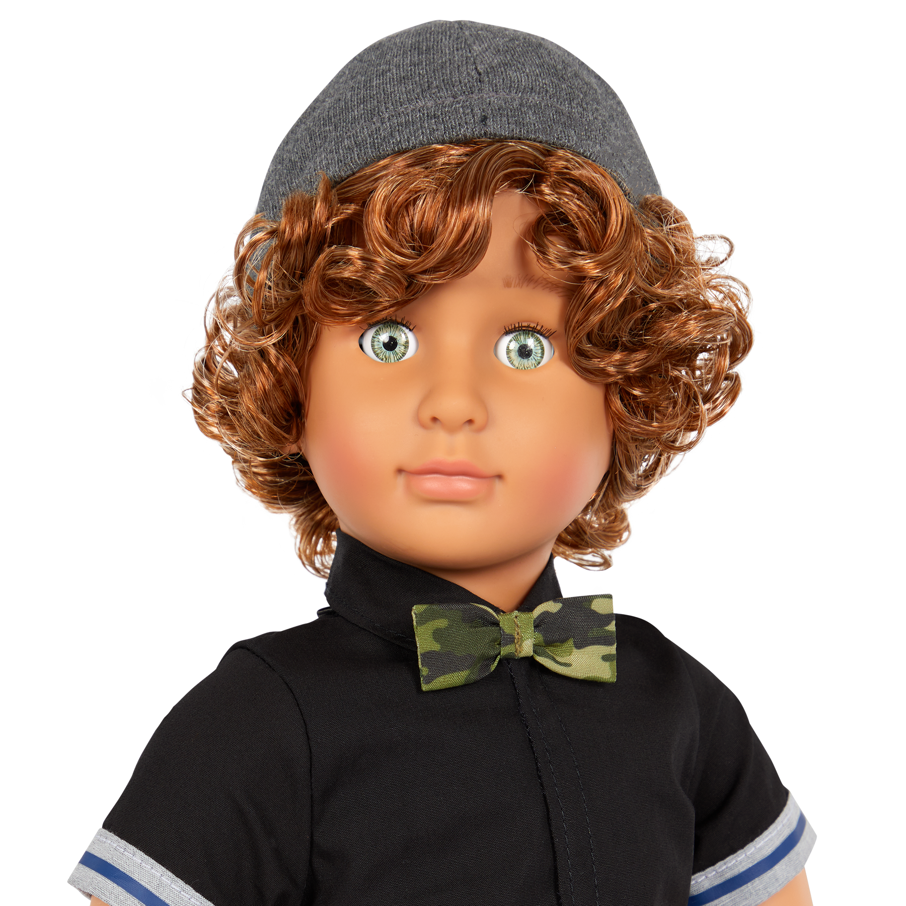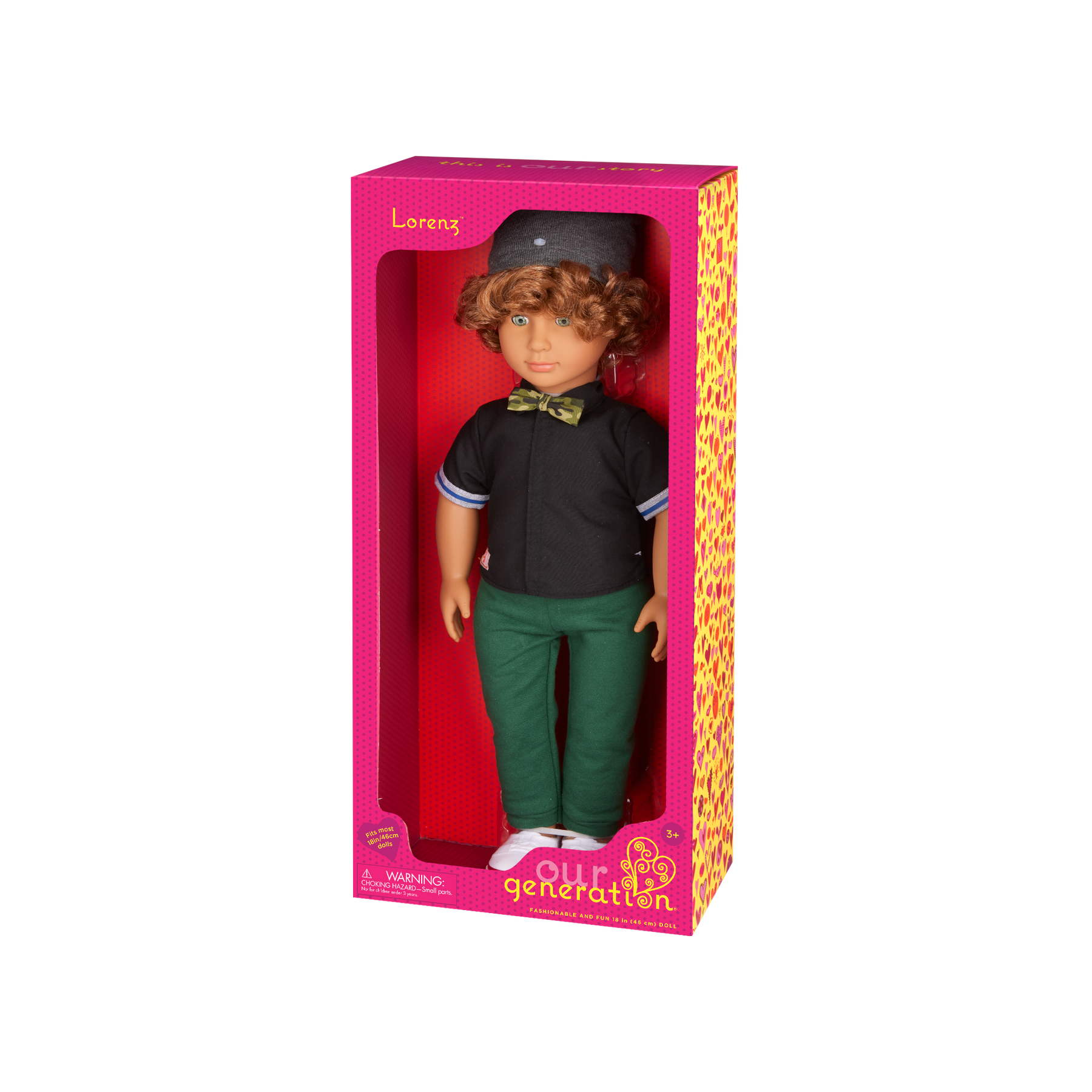 Explore cool and playful styles with Lorenz - he loves pairing his outfits with fun accessories! This Our Generation 18-inch boy doll arrives wearing a stylish top, a pair of joggers, running shoes, a beanie hat, and a camo-themed bowtie for an extra classy look. He has a huggable soft body with lifelike features, from his light-blue eyes that open and close to his medium-length, wavy brown hair that's fun to style! When it's time for dress-up, his outfit has easy-open closures to quickly put on and remove, so you can mix, match, and give Lorenz more fun looks on every adventure!