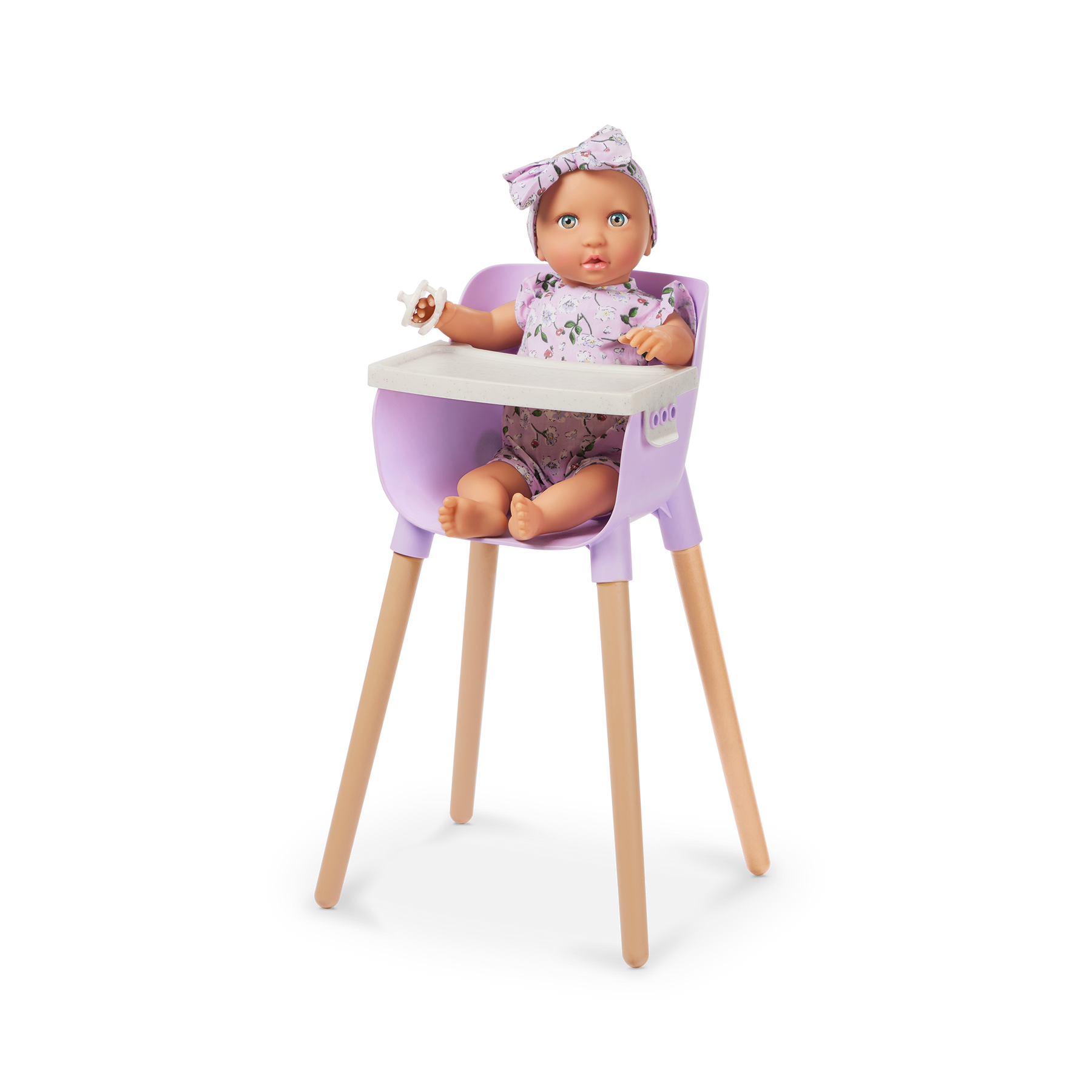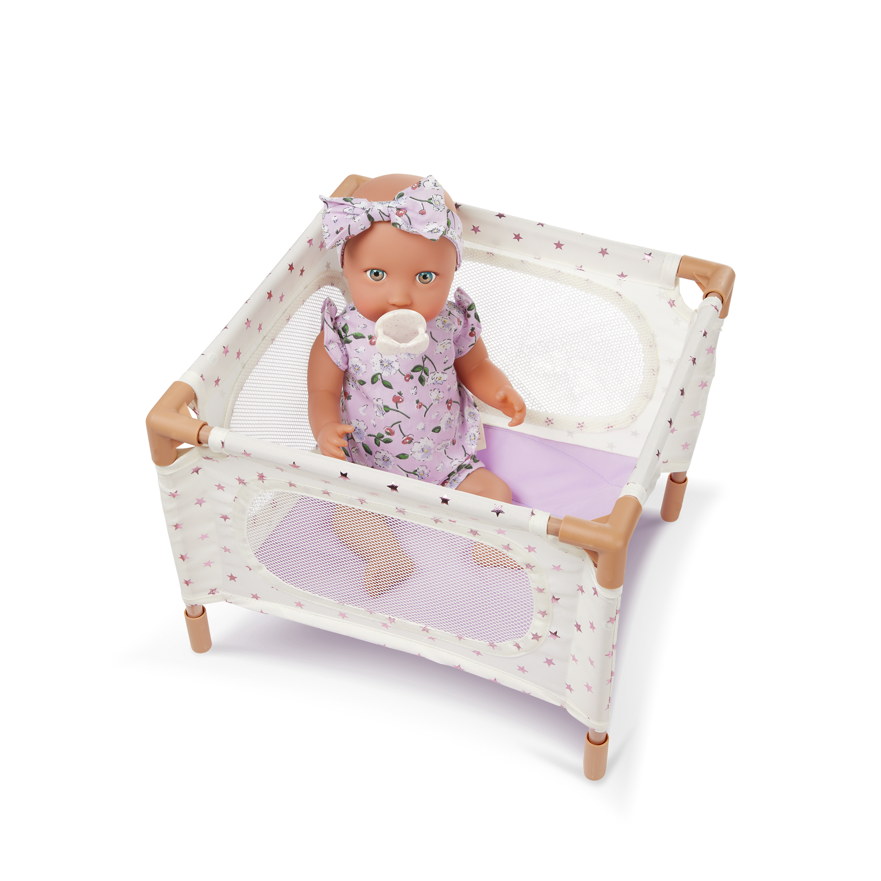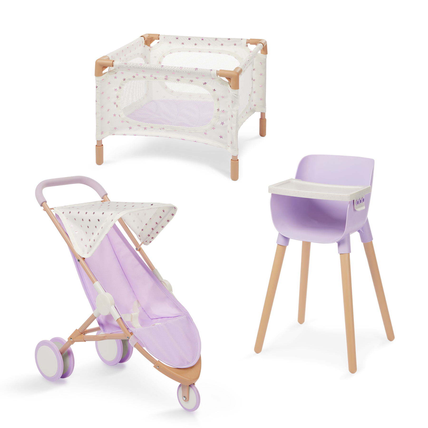 Give their dolls a lovely place to play and explore with the LullaBaby nursery playset, including a portable playpen, high chair, and jogger stroller. Designed in a trendy lavender and white color palette, the modern playpen helps young nurturers create a beautiful nursery in their favorite play areas. And it’s perfectly sized to keep dolls bedside during the night. Is baby doll feeling hungry? Seat them in the high chair to enjoy yummy meals after their nap. Or take them on fun trips in the push-and-pull jogger stroller! A household favorite for parents, kids can secure their baby doll with the safety strap and keep them comfy with the foldable canopy. The stroller also has an easy-to-grab foam handle with large, double rear wheels to add extra balance as kids develop coordination and spatial skills. Each accessory requires minimal assembly, with step-by-step, easy-to-follow instructions provided and is compatible with most 14-inch dolls and accessories. Safety tested to meet all regulatory phthalates and BPA requirements. LullaBaby dolls sold separately.