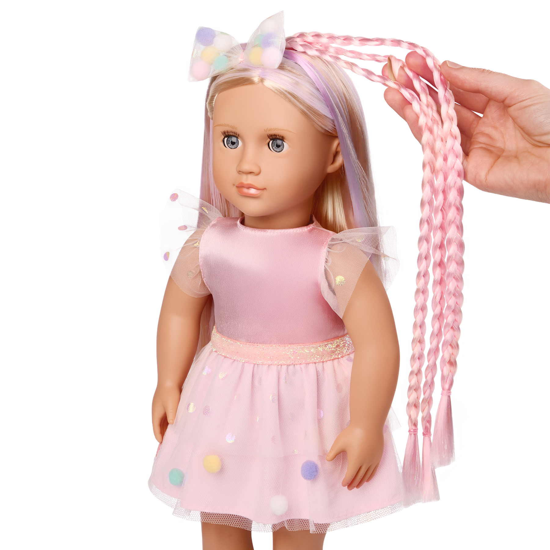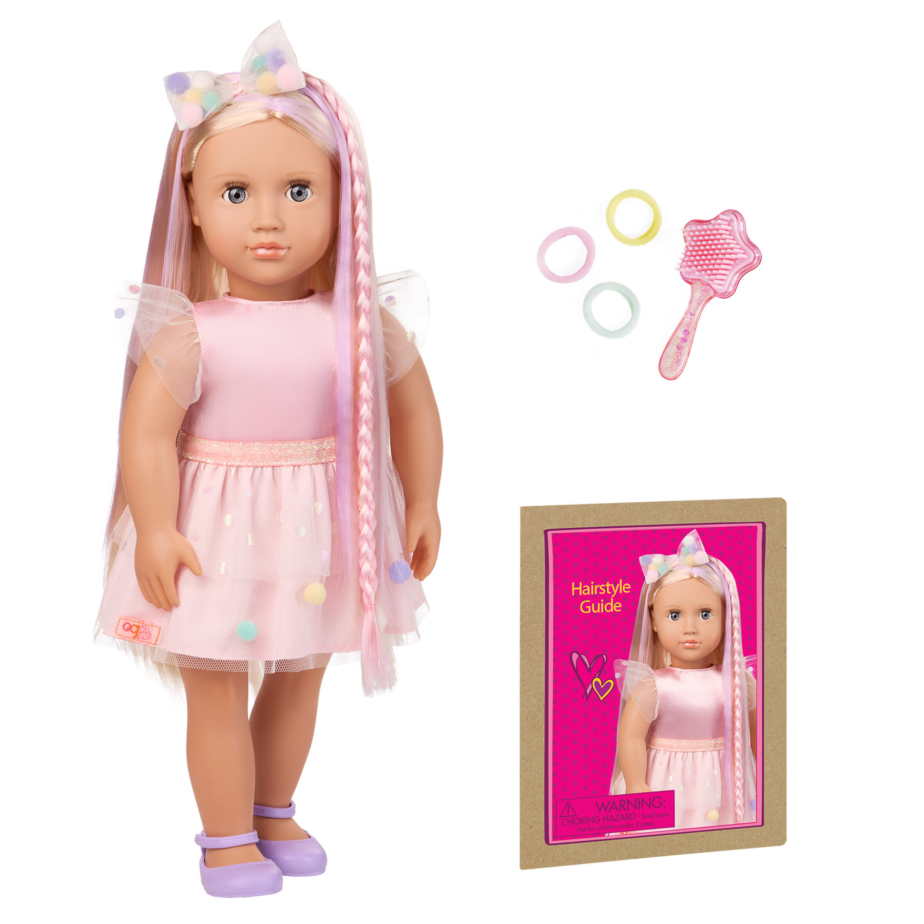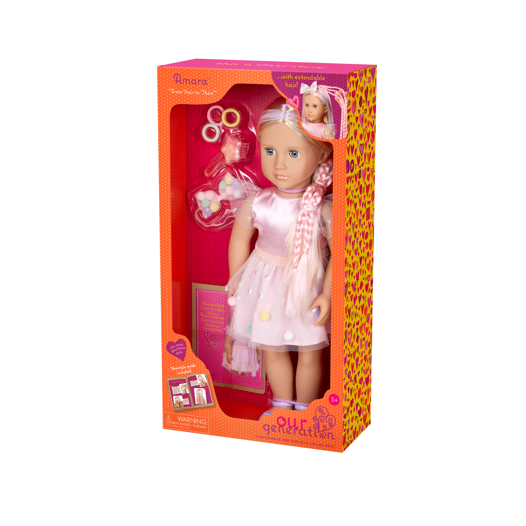 Our Generation 46 cm doll Amara shines with ultra-long blonde hair for kids to style and accessorize, featuring radiant pops of color for extra dazzle! Need more volume? Kids can make Amara's pink braids grow longer or shorter with the push of a button, bringing their creativity to new lengths! The styling guide includes 4 different hairstyles for kids to get the fun started, with hair elastics and a hair bow to complete every look. Time for a refresh? Kids can use the brush to smooth out Amara's hair and dream up all-new trends for hours of fun. Amara wears an easy-change dress with colorful pom pom details. She has a huggable soft body and lifelike eyes that open and close. This Our Generation doll makes a wonderful gift for kids ages 3+ (small parts), encouraging them to create their own unique stories.