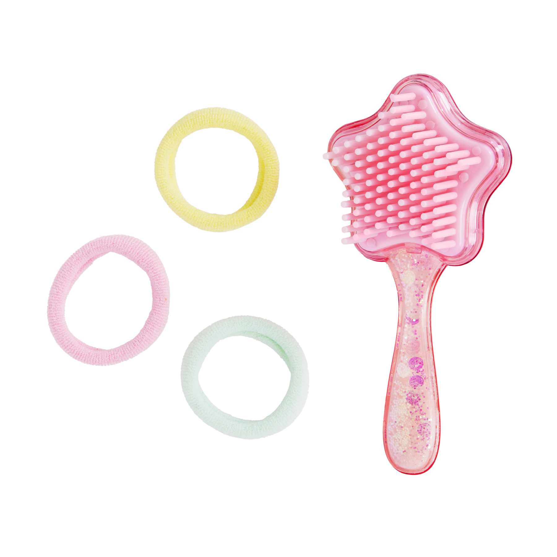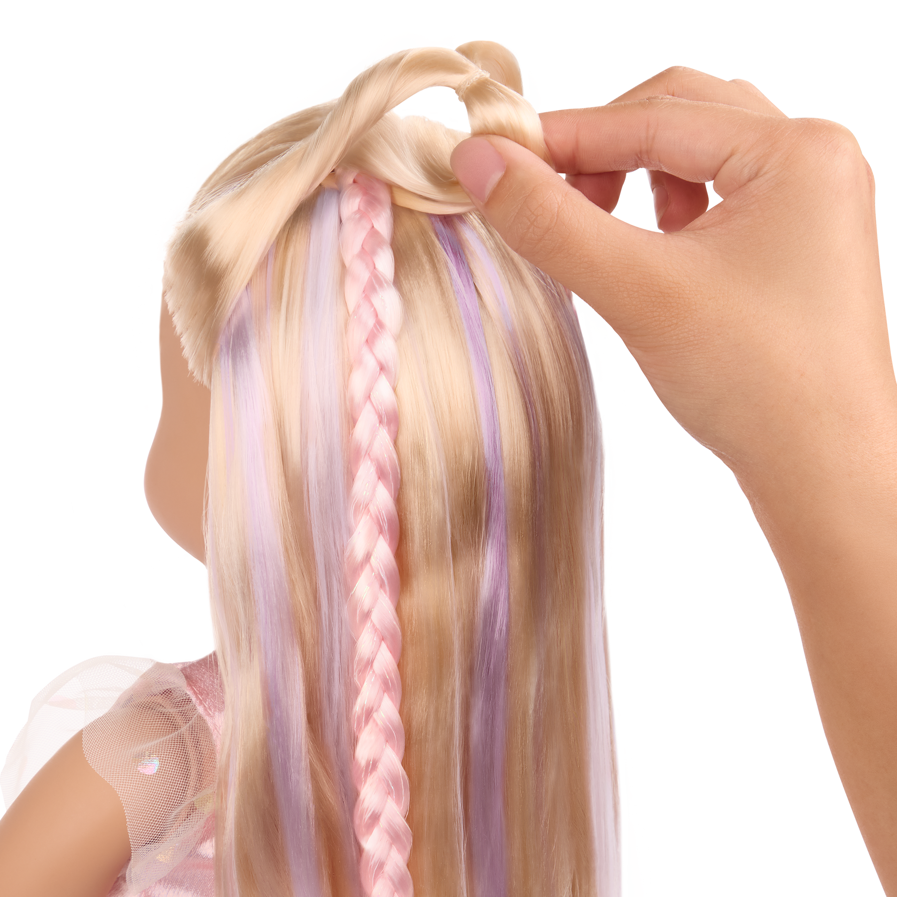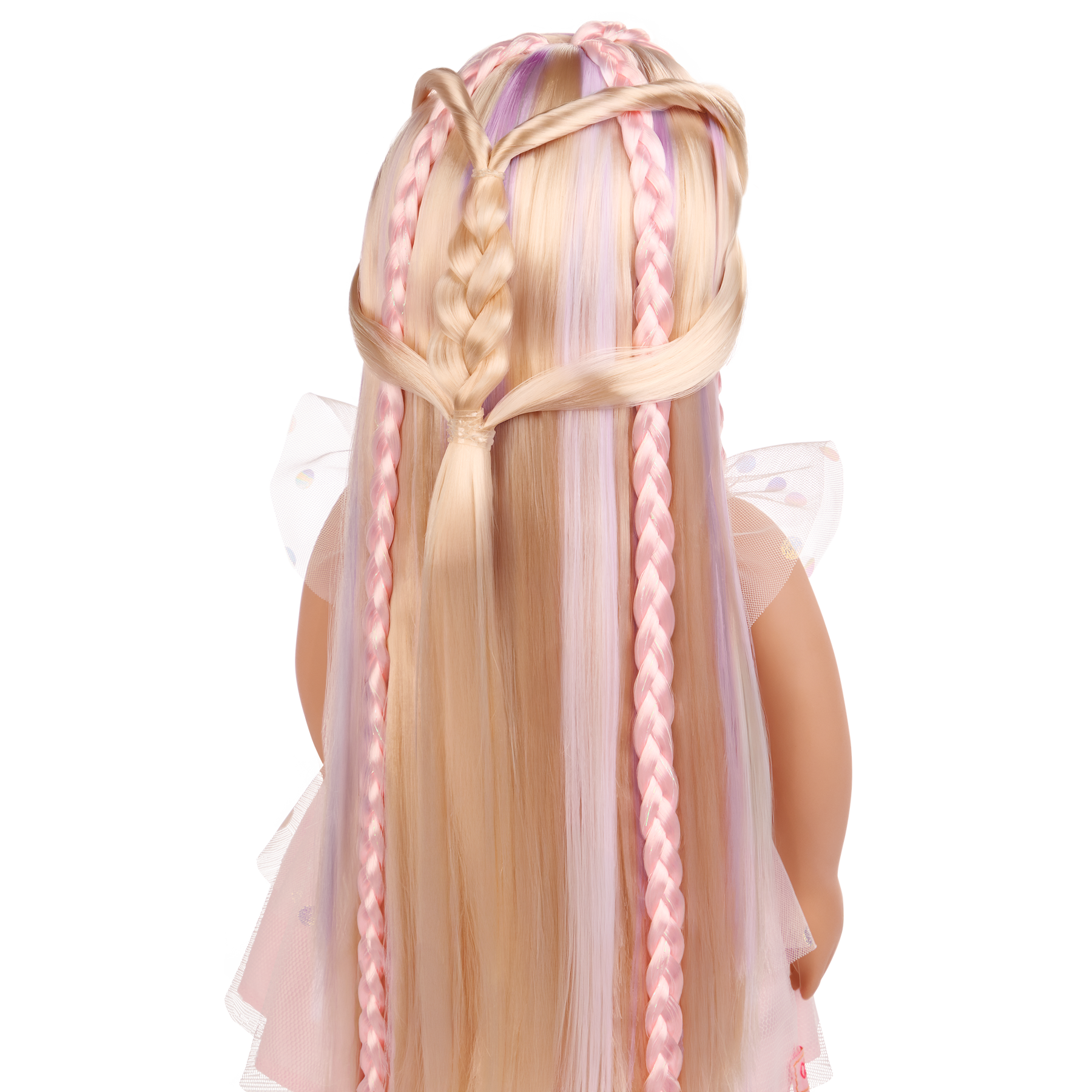Our Generation 46 cm doll Amara shines with ultra-long blonde hair for kids to style and accessorize, featuring radiant pops of color for extra dazzle! Need more volume? Kids can make Amara's pink braids grow longer or shorter with the push of a button, bringing their creativity to new lengths! The styling guide includes 4 different hairstyles for kids to get the fun started, with hair elastics and a hair bow to complete every look. Time for a refresh? Kids can use the brush to smooth out Amara's hair and dream up all-new trends for hours of fun. Amara wears an easy-change dress with colorful pom pom details. She has a huggable soft body and lifelike eyes that open and close. This Our Generation doll makes a wonderful gift for kids ages 3+ (small parts), encouraging them to create their own unique stories.