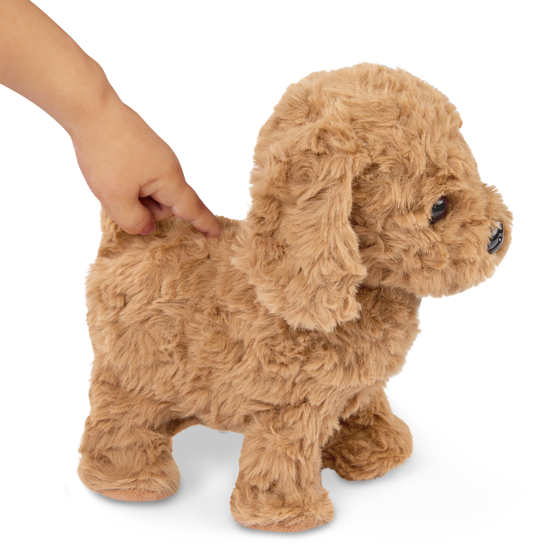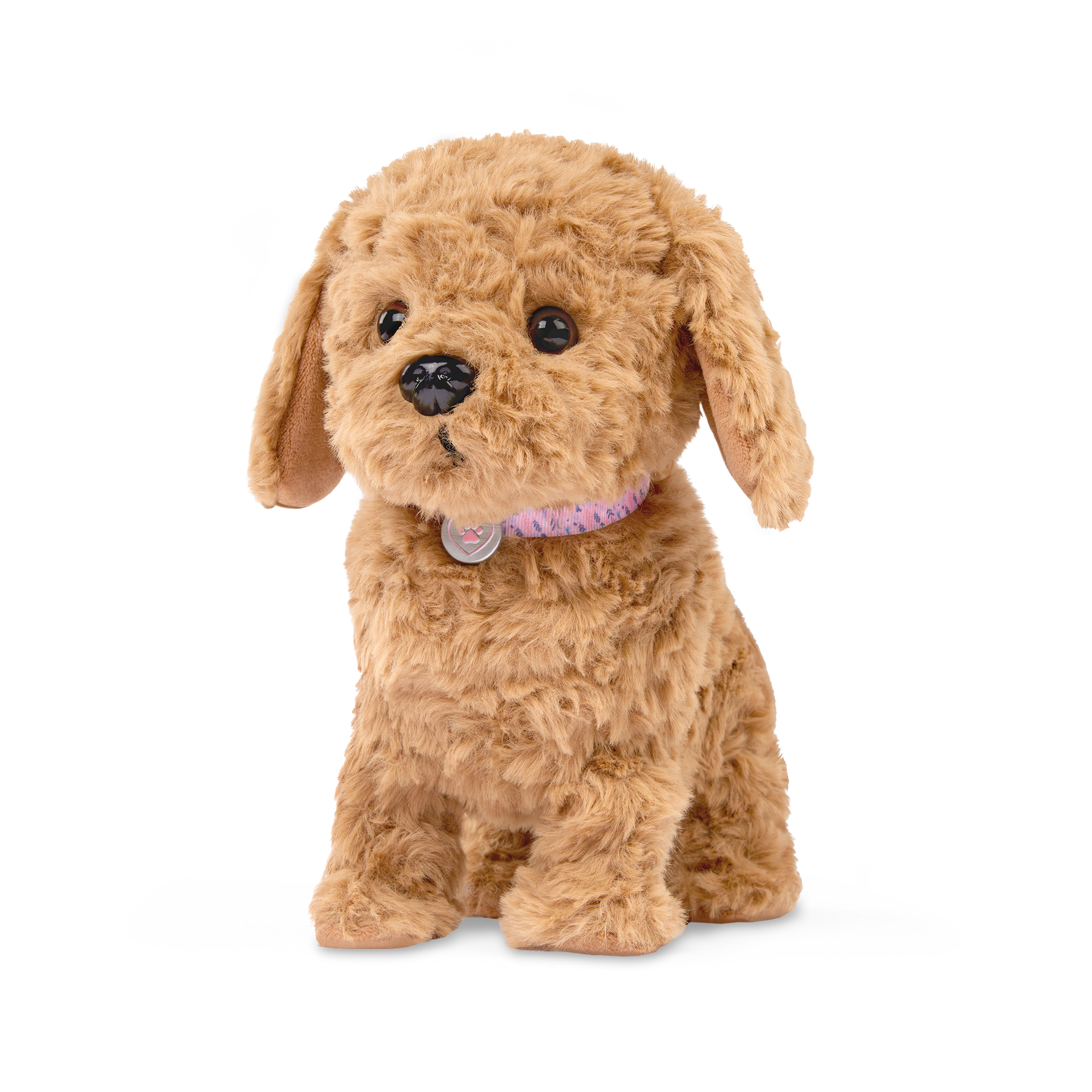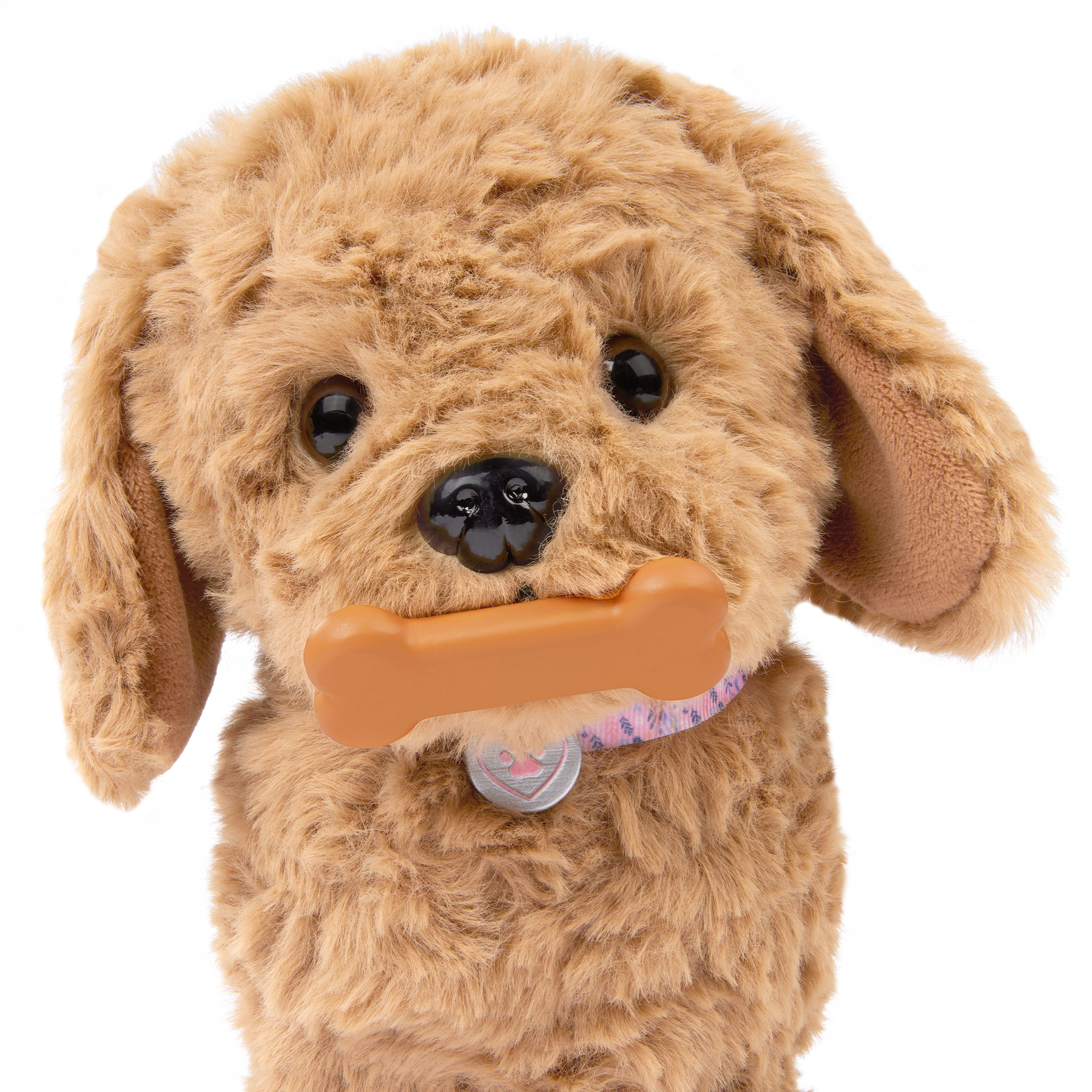 Kids can feel like real-life pet owners with the Our Generation Playful Paws Goldendoodle Pup! This adorable electronic pet puppy has lots of interactive features to provide endless fun and companionship. With a simple pat on the head, watch the puppy respond with joyful barks and a wagging tail. Or, kids can push the button on its back to make puppy walk! Time for a treat? The magnetic bone sticks right to its mouth and activates realistic eating sounds, making playtime even more engaging. Themed accessories like a stylish collar and leash are perfect for taking their new best furry friend on imaginary adventures. Plus, kids can beautify their pup by brushing its soft, plush fur with the grooming comb. With its dog-like movements and sounds, this electronic pup is sure to become a cherished member of the family. The Our Generation electronic pet makes a wonderful gift for kids ages 3 years old and up (small parts), encouraging imaginative play and nurturing a love for pets.