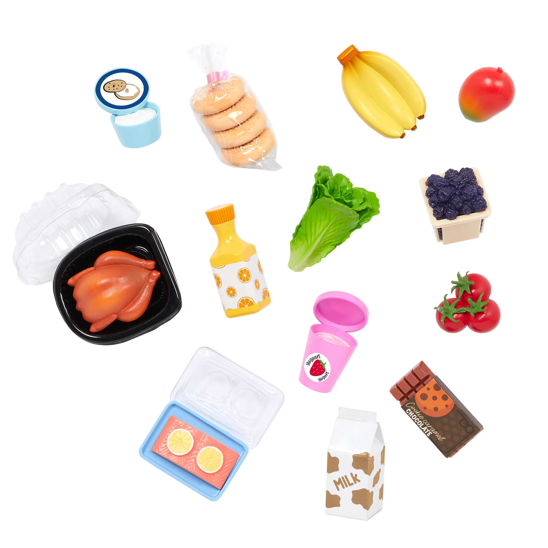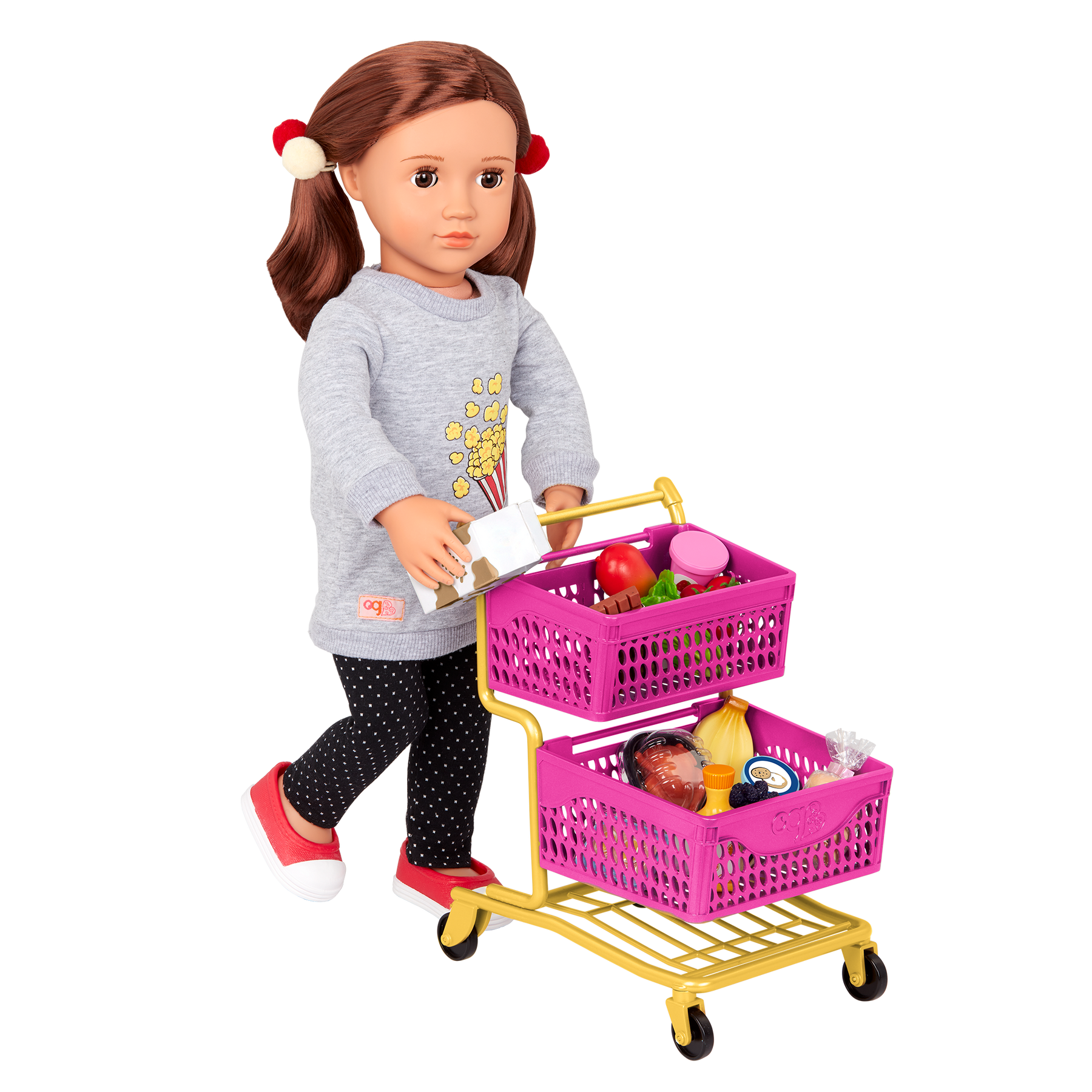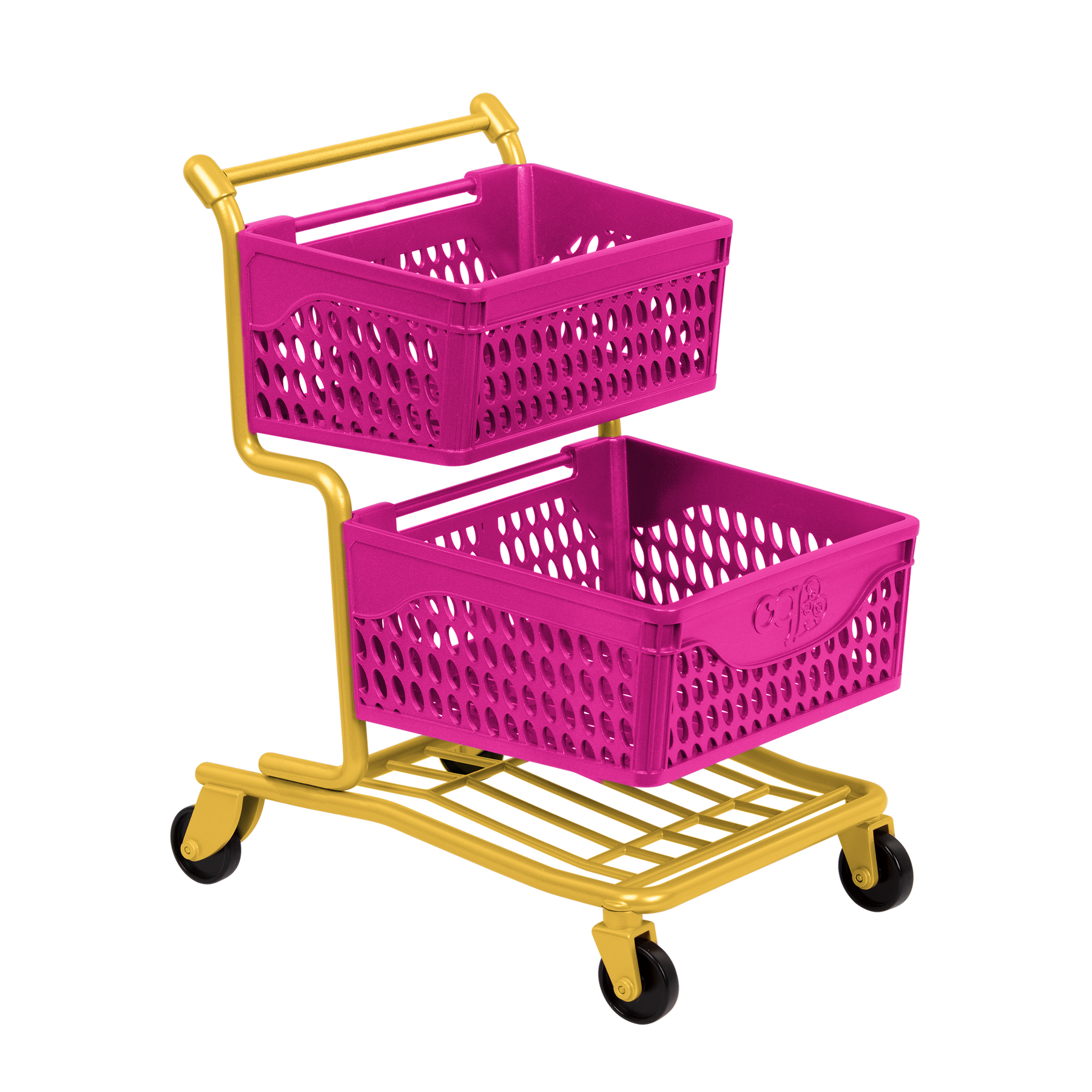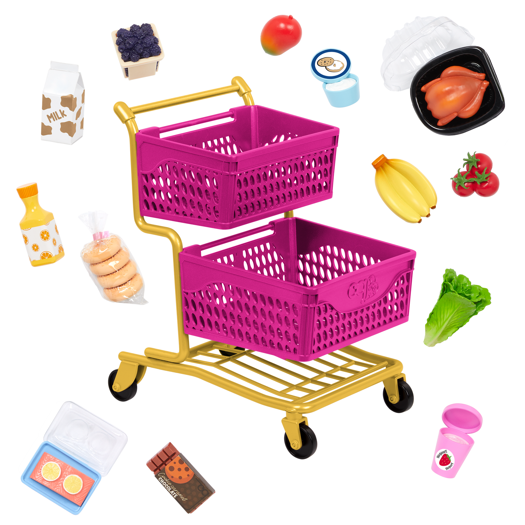 Take fun trips to the market with the Our Generation Grocery Day Shopping Cart! Visit each aisle and fill up the baskets with tasty favorites from the 5 food groups - including roasted chicken and salmon, bagels, fruits, and veggies. Don't forget the milk! The shopping cart features a bottom storage tray and 2 spacious baskets to hold every item on your little shopper's grocery list, with room for extras like orange juice and a caramel cookie chocolate bar. Opening container lids and bagel bag make pretend-play shopping extra engaging. And the wheels really roll to easily bring items from the grocer's to the kitchen! (Dolls sold separately)