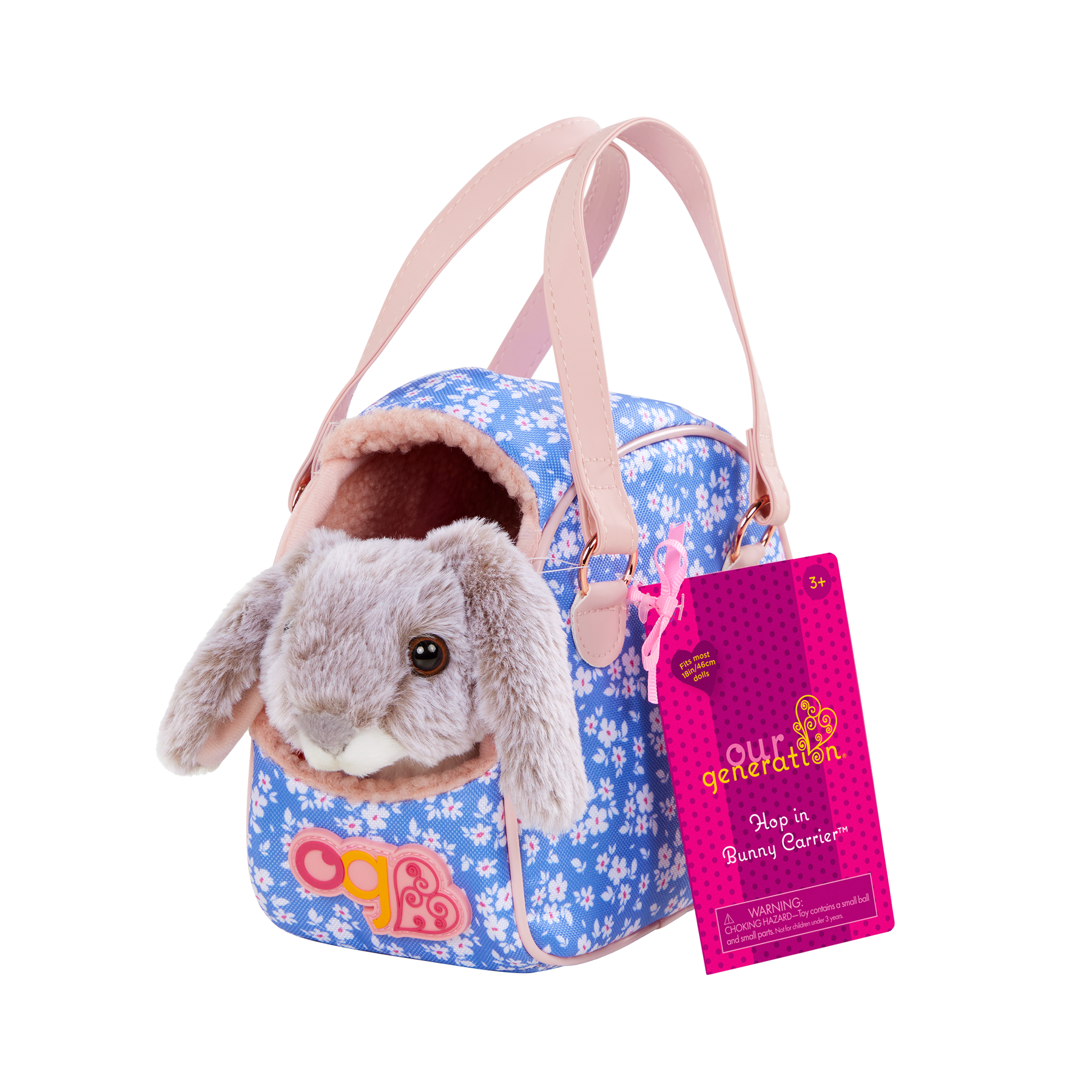 Animal fans can bring their best furry friend on fun adventures in style with the Our Generation Hop In Bunny Carrier, including a 6-inch pet bunny plush to welcome into their collection! The carrier comes in beautiful blue and features a lovely pink trim with a charming floral pattern, all lined with soft faux fur to keep bunny cozy. Plus, the double carrying straps make it easy for kids to showcase their favourite pet on every trip! Once they arrive, the included pet care accessories like a food bowl, chew toy, bundle of carrots, and a brush let kids explore imagination while nurturing a love for animals. Our Generation doll accessories make a great gift for kids ages 3 years old and up (small parts), encouraging them to create their own unique stories. Compatible with most 46 cm dolls, 6-inch stuffed animal toys, and accessories. Our Generation dolls sold separately.