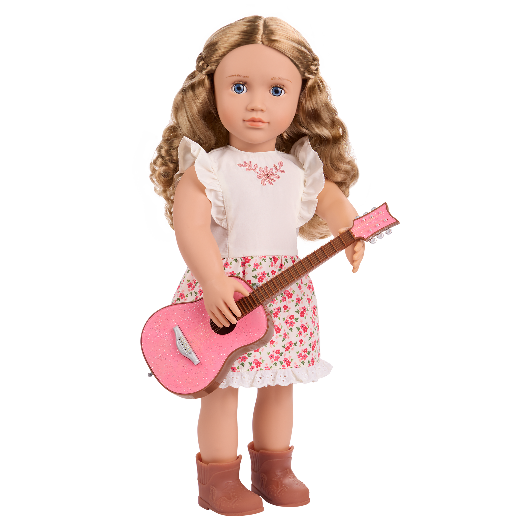 Enter a world of singing, dancing, and big dreams with Our Generation 46 cm doll Kelsie! This aspiring country star has a passion for performing, inviting everyone to kick up their boots and join in the fun as she plays her sparkly pink guitar! Kelsie has a huggable soft body and lifelike features to delight doll fans during playtime. Her expressive blue eyes open and close, and her long, dark-blonde hair is fun to style before she takes the stage. Kelsie shines in an easy-change floral dress and cute booties. And when it's time for dress-up, kids can give Kelsie even more fresh looks on her world tour! What will Kelsie's musical adventure look like? The story is up to you! Our Generation dolls make a great gift for kids ages 3+ (small parts). Compatible with most 46 cm dolls, doll clothes, and doll accessories.
