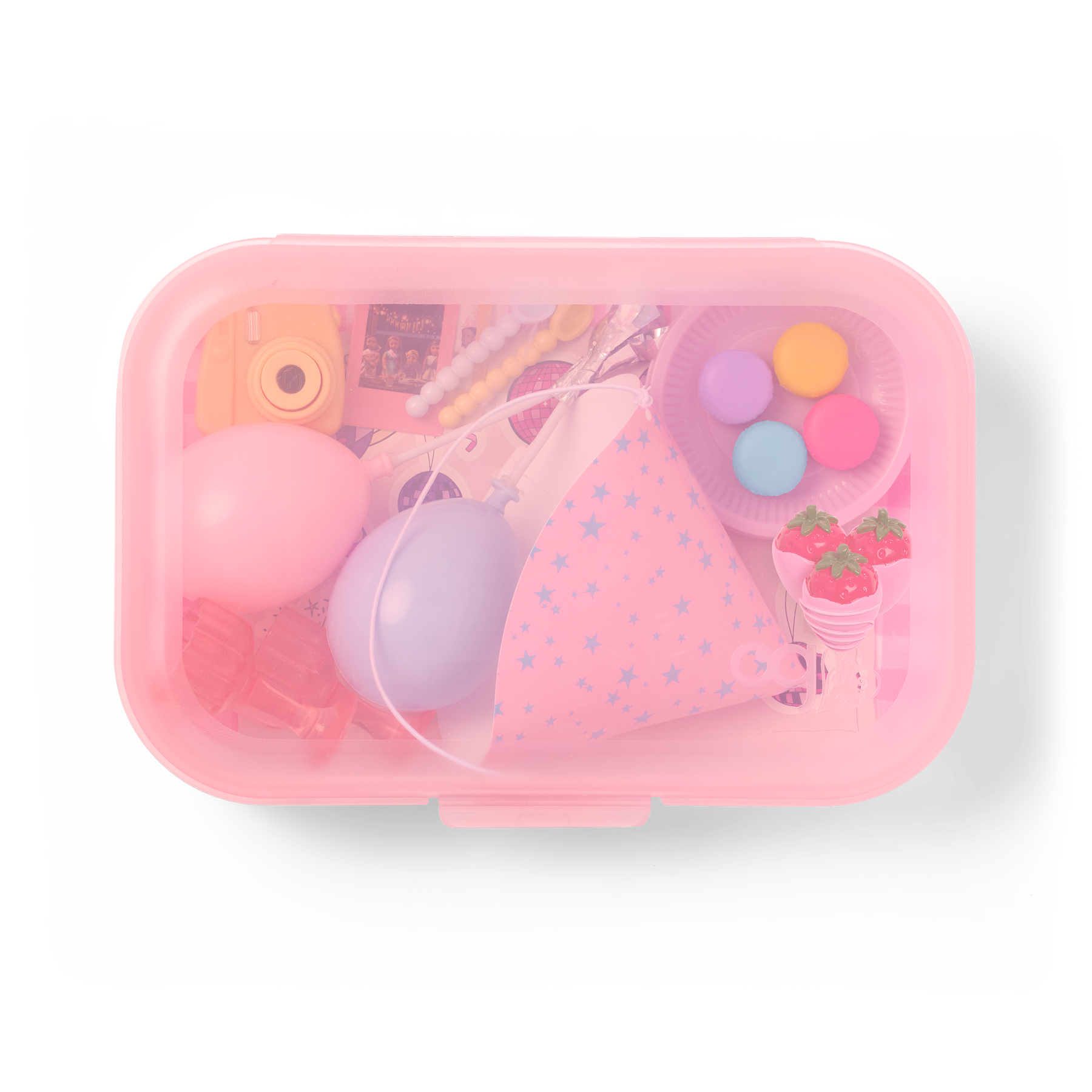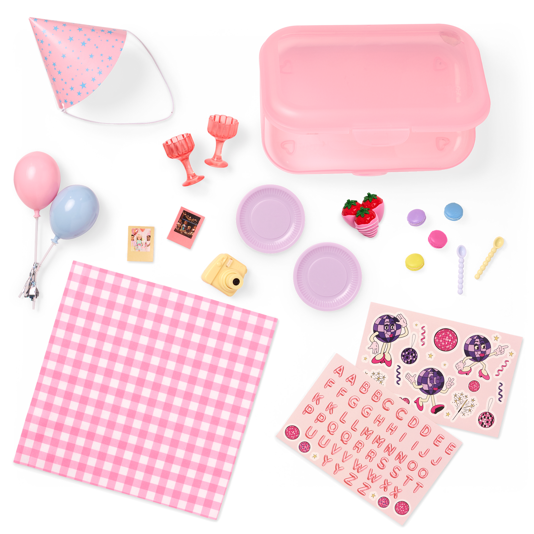Cue the confetti! The Our Generation Love to Party set lets kids play out surprise celebrations with their favorite 46 cm dolls! Featuring over 20 play pieces, kids will have everything they need to explore hours of storytelling, including fun birthdays, perfect picnics, and more. Plus, the pink storage case doubles as a kids' pencil case and comes with 2 sticker sheets for added decorating! Ready to party? Unpack the table setting accessories and treats to build a mini sweets table. The balloons set the perfect party background, while the camera and photos let partygoers capture every special moment. Now grab the party hat to crown the birthday star! Every party is a blast with Our Generation! Makes a great gift for kids ages 3+ (small parts), encouraging them to imagine their own unique stories. Our Generation dolls sold separately.