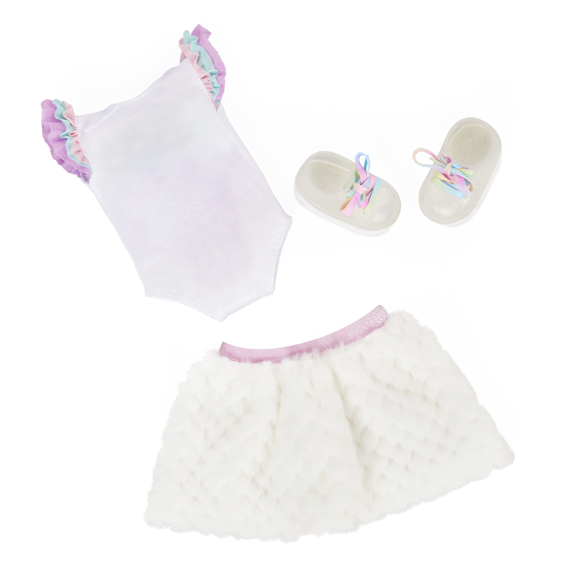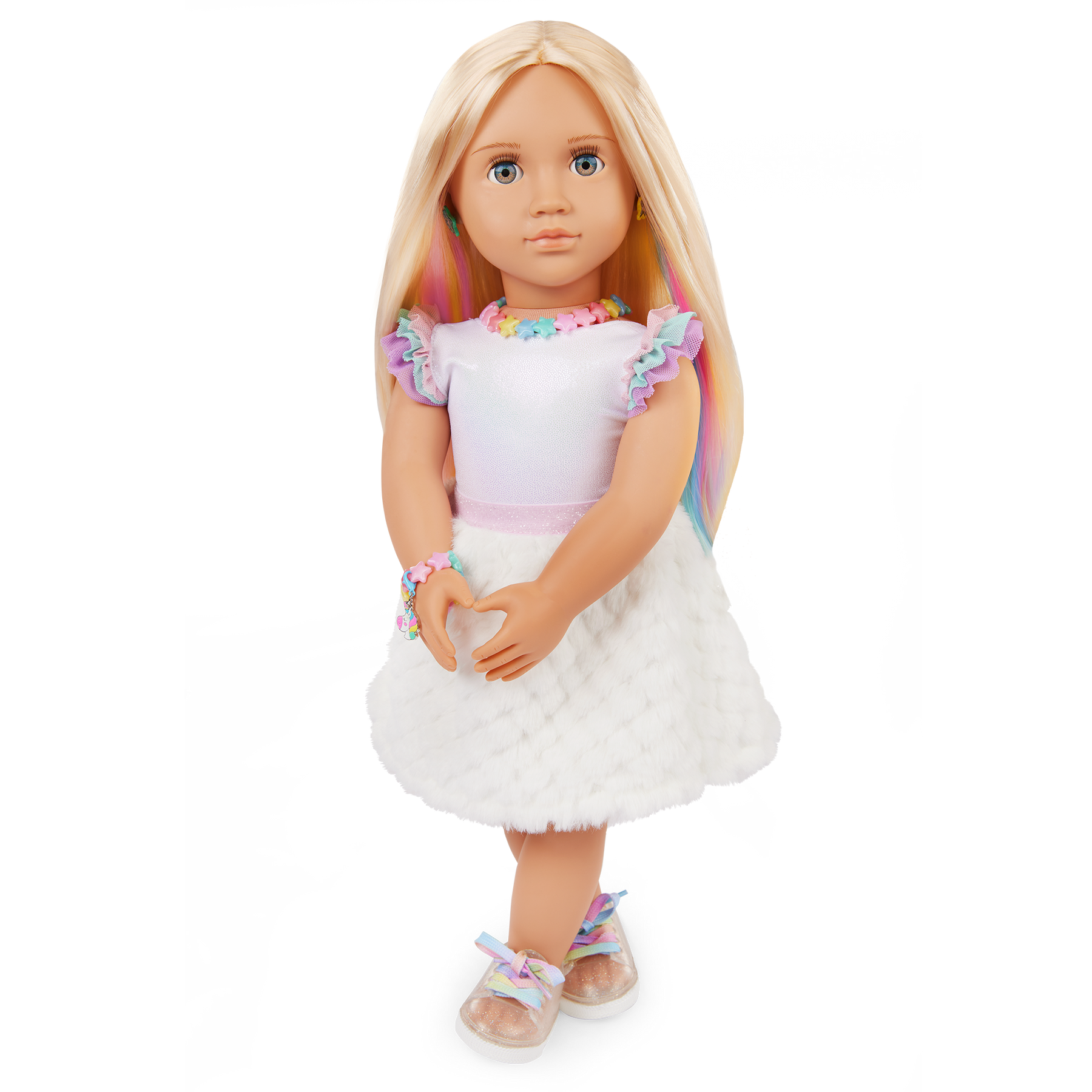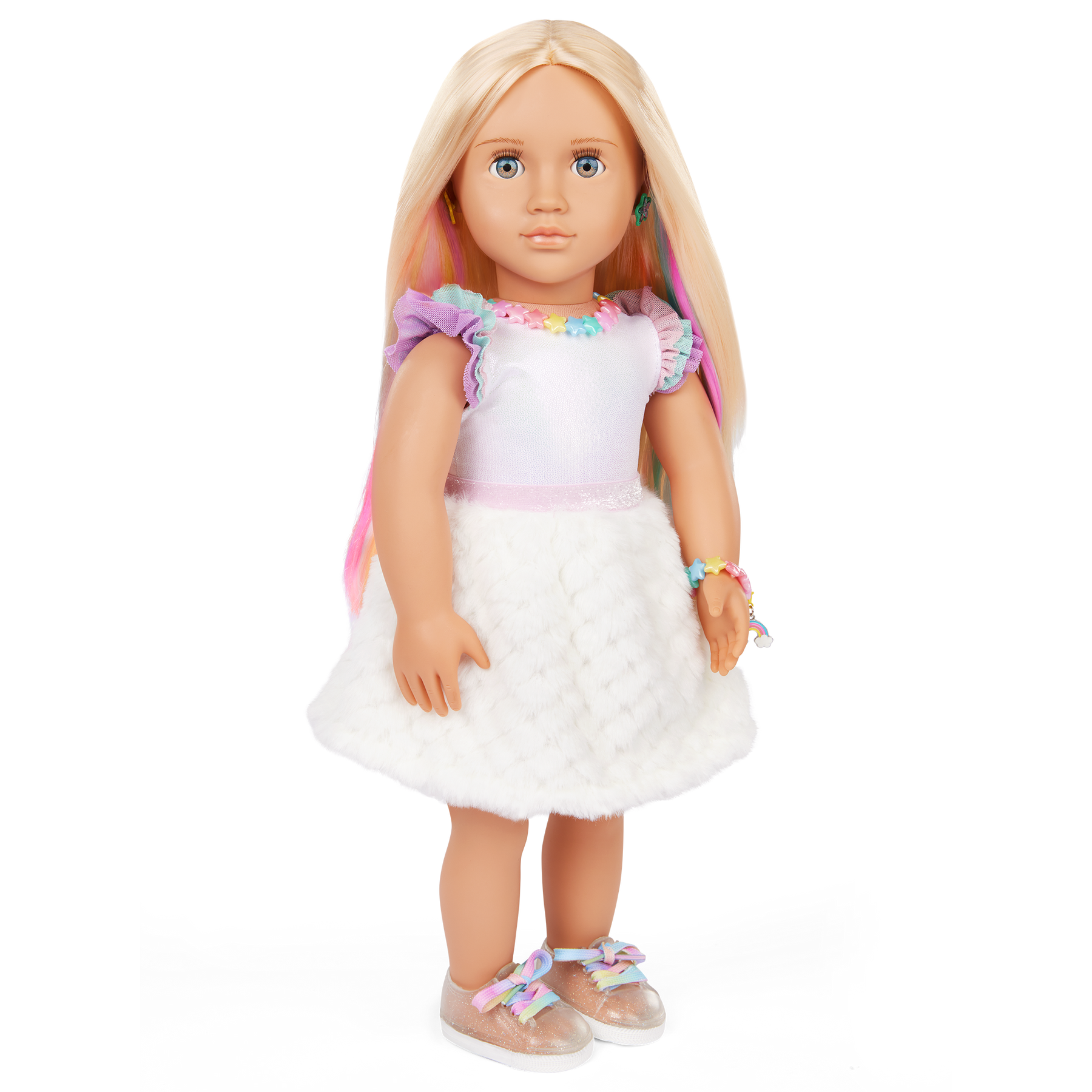 Mix, match, and create dazzling jewelry styles with Our Generation 46 cm doll Mariana! With so many ways to sparkle and shine, kids can set their favorite trends with colorful rainbow jewelry and a sweet selection of charms. The included jewelry box features 3 clip-on charms that kids can attach to the bracelets and necklace. Plus, they can easily swap the charms or pair them together to showcase their personal style! Mariana has a huggable soft body and lifelike details that will delight doll fans during playtime. Her light-blue eyes open and close, and her long blonde hair has peekaboo highlights to brighten every hairstyle! She also has pierced ears to wear her earrings, so kids can add even more flair to any look! She wears a cute leotard, a faux-fur skirt, and shoes with rainbow laces. When it's time for dress-up, her outfit has easy-open closures to quickly put on and remove as kids explore imagination and self-expression. Our Generation dolls make a great gift for kids ages 3+ (small parts), encouraging them to dream up their own unique stories.