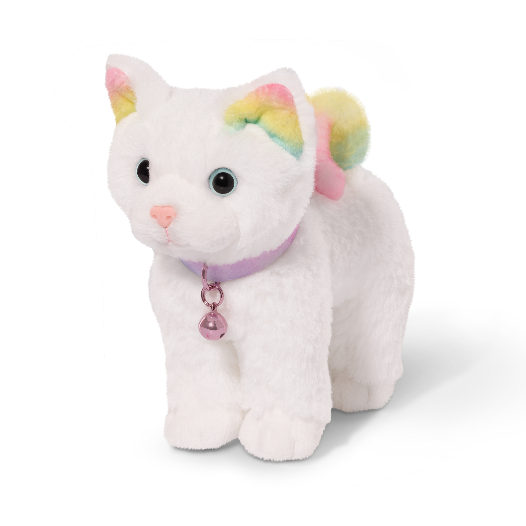 Give cat lovers a colorfully cute surprise with the Our Generation Turkish Angora rainbow kitten! Known by their elegant appearance, this adorable cat plush features breed-specific details but with a colorful twist. Soft, white plush fur invites cuddly hugs, while its striking rainbow tail and ears highlight kitty's playful side! Details like bright blue eyes, a pink nose, and a bell collar add to its dazzling look. Plus, the rainbow kitten is fully posable! Kids will love the interactive design as they bend the kitten's legs to sit, stretch, and pose during storytelling. Comes in packaging shaped like a cozy cat house, providing a sweet spot to "paws" and dream. The Our Generation Turkish Angora rainbow cat plush measures 6 inches tall, perfectly sized for kids who love bringing their pet companion on the go. Compatible with most 46 cm dolls, stuffed animal toys, pet collections, and doll accessories. Our Generation dolls sold separately.