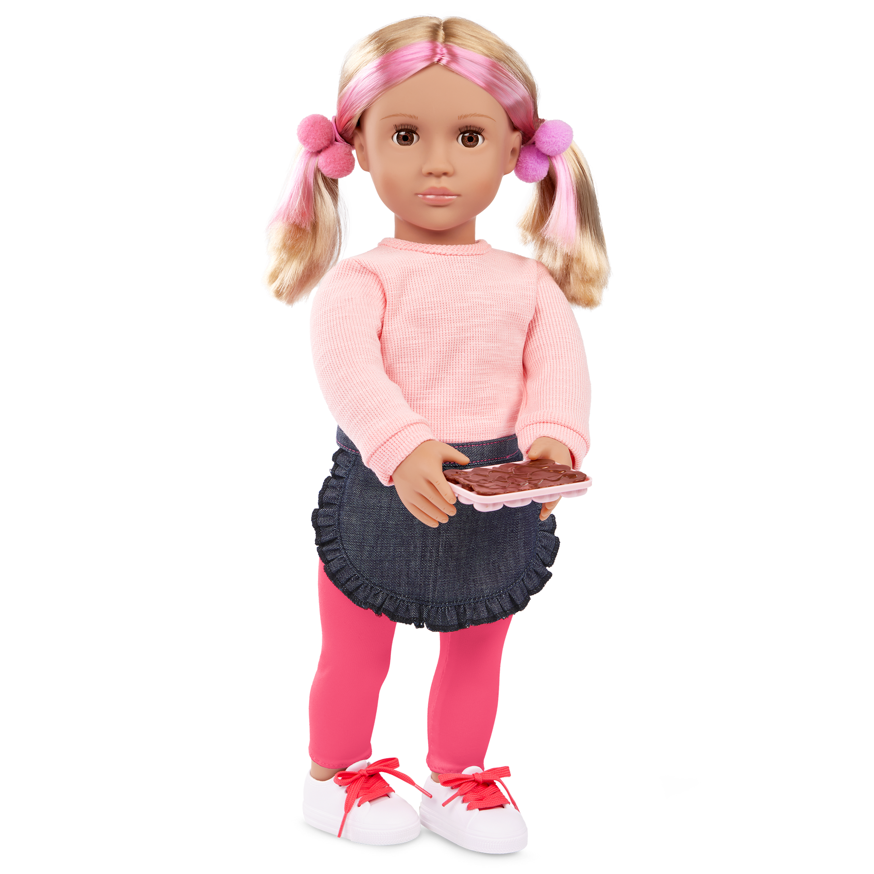 Making treats is ever so sweet with the Our Generation Ready for Chocolate set for 46 cm dolls! Perfect for dessert making and party prepping, dress up your doll baker with the apron and use the accessories to whip up a batch of scrumptious chocolate. This set includes a mixing bowl, piping bag, chocolate baking shape, and a strawberry topping to put the finishing touches on any dessert! And the best part? The mixing bowl smells like yummy chocolate to delight little chocolate lovers! Once the baking is done, kids can use the clothing items as a standalone outfit or mix and match with other Our Generation doll clothes to explore more fun looks. Our Generation doll accessories make a great gift for kids ages 3+ (small parts), encouraging them to create their own unique stories. Compatible with most 46 cm dolls, doll clothes, and accessories. Our Generation dolls sold separately.