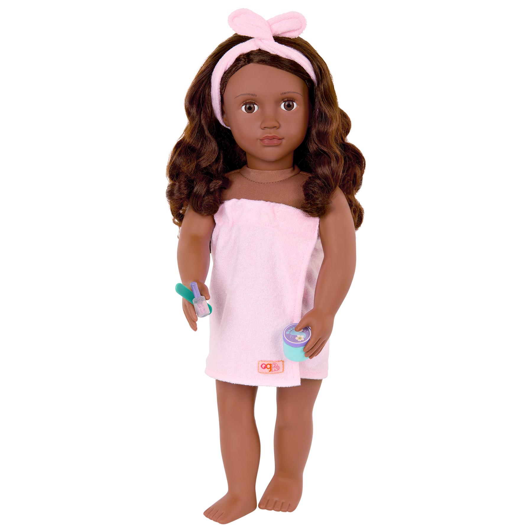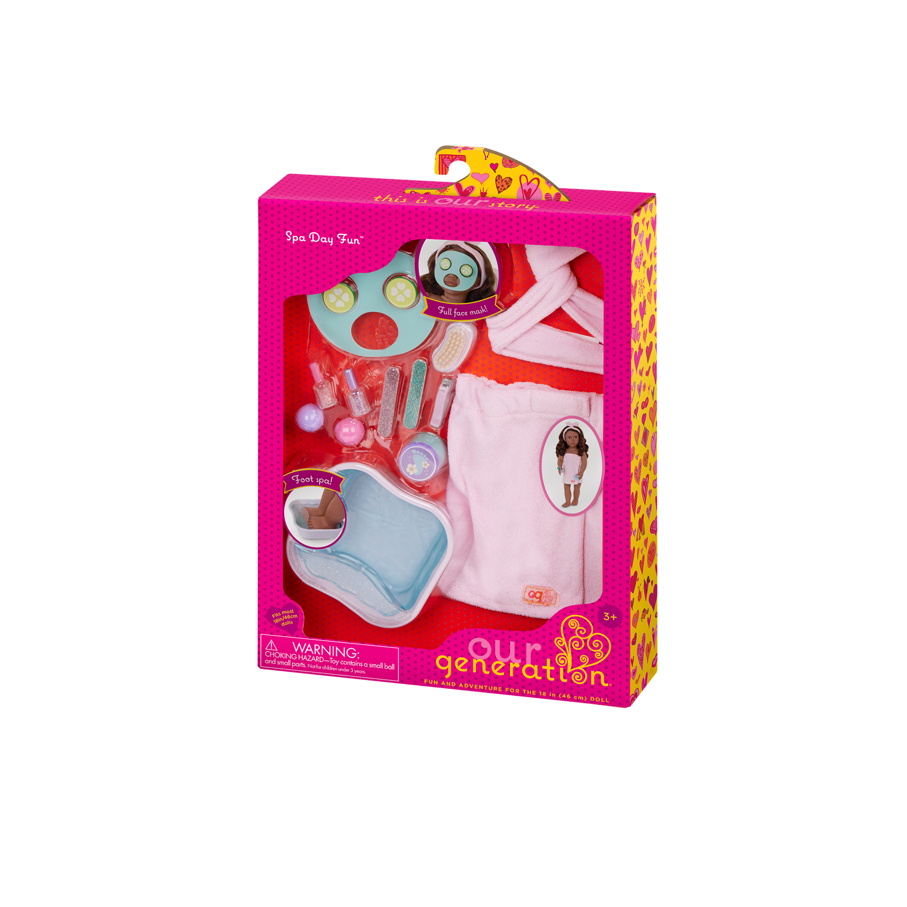 Get your spa day on with the Our Generation Spa Day Fun set for 46 cm dolls! Pamper your favourite dolls with a headband and towel wrap as you apply a soothing cucumber face mask. Don’t forget the cucumber slices on the eyes. The fresher, the better! And nothing is more relaxing than a nice long foot spa! Dip your doll's toes into the foot bath and let the relaxation begin! Themed accessories like bath bombs, nail files, nail polish, nail clipper, jar of cream, and foot brush open up lots of self-care and sweet storytelling. Makes a fun addition to doll care sets and collections. Our Generation doll accessories are a great gift for kids ages 3+ (small parts), encouraging them to imagine their own unique stories. Our Generation dolls sold separately.