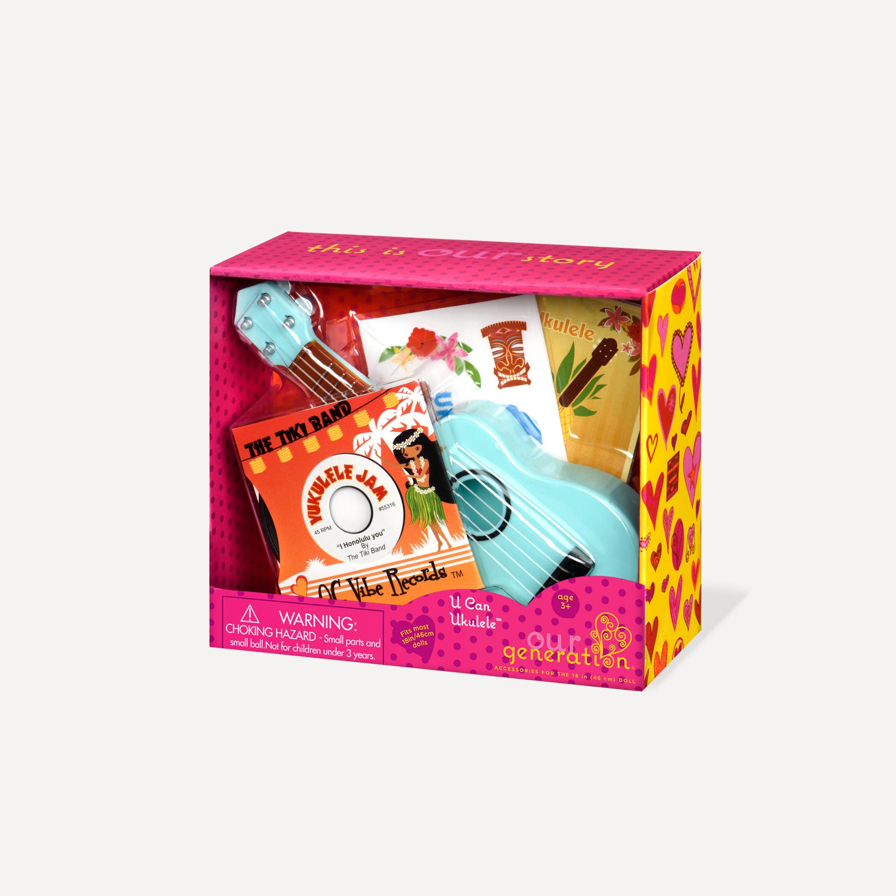 Give your doll an introduction to musical fun with the Our Generation U Can Ukulele Set. The instrument fits into the hands of 46 cm dolls and has a bright blue colour. Also included are a miniature record of tropical island music inside a sleeve and a book of musical notes. This collection of 46 cm doll accessories also has a sheet of stickers to decorate the ukulele or other surfaces with images such as dolphins, a pineapple, and a surfboard! (Dolls sold separately)