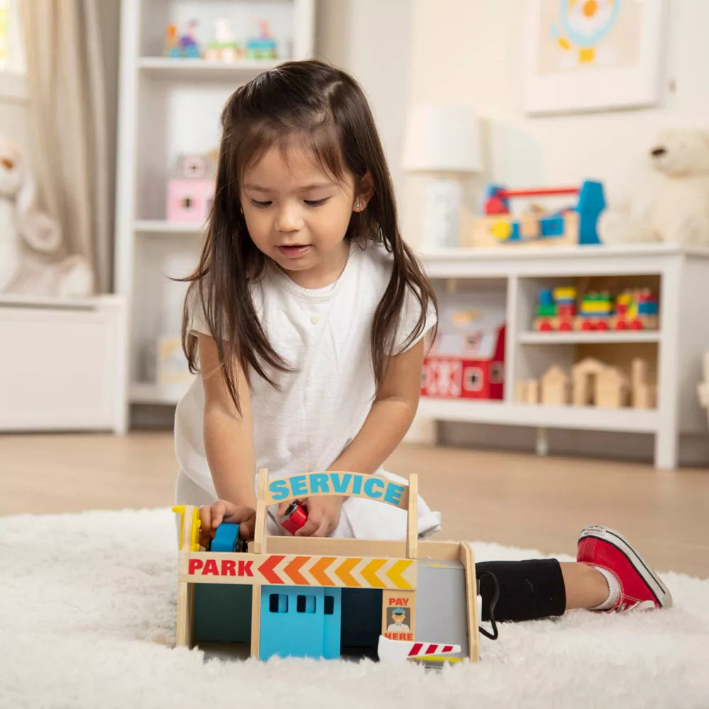 his all-in-one service station is truly full service! Park the two included wooden cars in the parking garage with movable elevator or pull them through the car wash. Don't forget to fill up at the gas pump before getting the cars serviced at the garage with sliding doors. This play set for ages 3+ encourages fine motor skills, hand-eye coordination, problem solving, and imaginative play. The built-in handle makes it the perfect take-along toy!