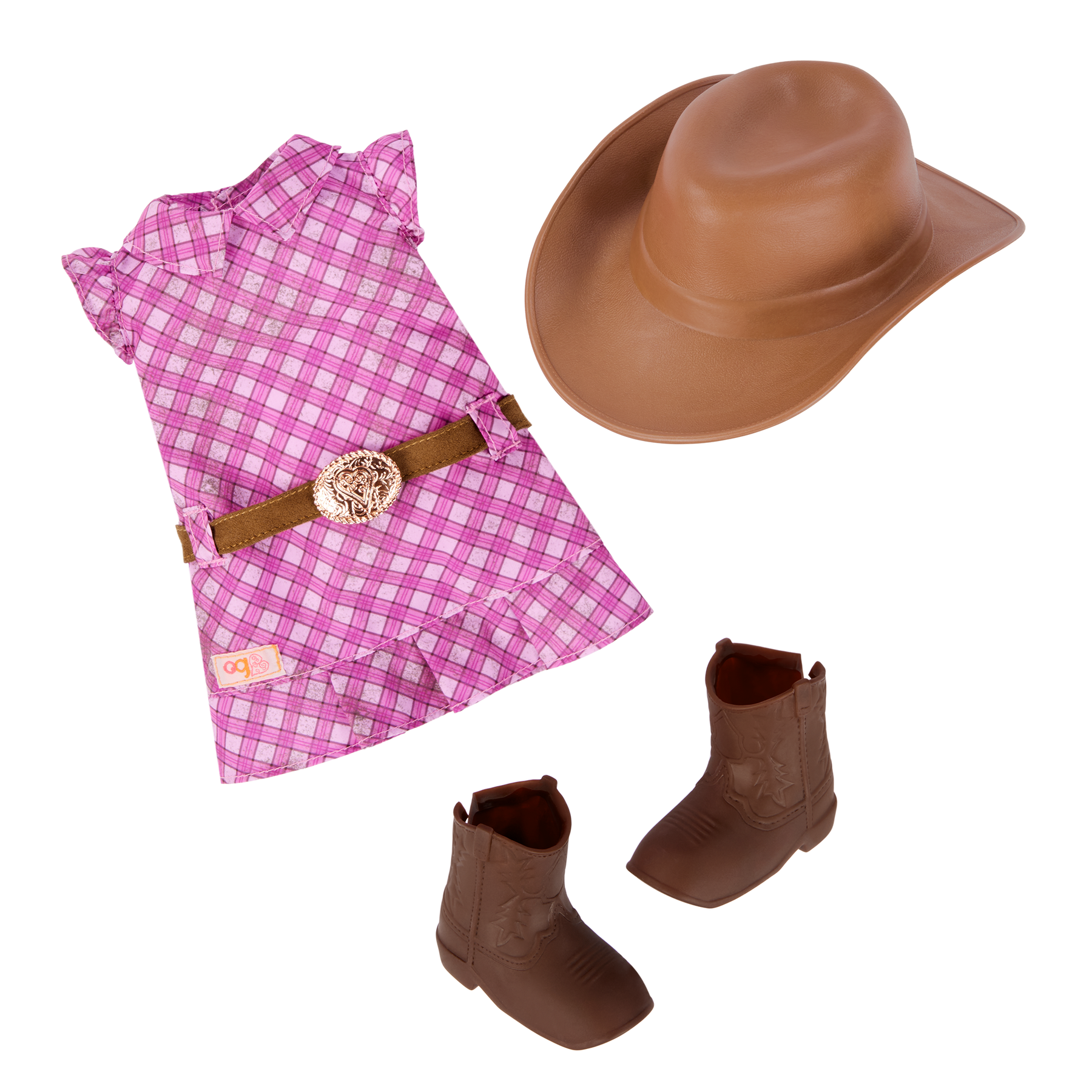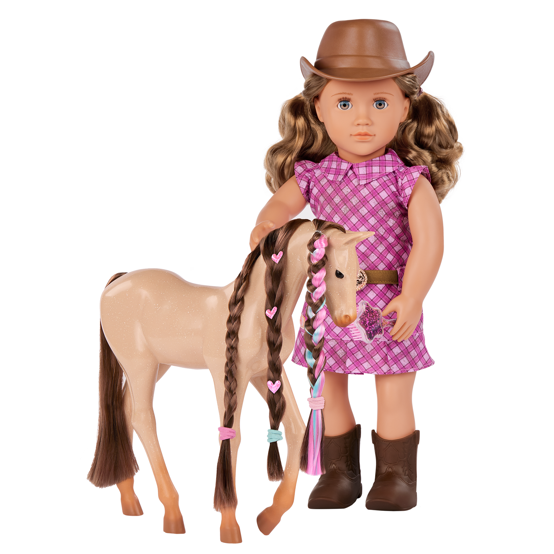 Gallop into giggles and glam with Our Generation 46 cm doll Callie, including her stylish foal! Her horse pal has a long brushable mane and braid-ready tail for kids to accessorize on every trail. Set fun trends with the colourful hair extension and hair charms for a dash of enchanting charm. This set also comes with 3 hair elastics for kids to complete every look that ties into their imagination! Callie has a huggable soft body and lifelike details that will delight doll fans during playtime. Her beautiful light-blue eyes open and close, and her wavy dark-blonde hair is fun to style in many ways. When it's time for dress-up, her stylish plaid dress has easy-open closures to quickly put on and remove. So kids can mix, match, and explore more cute looks! Our Generation dolls make a great gift for kids ages 3+ (small parts), encouraging them to create their own unique stories.