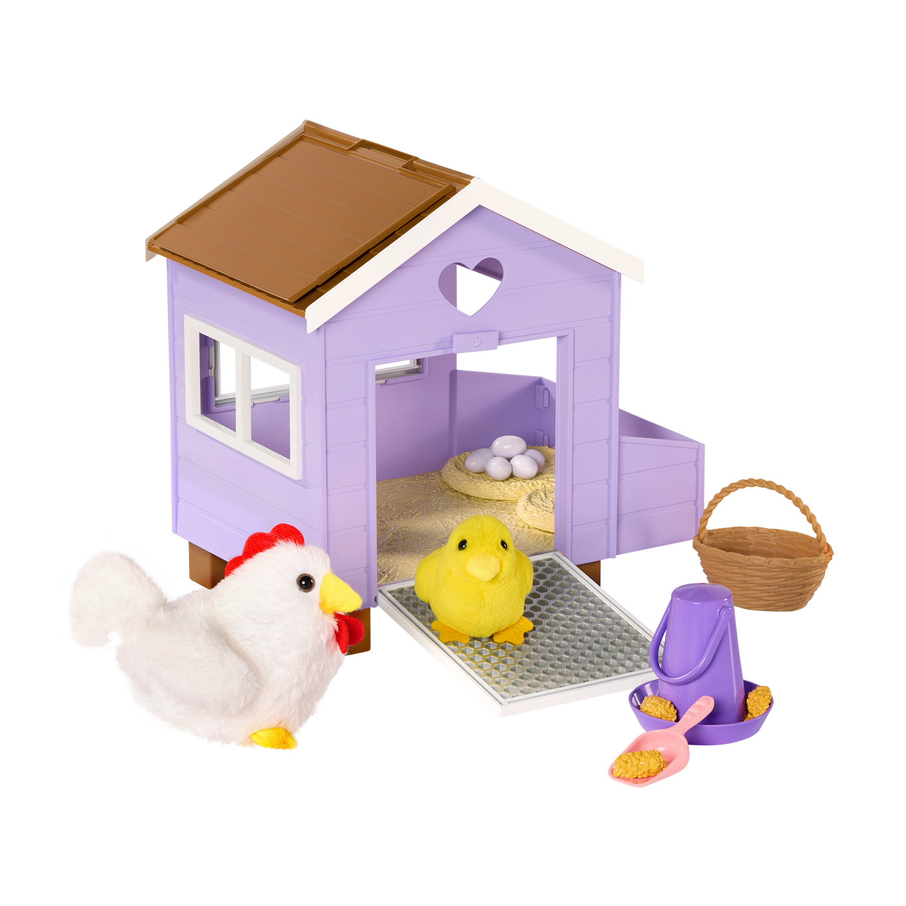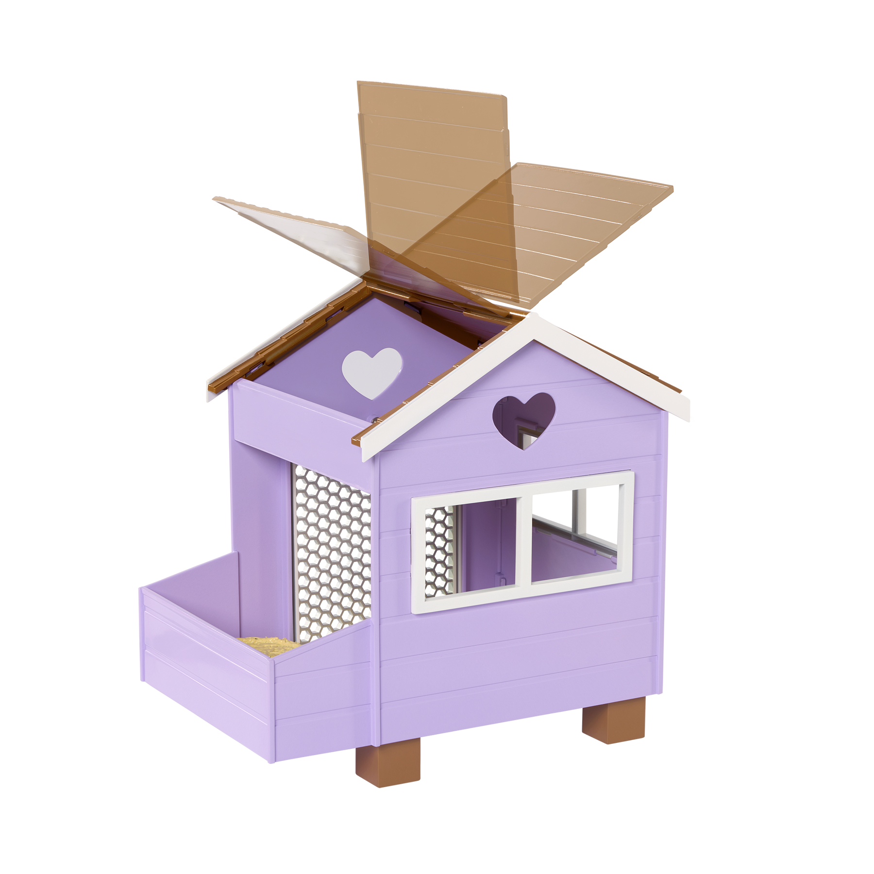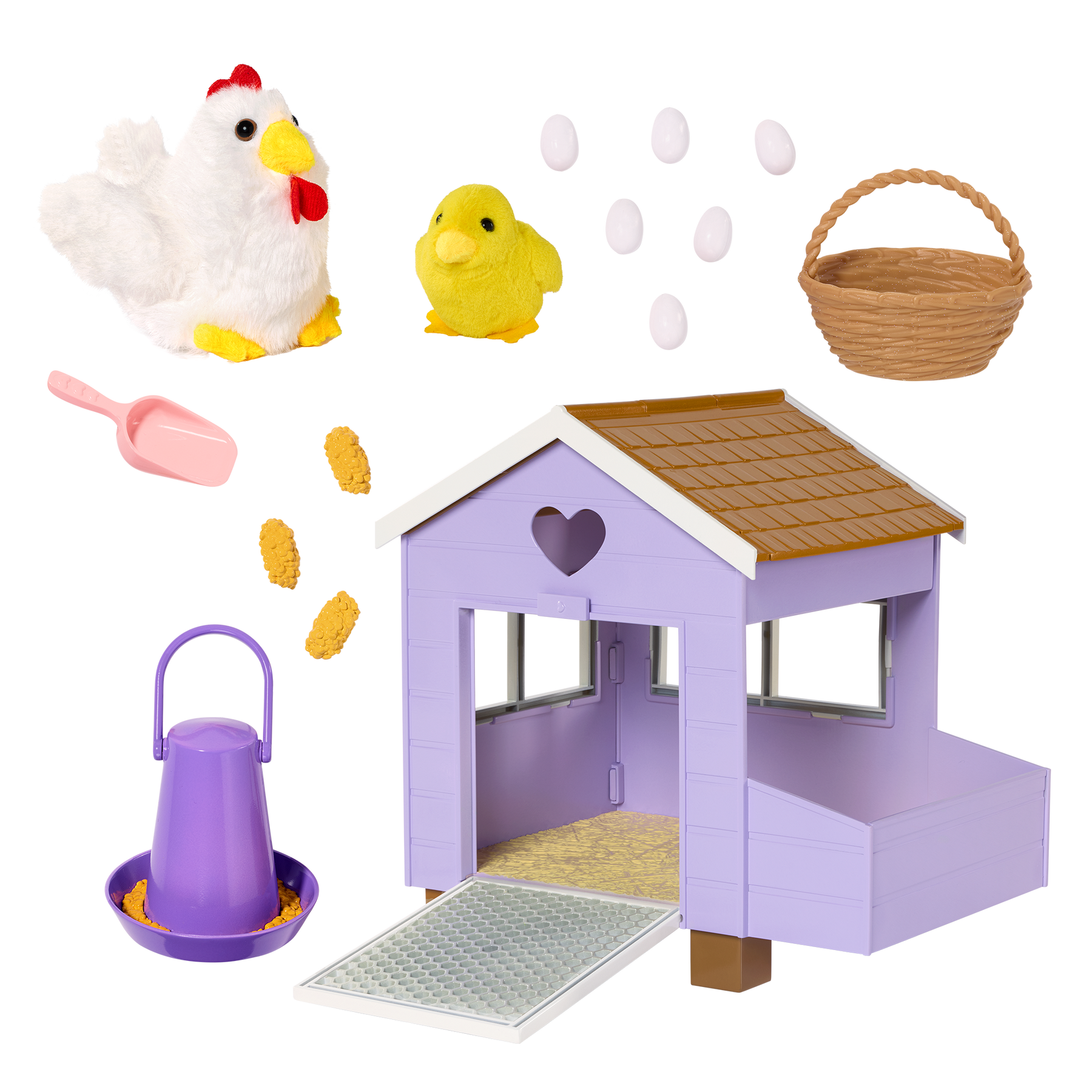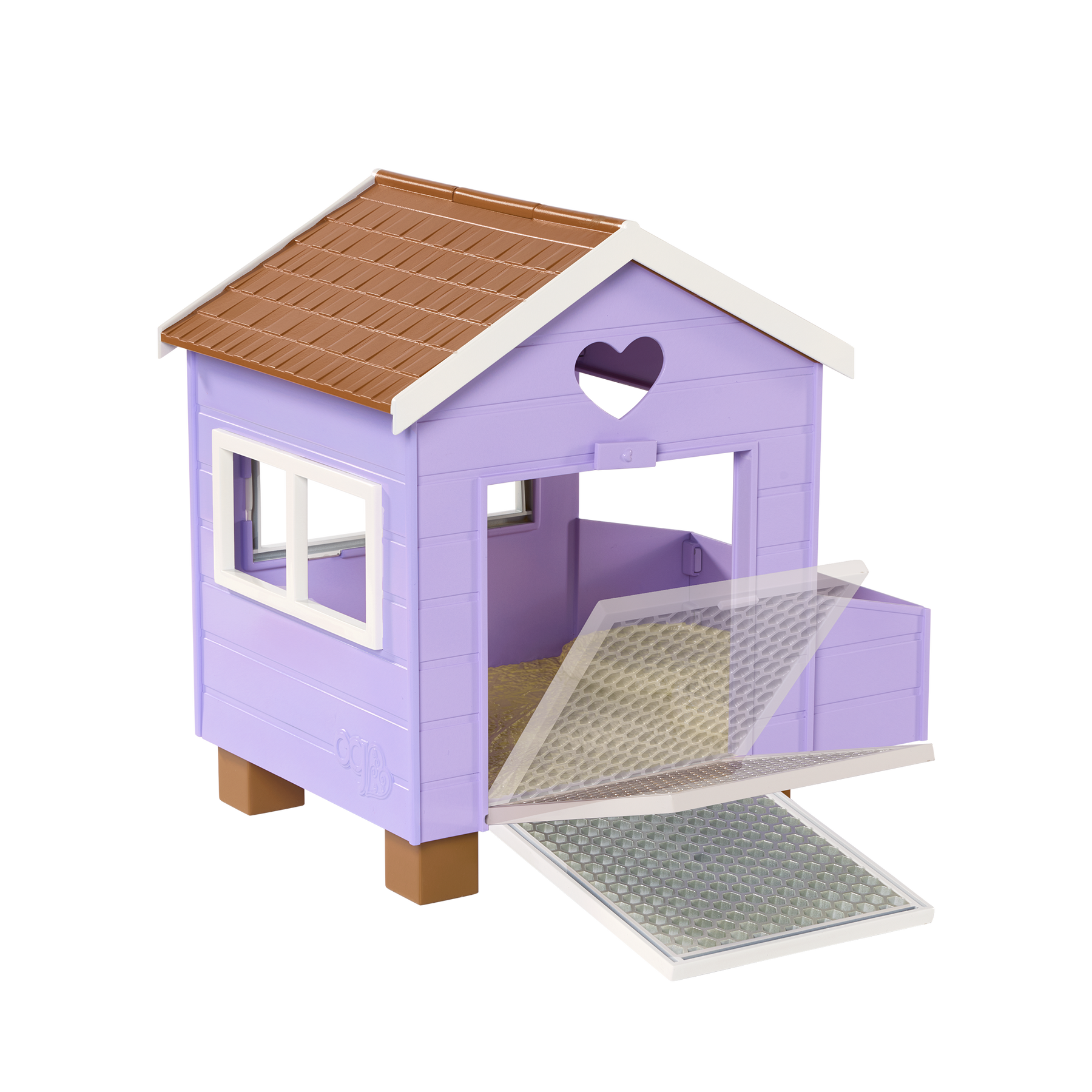 Rise and shine, it's farming time with the Our Generation Chicken Coop Playset for 46 cm dolls! This charming henhouse features functional details like an opening gable roof and a flip-down ramp for the animals to waddle in and out. Inside, kids will find a cozy hay-like design with nesting spots for each plushie. Plus, kids can help the chicken "lay" eggs by placing them inside the plushie as they play out the exciting role of a farmer! A feeder and scooper let young ones care for their feathery friends every day, while the carrying basket adds even more fun for collecting eggs and chicken feed clusters. Perfect for enhancing their doll collection, the Our Generation Chicken Coop Playset makes a great gift for kids ages 3 years old and up (small parts), encouraging imagination and nurturing a love for animals. Our Generation dolls sold separately.