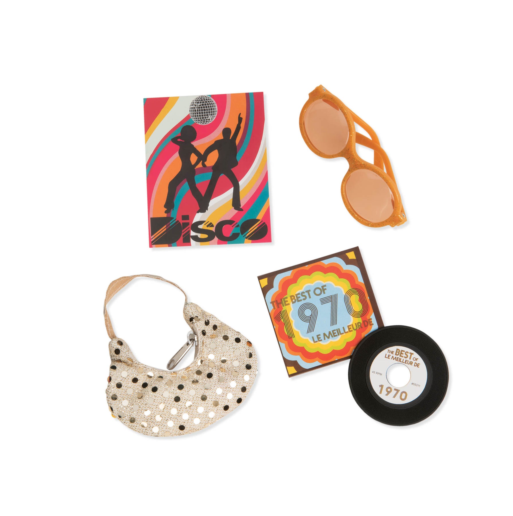 We have the beat and our feet were made for dancing. The Our Generation Disco Beat accessory playset sounds oh-so-sweet. Get your turntable ready and put on your bell bottoms and fringe - prepare for a disco dance party. This playset comes with a toy record and vinyl sleeve, a disco poster, a glittery bag and cool sunglasses. Your 46 cm doll can enjoy the best of that 1970s music groove with these accessories. (Dolls sold separately)