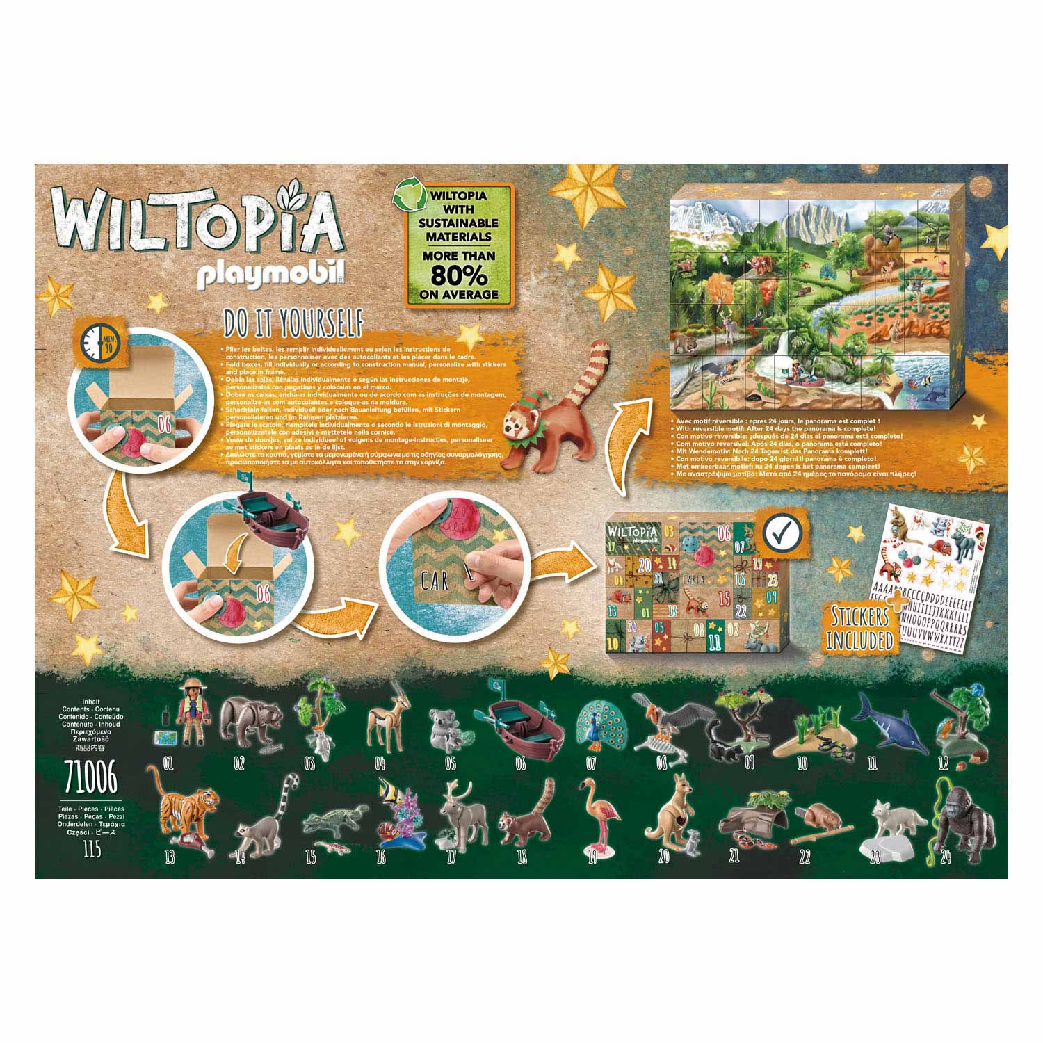 Playmobil Advent calendar to fill and design yourself with the included sticker sheet (e.g., the child's name). With a reversible motif on the boxes: after 24 days, the animal panorama is complete!