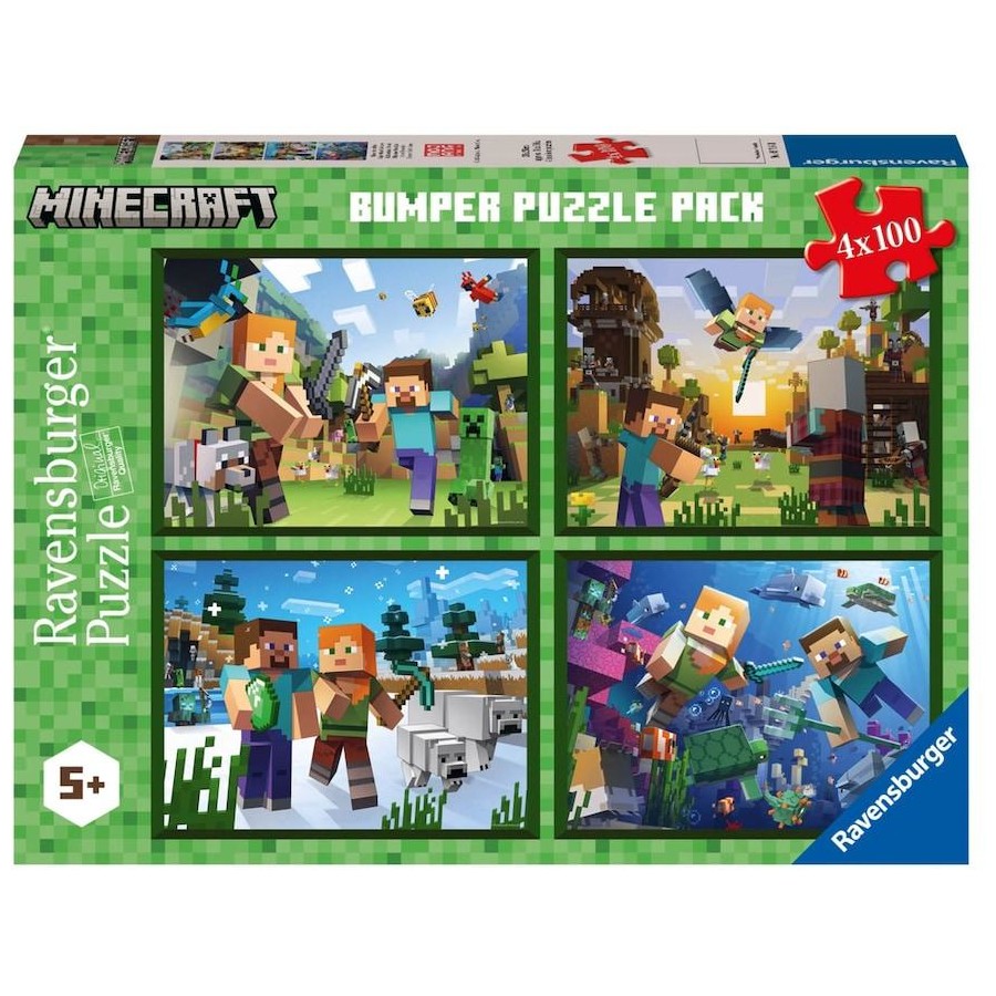 The Ravensburger Minecraft Bumper Puzzle Pack inclues 4 vibrant Minecraft-themed jigsaw puzzles in one pack! Each detailed scene showcases a different area of the game, following characters Steve and Alex as they explore this colourful - and sometimes dangerous - world! Ravensburger's bumper pack puzzle sets are crafted with premium quality materials. Each puzzle measures 36 x 26cm when complete.