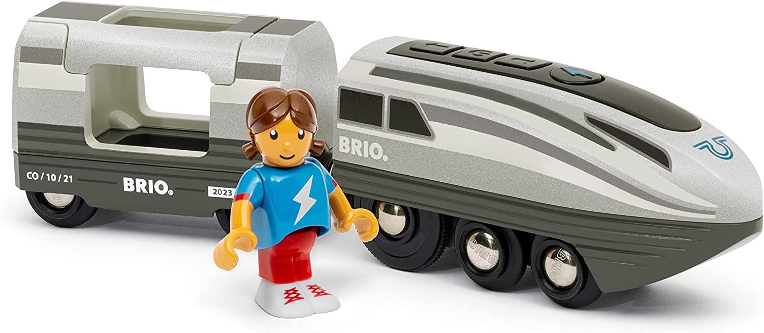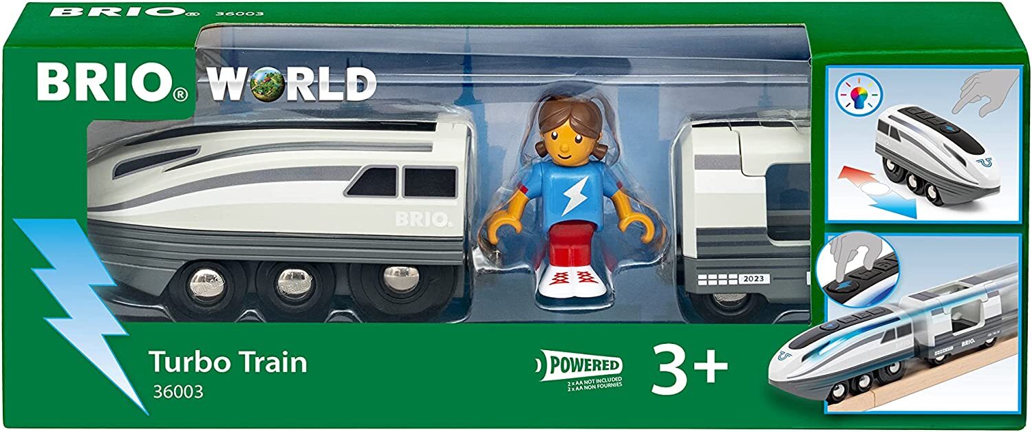 Crank up the speed with the BRIO Turbo Train. Simply press the big turbo button and this battery-operated toy train doubles its speed, making it the fastest train in BRIO World. The turbo boost lasts for 5 seconds and as it runs at top speed, the white lights along the sides of the engine change to a cool blue. This futuristically designed engine also includes a passenger wagon with enough space for one lucky passenger to enjoy an exhilarating ride to remember.