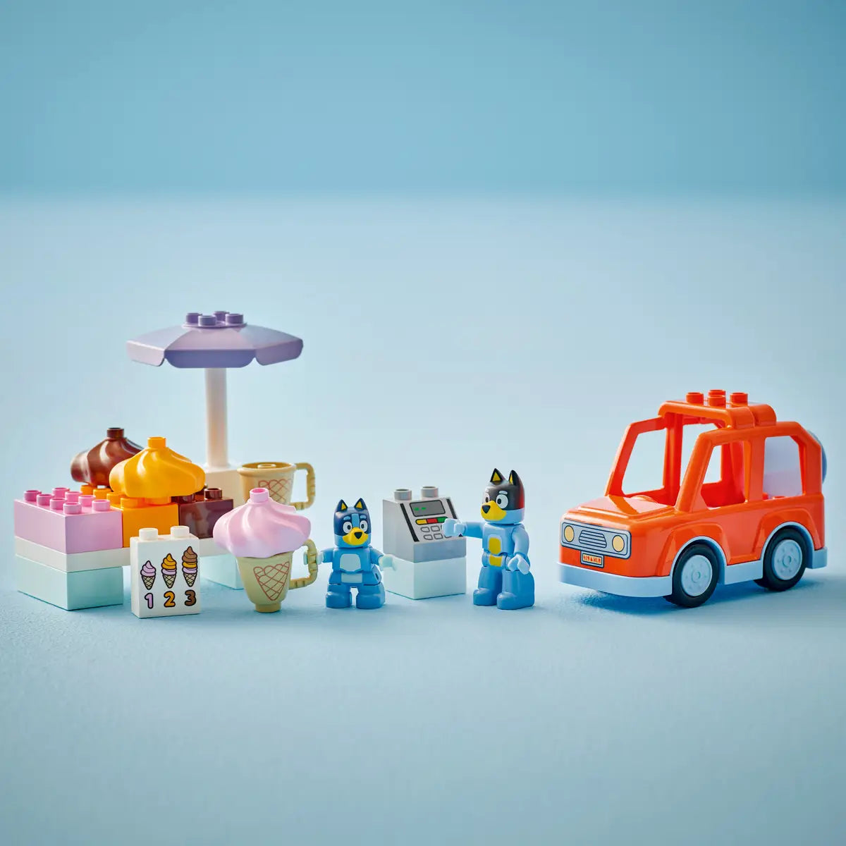 - Ice cream stand and vehicle playset inspired by the Bluey TV show – Transport preschoolers to the fun world of the Heeler family with the LEGO® DUPLO® Bluey Ice Cream Trip with Bluey toddler toy